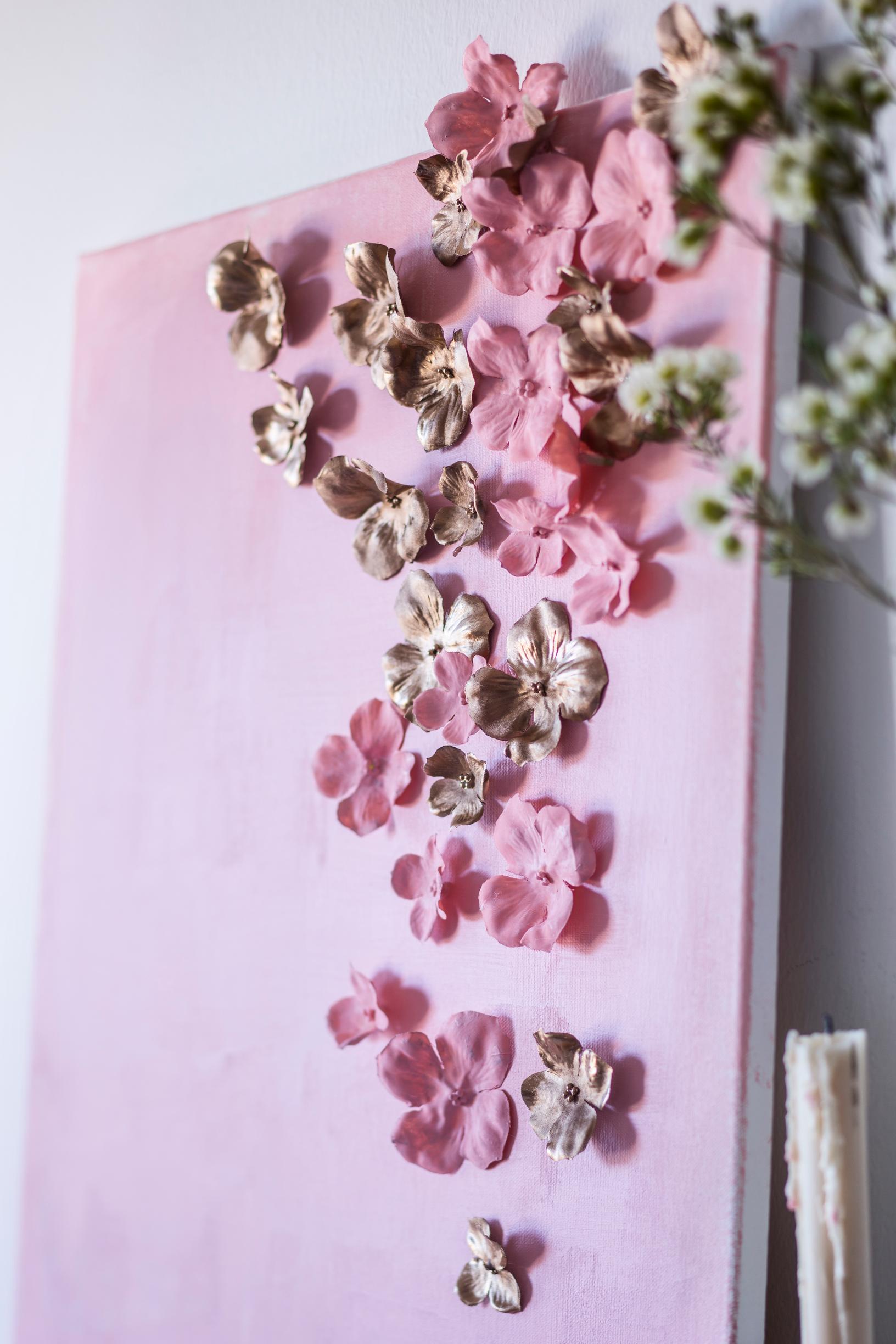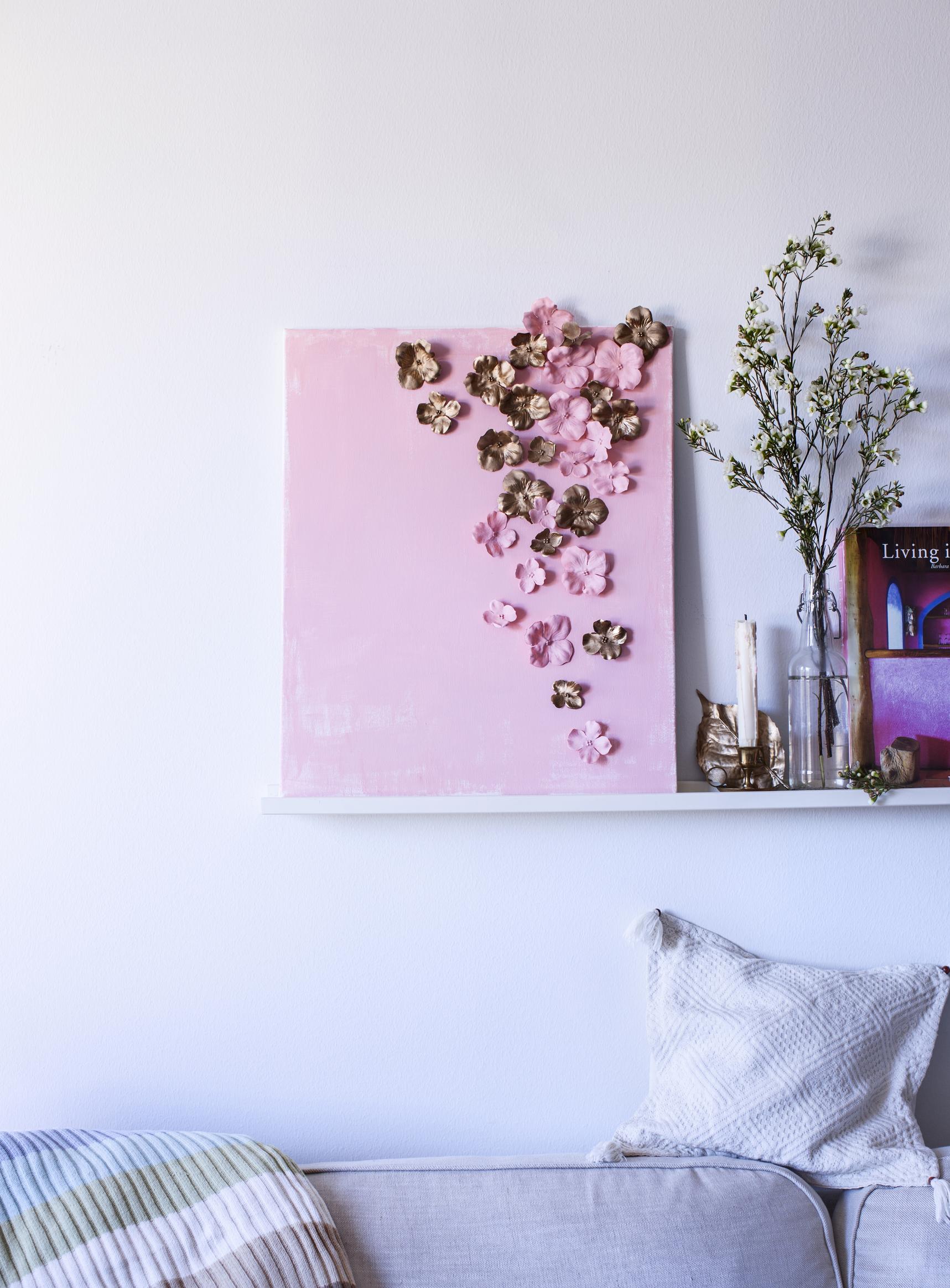 Tee itse kodin kaunein sisustustaulu, joka sopii varmasti sisustukseesi. Maalaa tausta suosikkivärilläsi ja jatka taulua kolmiulotteiseksi efektivärisillä kukilla. Tässä taulussa hehkuu kesän hempein vaaleanpunainen.