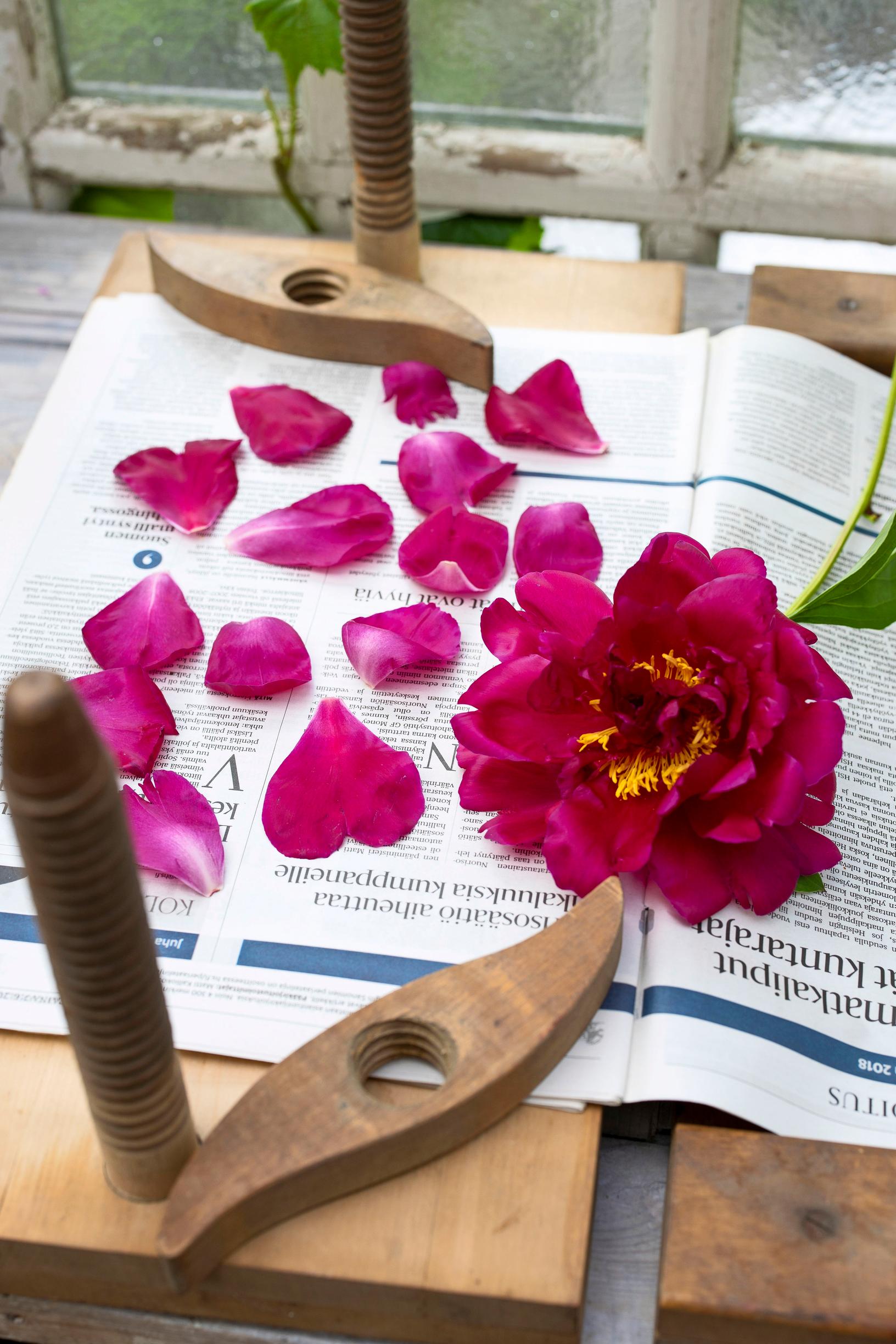 Prässääminen tallettaa pionin terälehdet ja muut litteät kasvinosat niin kortteihin kuin kasvioihinkin. Orvokit ja muut syötävät kukat ilahduttavat prässättyinä myös tarjoiluvatien ja annosten koristeina.