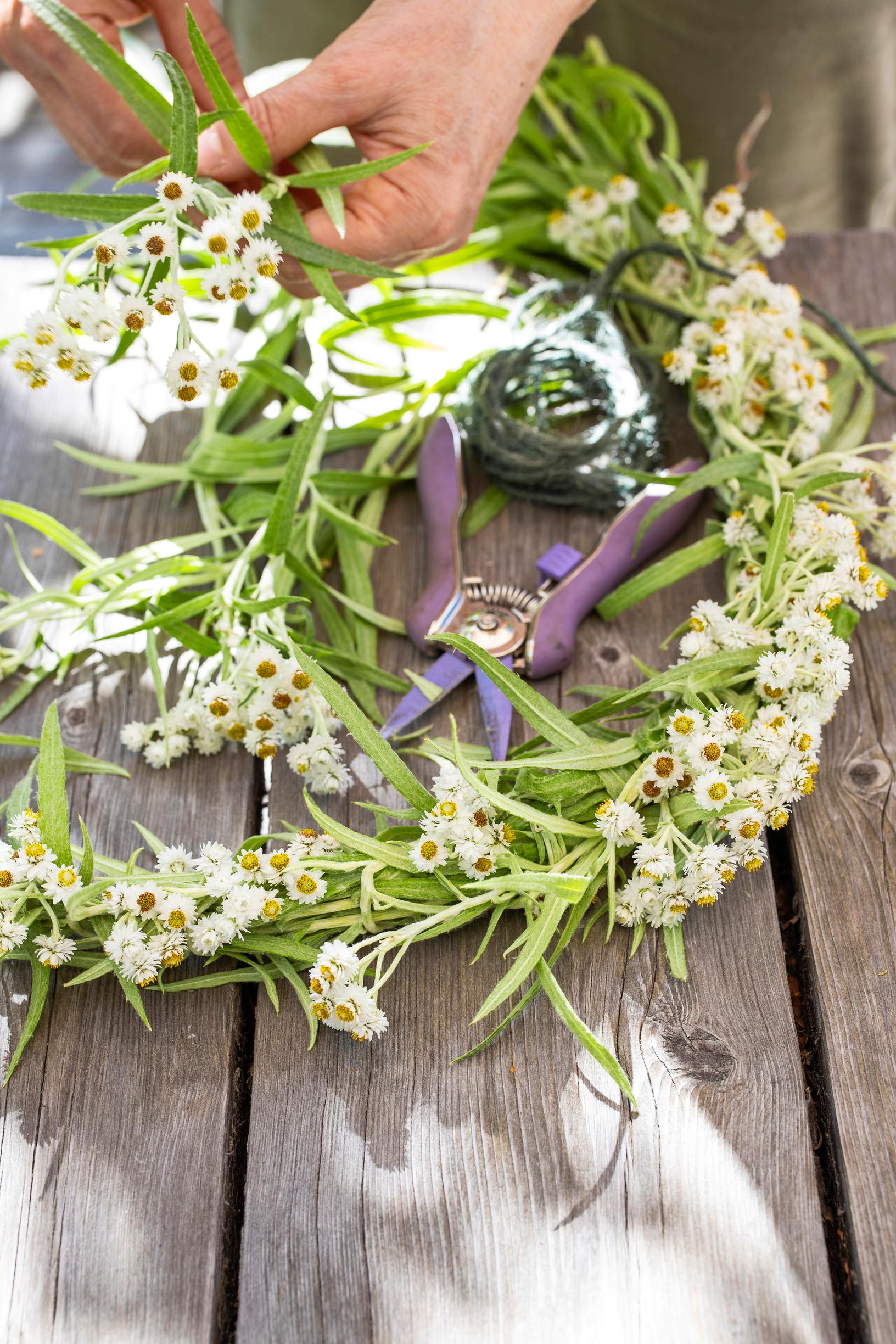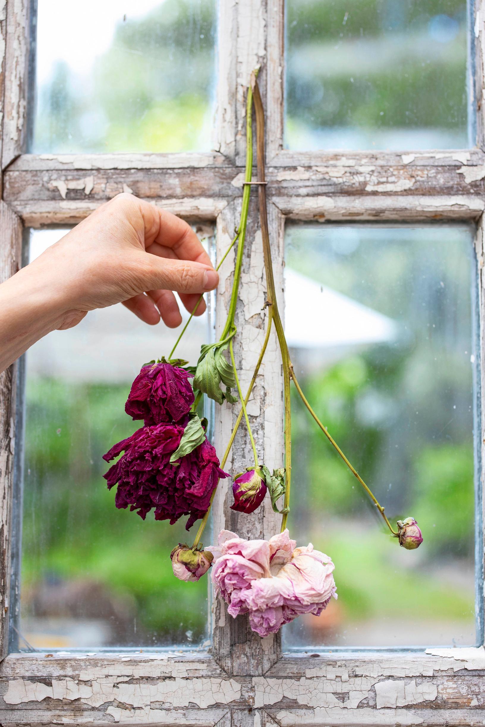 Alaspäin roikottaminen on vaivattomin kuivaustapa kasveille. Ilmavat kimput ja niput kuivuvat parhaiten – tiivis kimppu homehtuu herkästi.