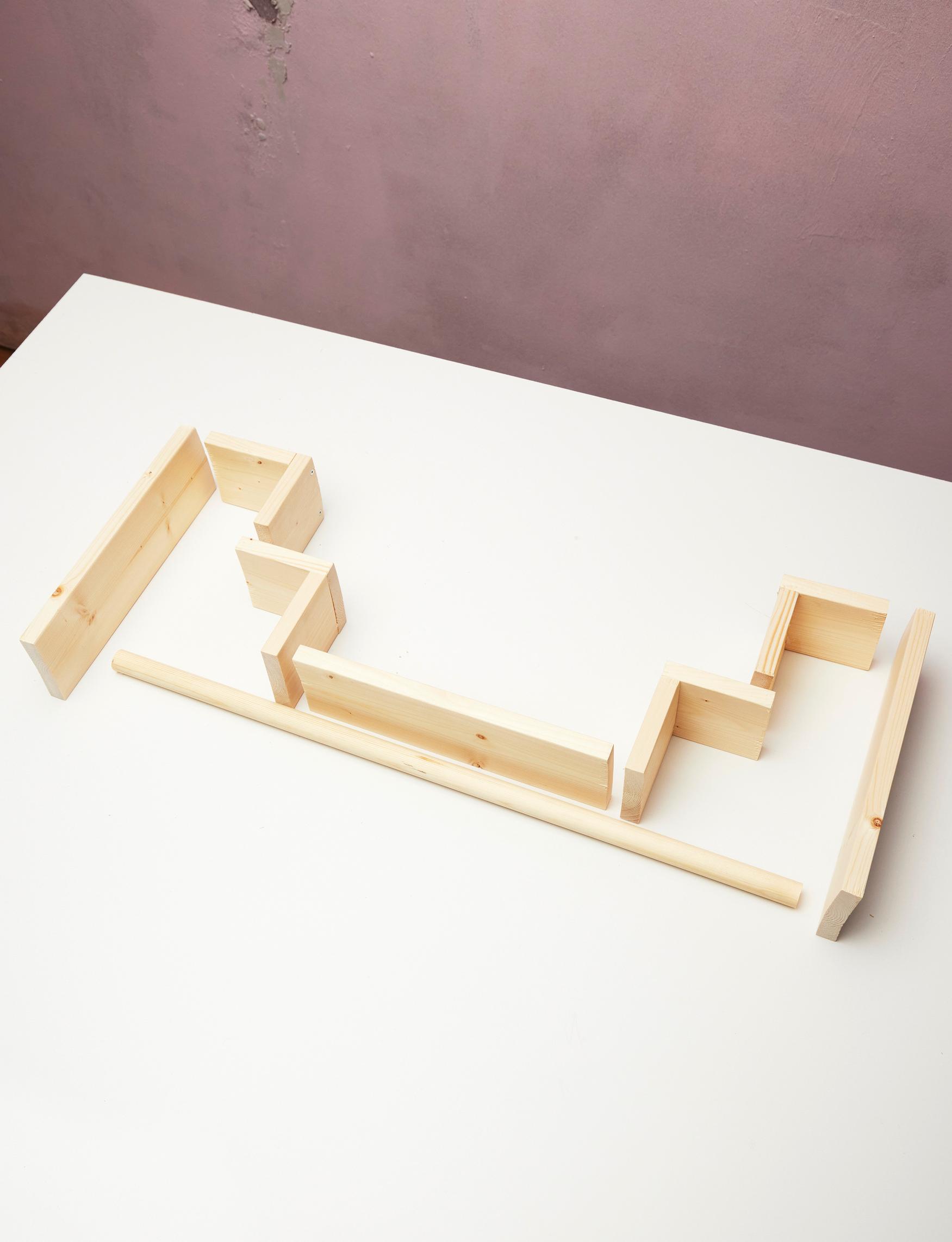 1. Sahaa laudasta kolme 30 cm:n kappaletta ja kahdeksan 10 cm:n kappaletta. Tasoita hiomapaperilla.
