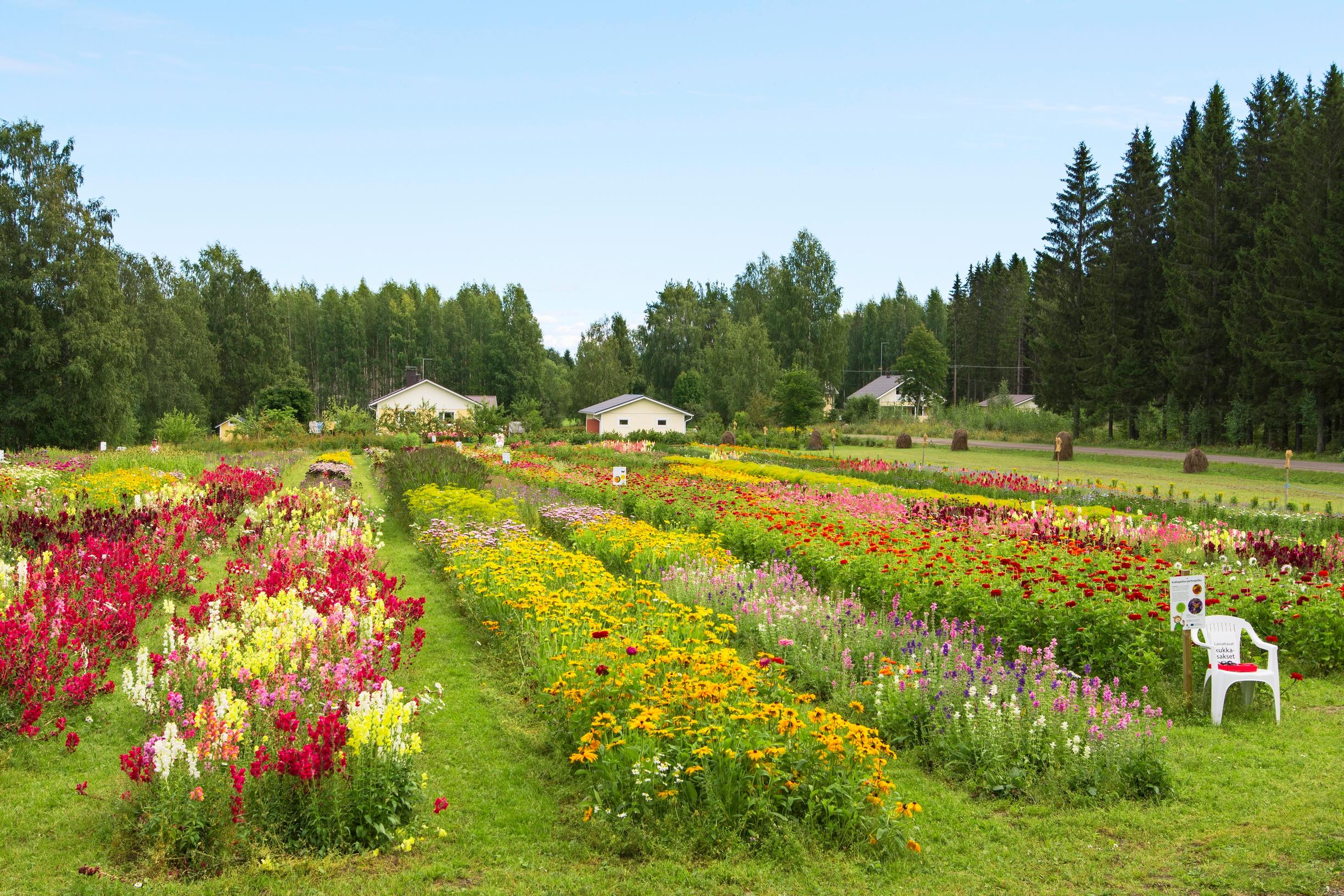 Markku Halosen pelto Rääkkylässä hehkuu elokuun puolessa välissä kaikissa väreissä. Punaiset, siniset, keltaiset ja valkeat rivit raidoittavat pellon päästä päähän kuin jättimäisessä räsymatossa. Värikkäät kukkarivit hyppäyttävät ajatukset väkisin Hollannin sipulikukkapelloille. Nämä kukkaset kasvavat kuitenkin huomattavasti lähempänä, Itä-Suomen tukevalla maaperällä.