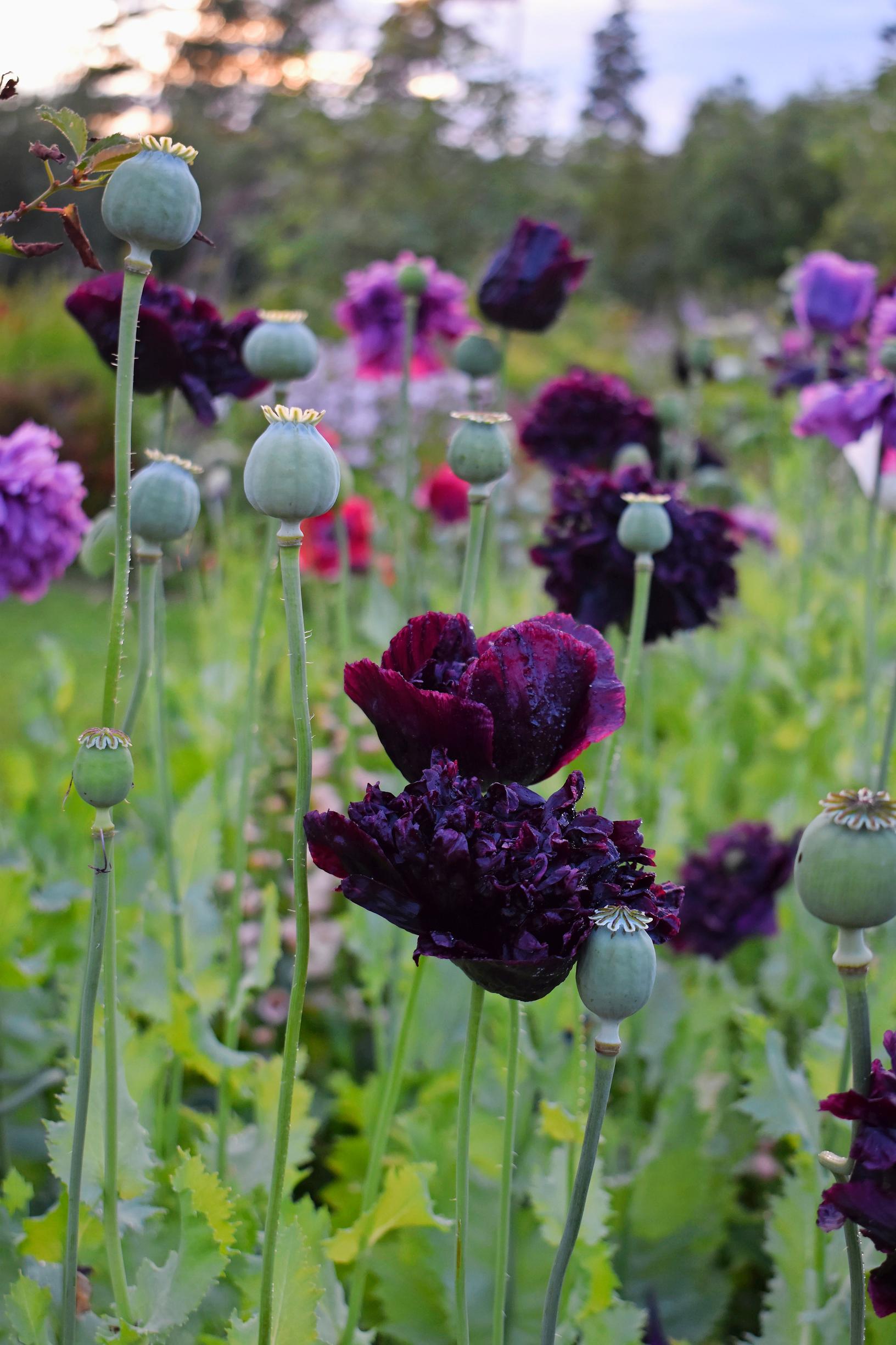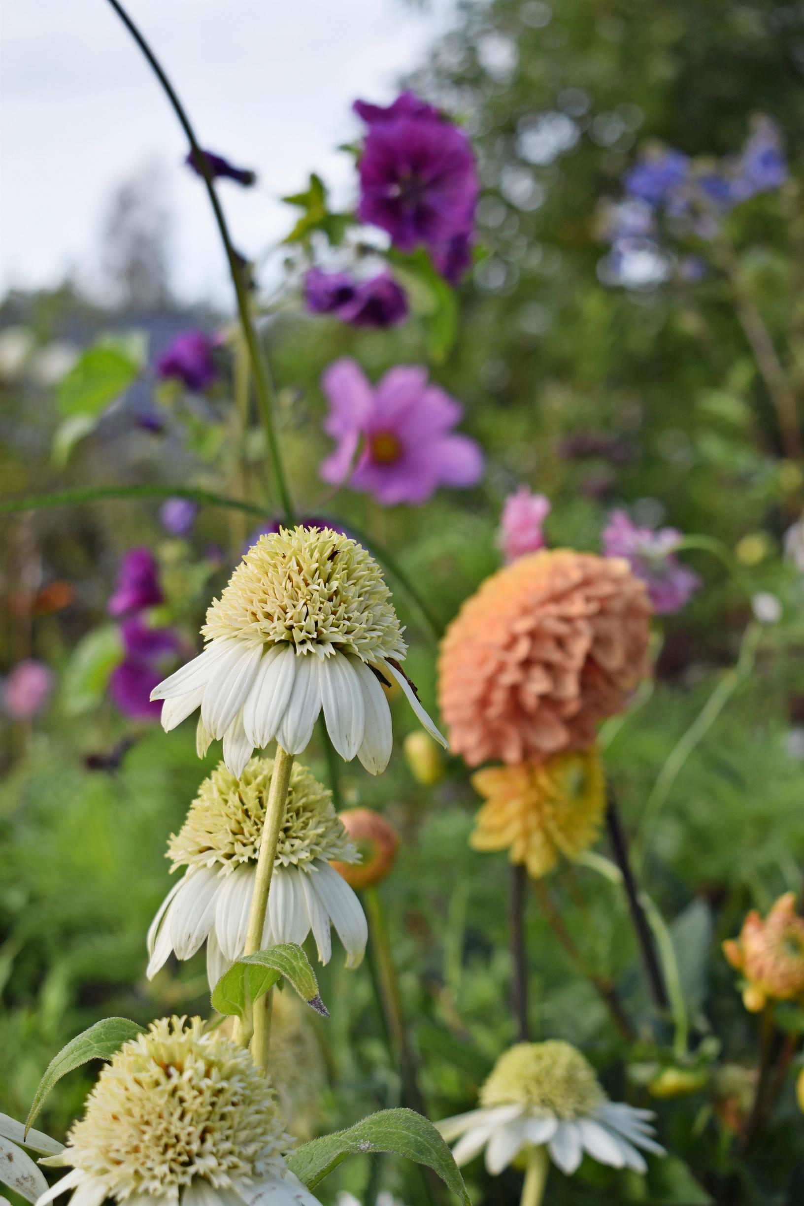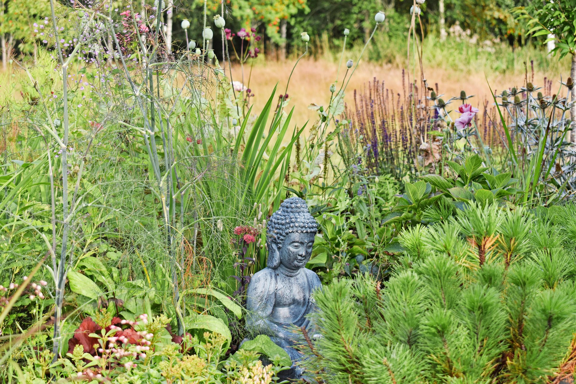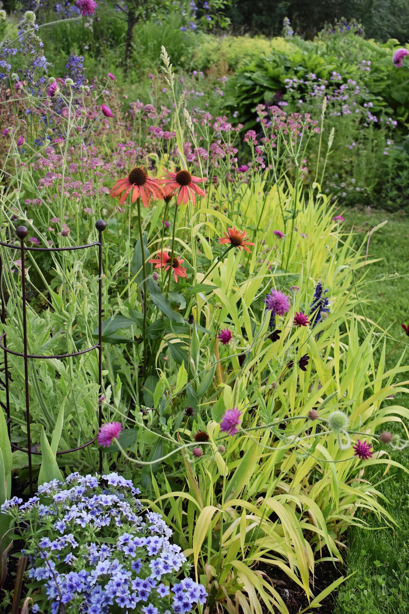 Kasveja valitessani mietin yleensä ensin värejä, sitten muotoja. Periaatteeni on, että jos värit ovat harmonisesti sopusoinnussa, voin ilotella muodoilla. Pyöreää ja suippoa, sileää ja rosoista, hentoa ja jykevää lähekkäin. Jos taas väreissä on isoja kontrasteja, saa muotokieli olla harmonista. Näin puutarhassa vallitsee rauha. Paikoin annan värien räiskyä periaatteideni vastaisesti.