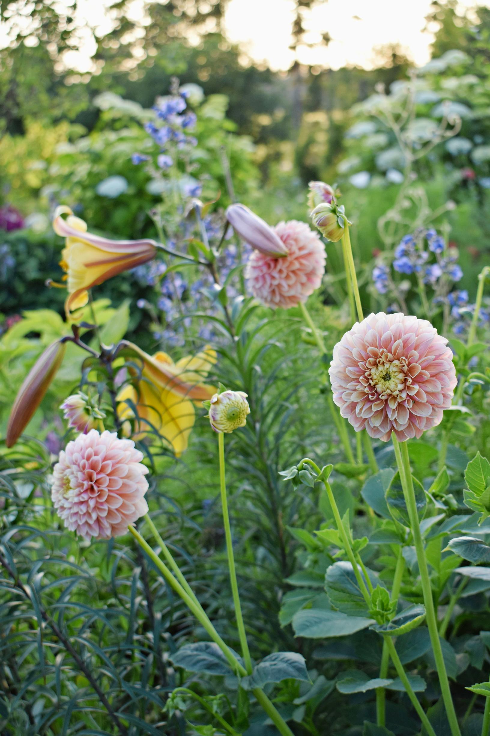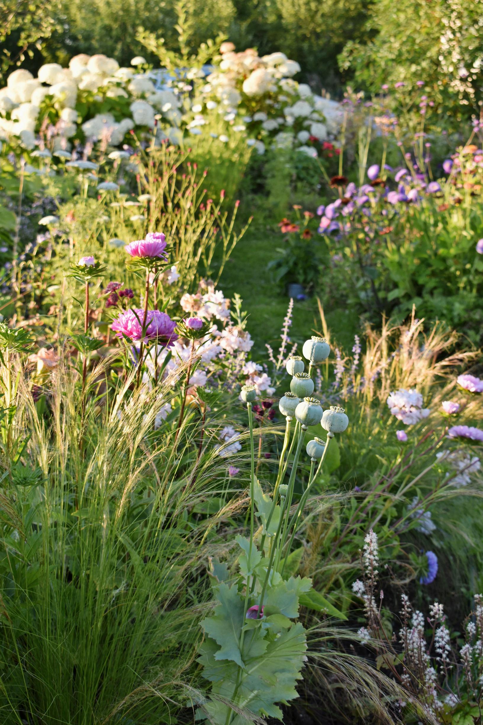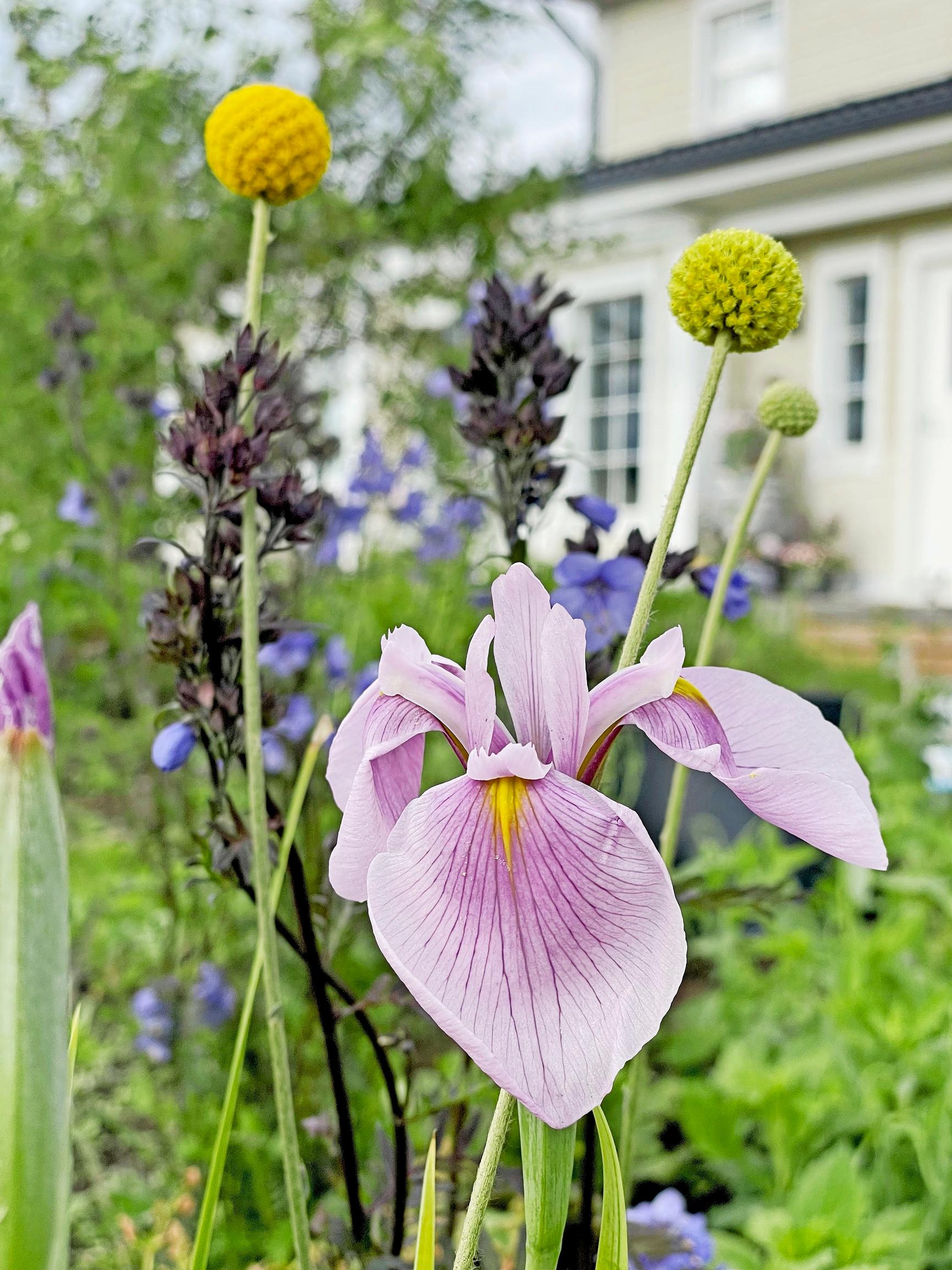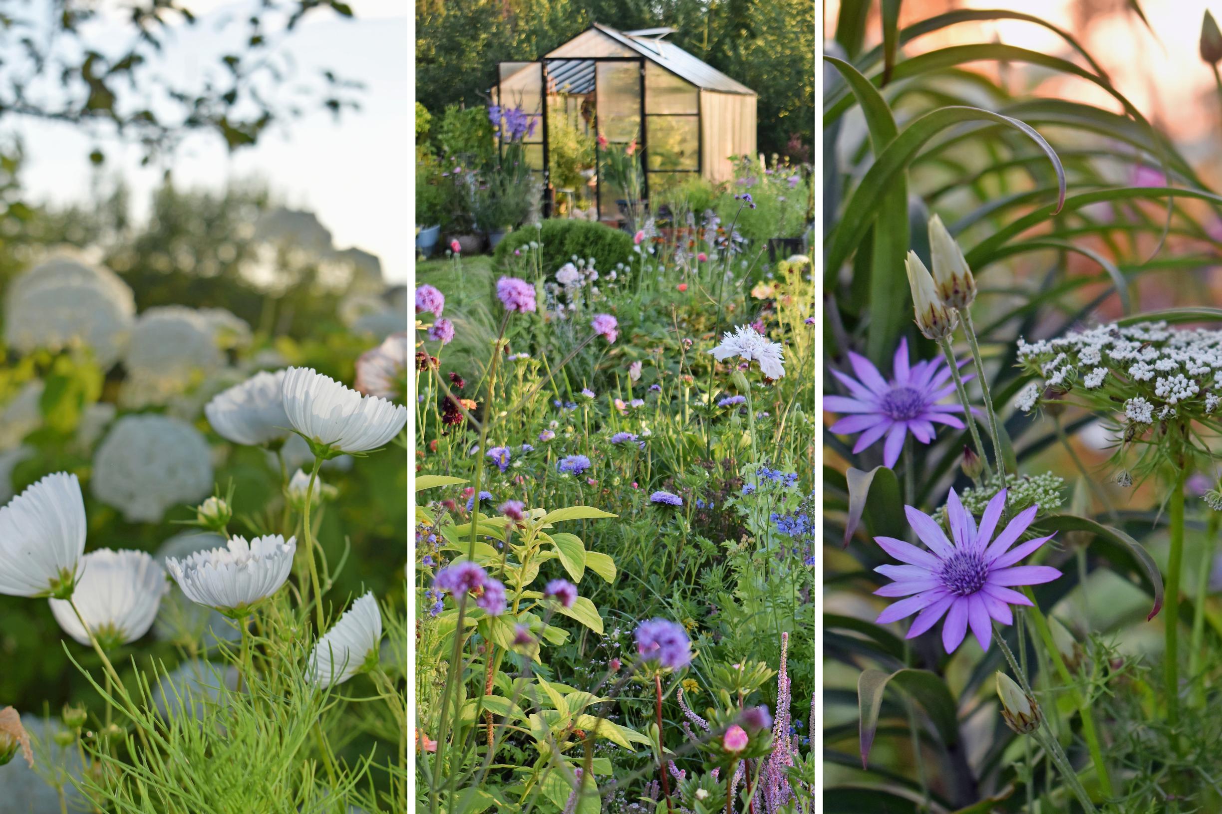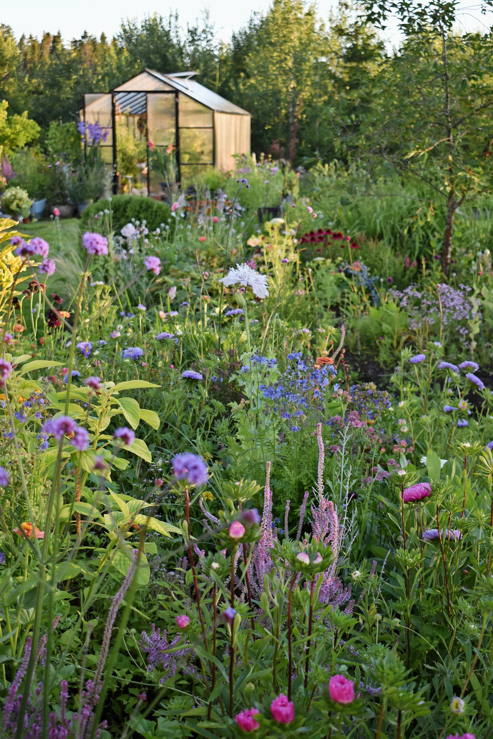 Puutarhaa perustaessani ajattelin ensisijaisesti tunnelmia – mitä haluan nähdä ja tuntea. Paikka on minulle ennen kaikkea ilon lähde, siksi kasvatan niin paljon kukkakasveja. Kasvit ja niiden yhdistelmät saavat mielestäni olla niin veikeitä, että ne saavat katsojansa hymyilemään. Itseäni jaksaa vuosi vuodelta ilahduttaa kultahehkun ja ’Rose Queen’ -japaninkurjenmiekan vuoropuhelu – vaalean liilan ’Rose Queenin’ terälehtien keltaiset laikut toistavat täydellisesti kultahehkun pallokukkien väriä.