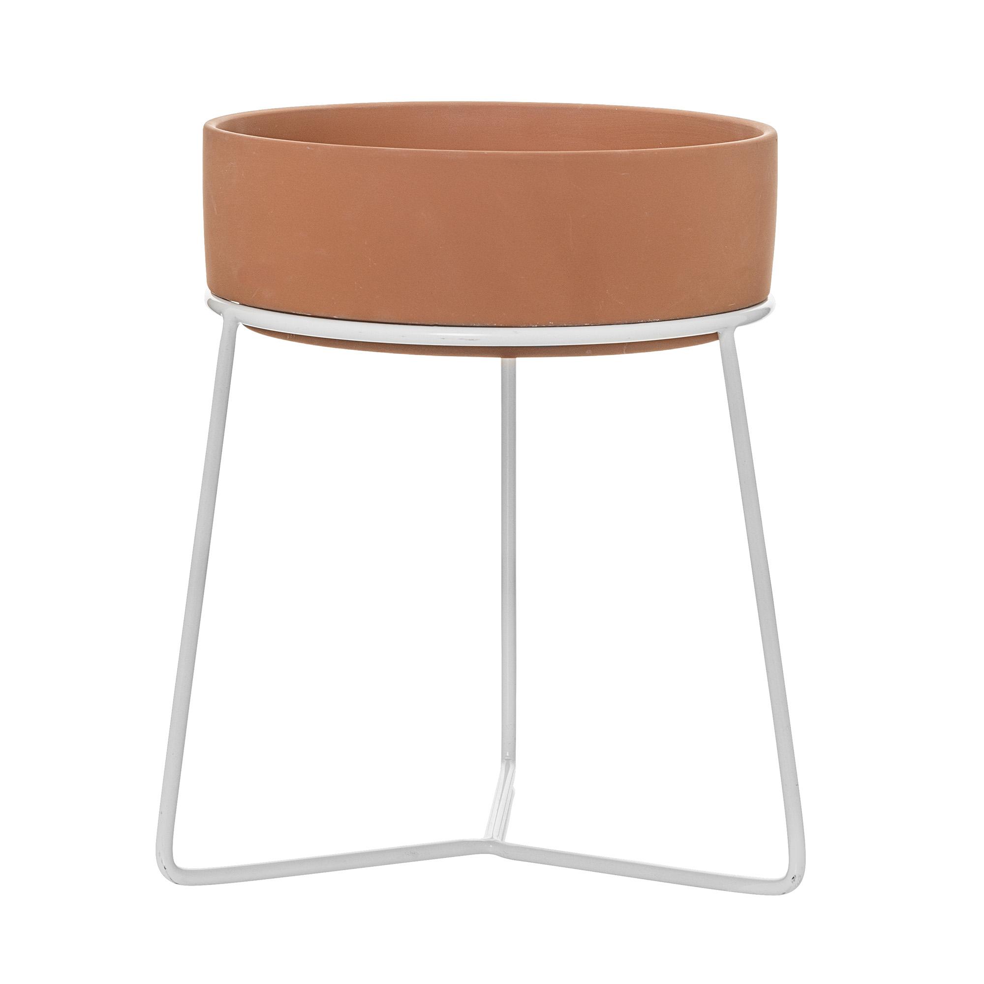 Keraamisessa alustassa on aito saviruukun väri. Siro jalka on metallia. Plant Stand -teline on tarkoitettu pidettäväksi pöydällä tai tason päällä. Ruukun halkaisija 22 cm, telineen korkeus 22 cm. Ruukku 15,50 €, jalusta 15 €, Connox.