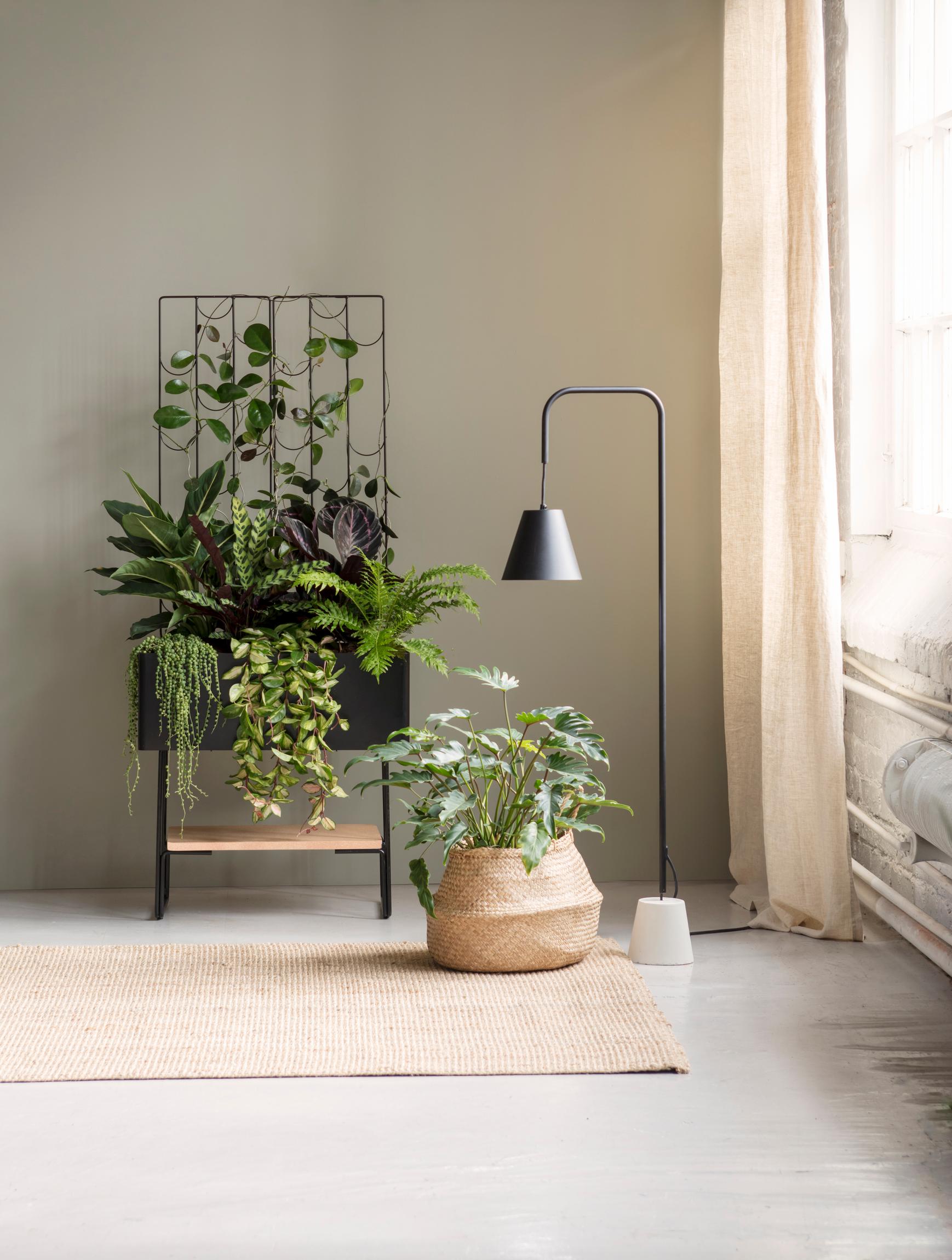 Kasvikeidas on olohuoneen katseenvangitsija. Sijoita kasvit ja tukiritilä viherlaatikkoon ja päästä kasvit rönsyilemään. Viherlaatikko (leveys 70 cm, syvyys 35 cm, korkeus 72 cm) 169 € ja metallinen vihertuki (leveys 30 cm) 14,90 €, Kekkilä.