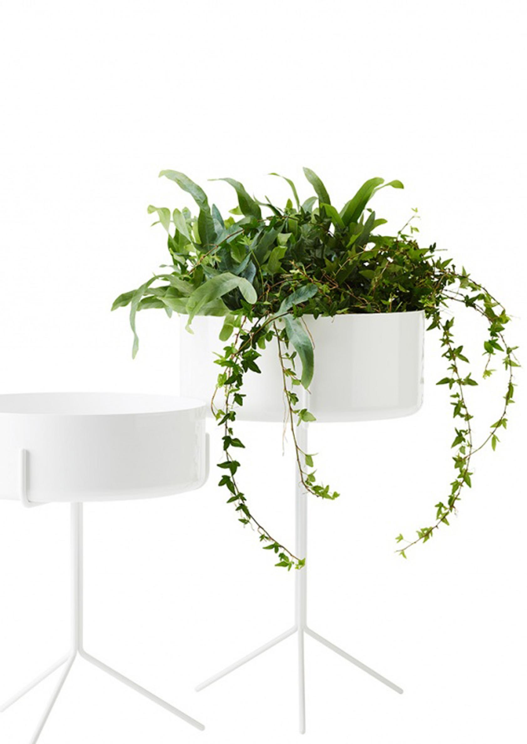 Tämä ajaton kukkateline on suunniteltu alun perin sohvapöydäksi. Saarnipuisen Drum-pöydän uusin versio on Monochrome Drum Planter -pöytä, jonka tarjotinosa on muovia ja jalka metallia, (halkaisija 40 cm, korkeus 36 cm tai 46 cm). Tiedustelut Finnish Design Shop.