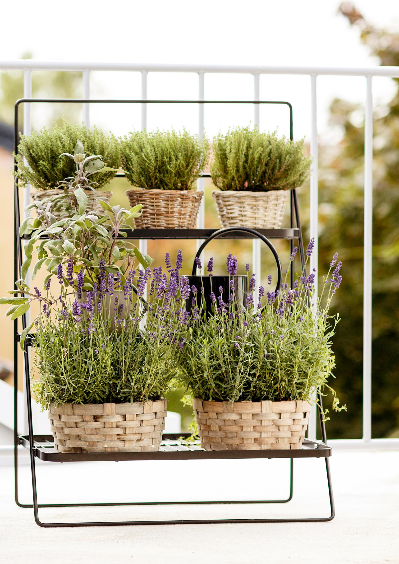 Jos et halua sijoitella kasveja ympäri asuntoa tai parveketta, sijoita ne näyttävästi yhteen paikkaan. Metallinen siro viherporras (leveys 100 cm, korkeus 79 cm, syvyys 35 cm) 119 €, Kekkilä.