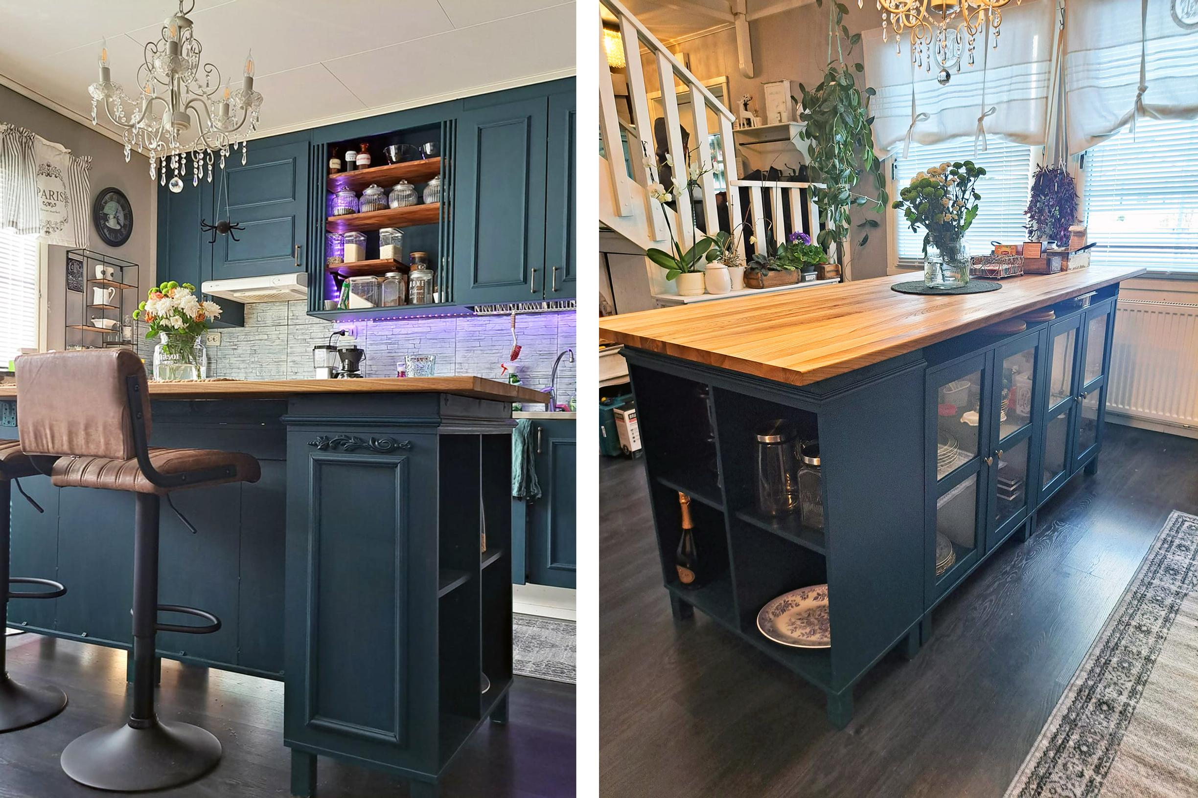 Kun keittiön kaapin ovet alkoivat tulla tiensä päähän, päätti Mättä-Vilppulassa asuva Riikka Kimmel, 44, päivittää ne maalamalla. Samalla hän nikkaroi viikonloppupuhteena vanhoista vitriineistä käytännöllisen saarekkeen.
