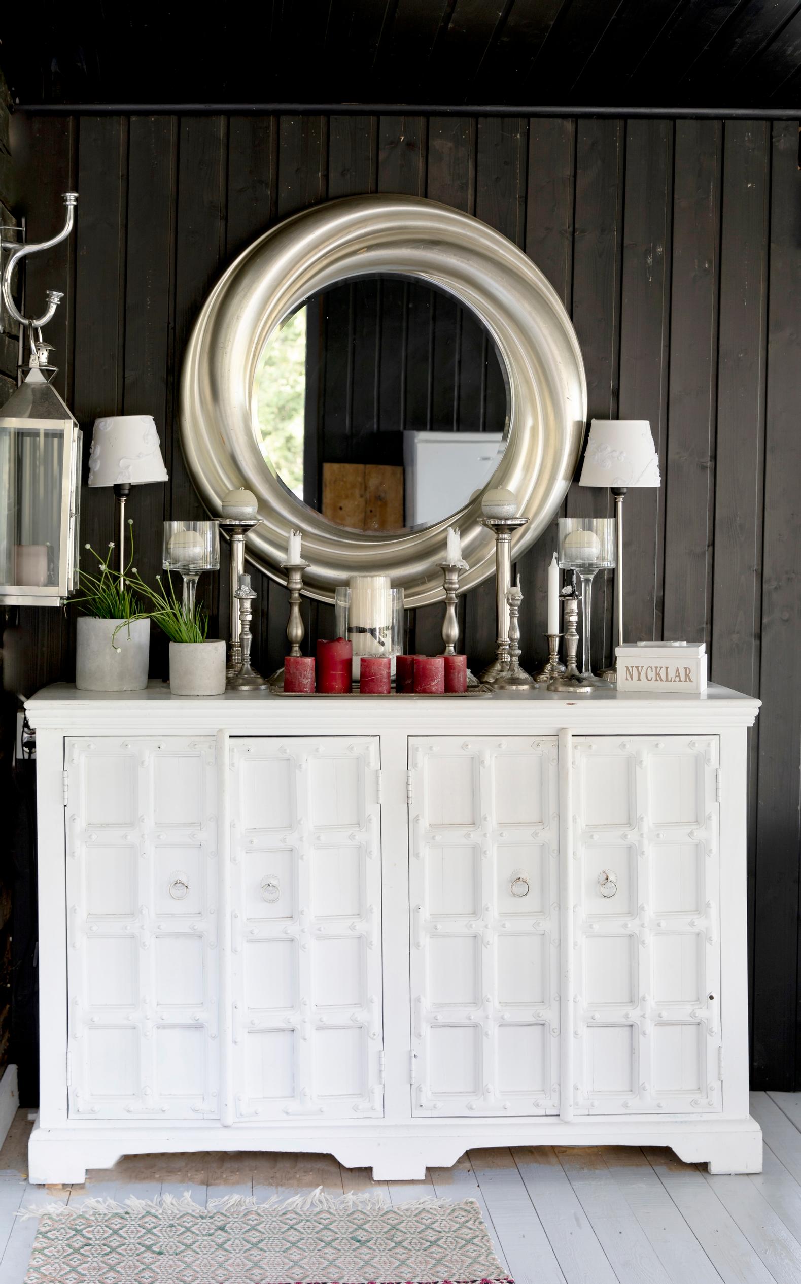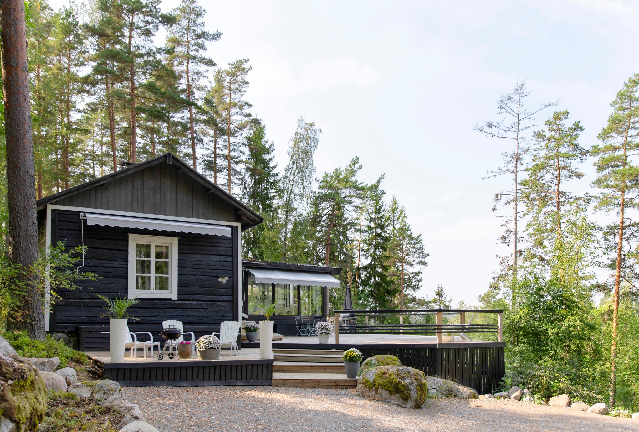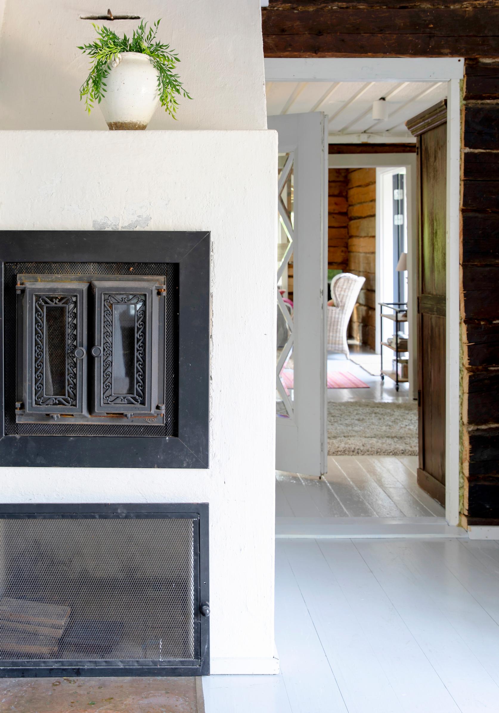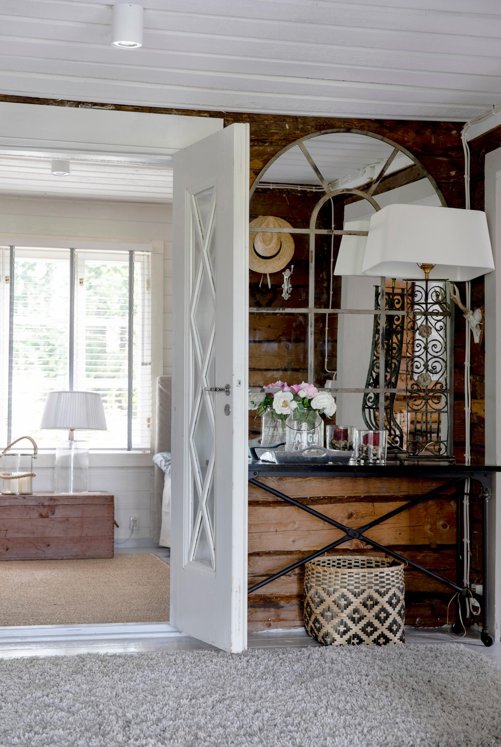 Anne haluaa, että mökin eri vaiheet näkyvät myös sisustuksessa, sillä rakennuksen historia ja tunnelma ovat hänelle tärkeitä. Kokonaisuus on hallittu yhdistelmä glamouria ja menneen ajan tunnelmaa. Musta ulkovuoraus vie torpan kuitenkin tyylillisesti 2000-luvulle ja tuo mieleen vanhat skandinaaviset kalastajamökit.