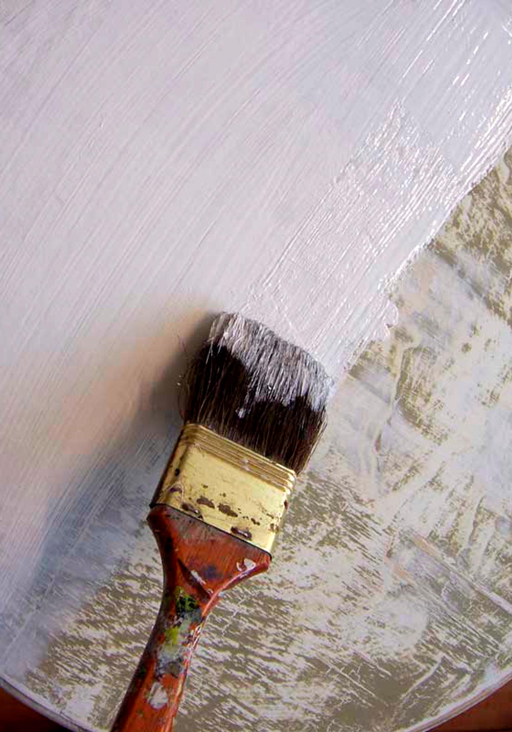 3. Pohjamaalaa kaluste hieman ohennetulla tartuntapohjamaalilla. Mikäli haluat pintaan elävyyttä, voit sävyttää pohjamaalin ja antaa värin näkyä sieltä täältä kultauksen lomasta. Tällöin pohjamaalaus kannattaa tehdä kahteen kertaan, toinen kerros ohentamattomalla maalilla.
