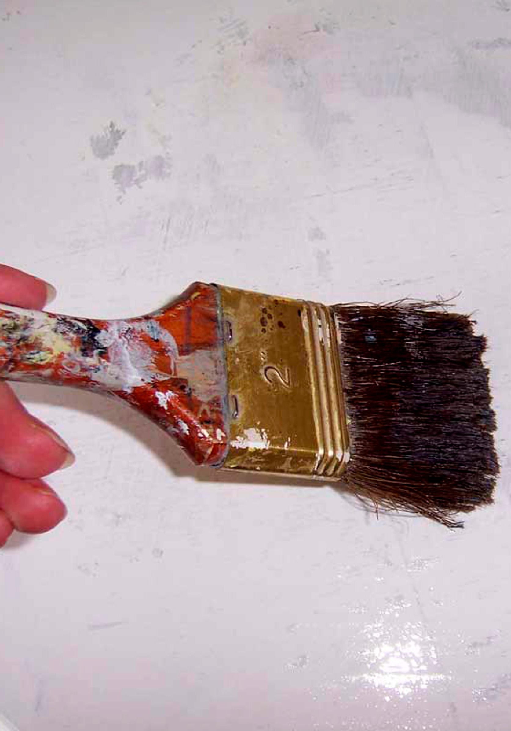 4. Hio pinta maalin kuivuttua hienoimmalla hiomapaperilla (240). Poista pöly huolellisesti ja pyyhi pinta vielä kostealla räsyllä. Kipsiesinettä käsiteltäessä pinta hiotaan kevyesti hienolla hiomapaperilla ja pohjustetaan vernissalla tai oksalakalla ennen mikstionin levittämistä. Pohjamaalausta ei välttämättä tarvita. Levitä mikstionia ohut ja tasainen kerros. Koko pintaa ei kannata käsitellä kerralla. Anna aineen kuivua nahkeaksi (noin 15 –30 min.).