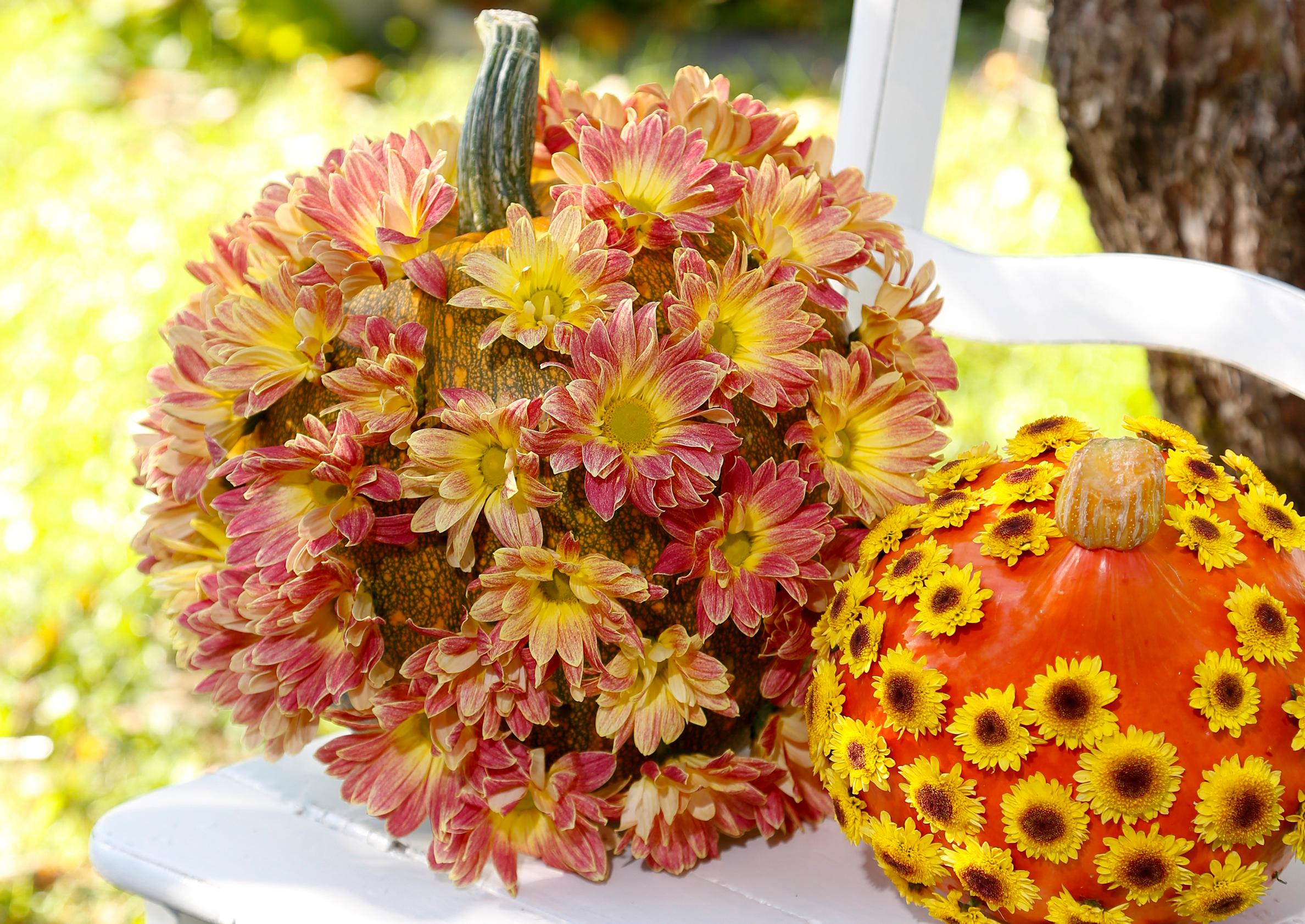 Saat komean kurpitsakoristeen puutarhaan, kun päällystät kurpitsan krysanteemin kukilla.