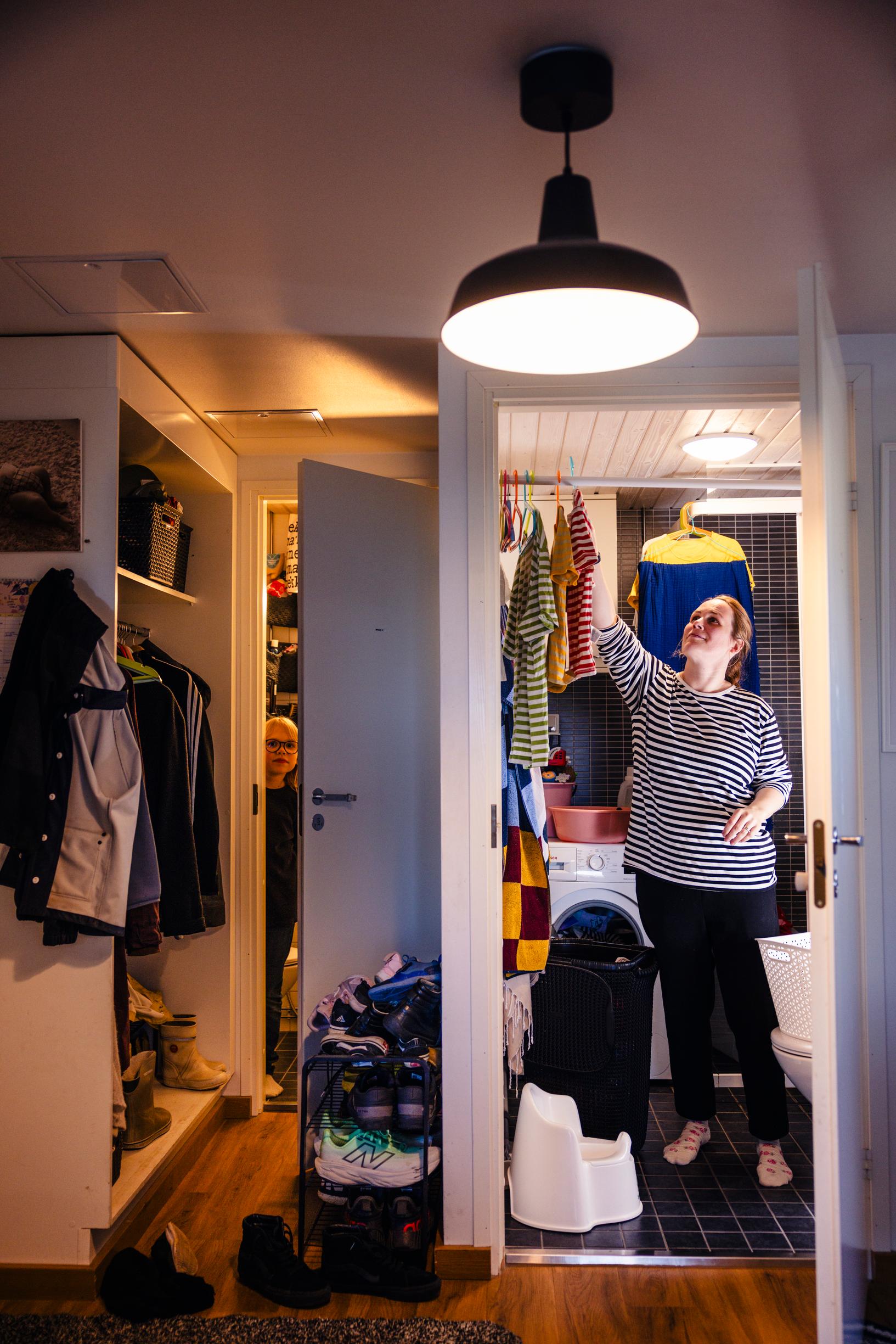 ”Kun lapset tulevat sisään, kengät ja ulkovaatteet lentävät ympäriinsä. Pipot ja hansikkaat ovat laatikoissa, mutta ne tyhjennetään aina pitkin lattiaa. Vaatteille olisi olemassa pari naulakkoa, mutta kaikki poraamista edellyttävät hommat jäävät meillä roikkumaan.”