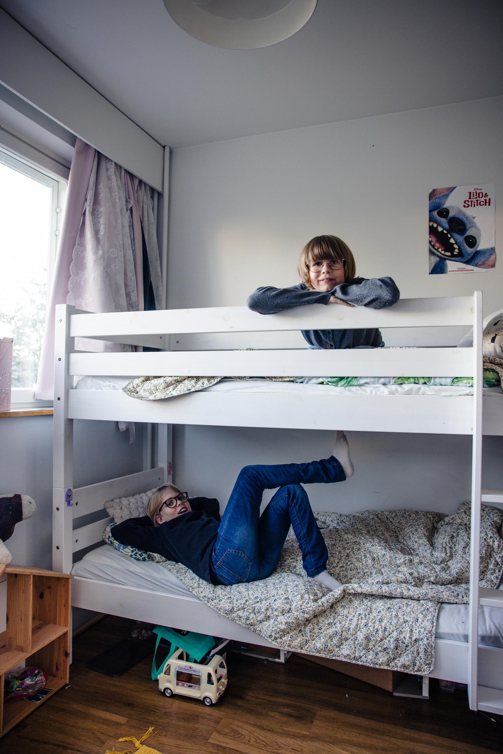 Tällä hetkellä perheen pojat Vilho, 4, ja Eemil, 13, jakavat huoneen, samoin kuin tytöt Hilda, 8, ja Inka, 11. Välillä pienimmät ovat olleet samassa ja isommat lapset omassa huoneessaan. Edellisessä kodissa kaikki lapset jakoivat huoneen, ja joskus on kokeiltu sitäkin, että joku on saanut omansa.