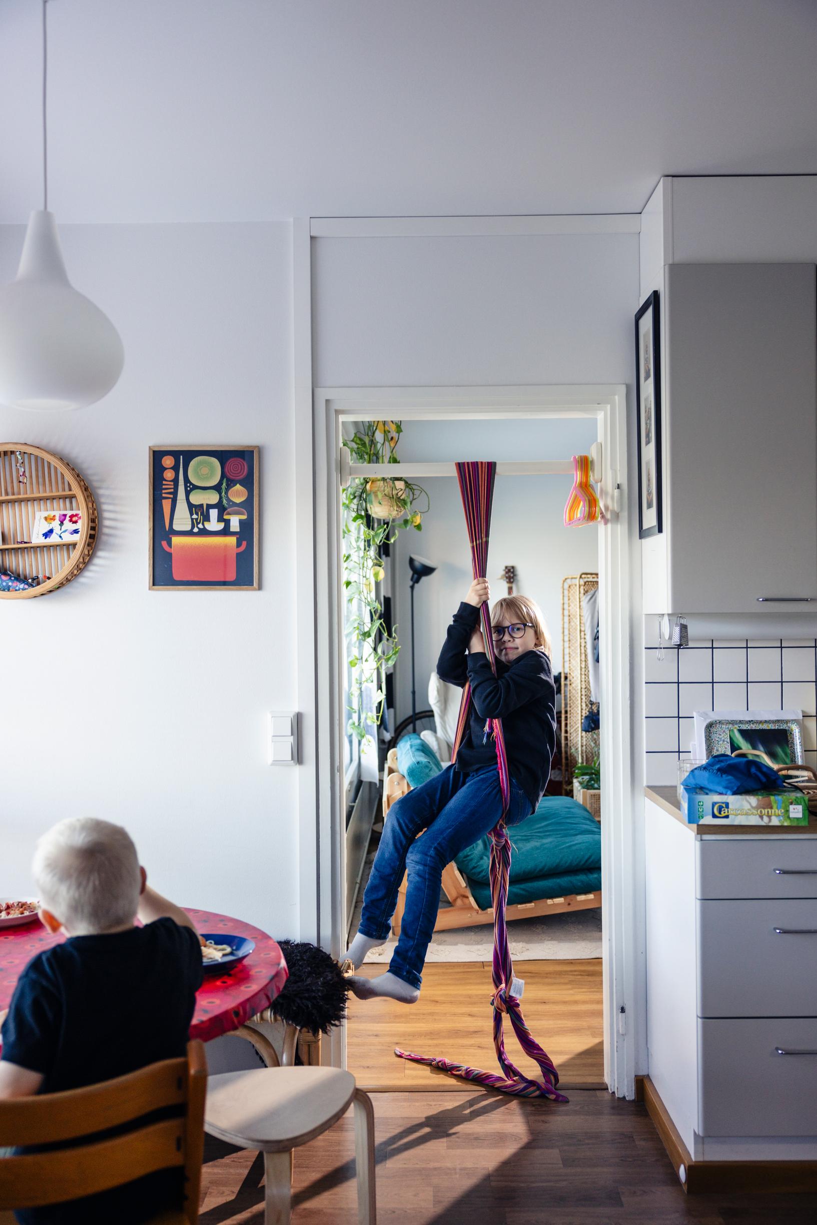 Kodin sydän on keittiö, jonka pyöreän pöydän ääressä perhe viettää eniten aikaa. Lapset piirtävät, tekevät koulutehtäviä ja kokkailevat. Lasten suosikkipaikka löytyy keittiön ja olohuoneen välisestä oviaukosta, johon on asennettu leuanvetotanko.