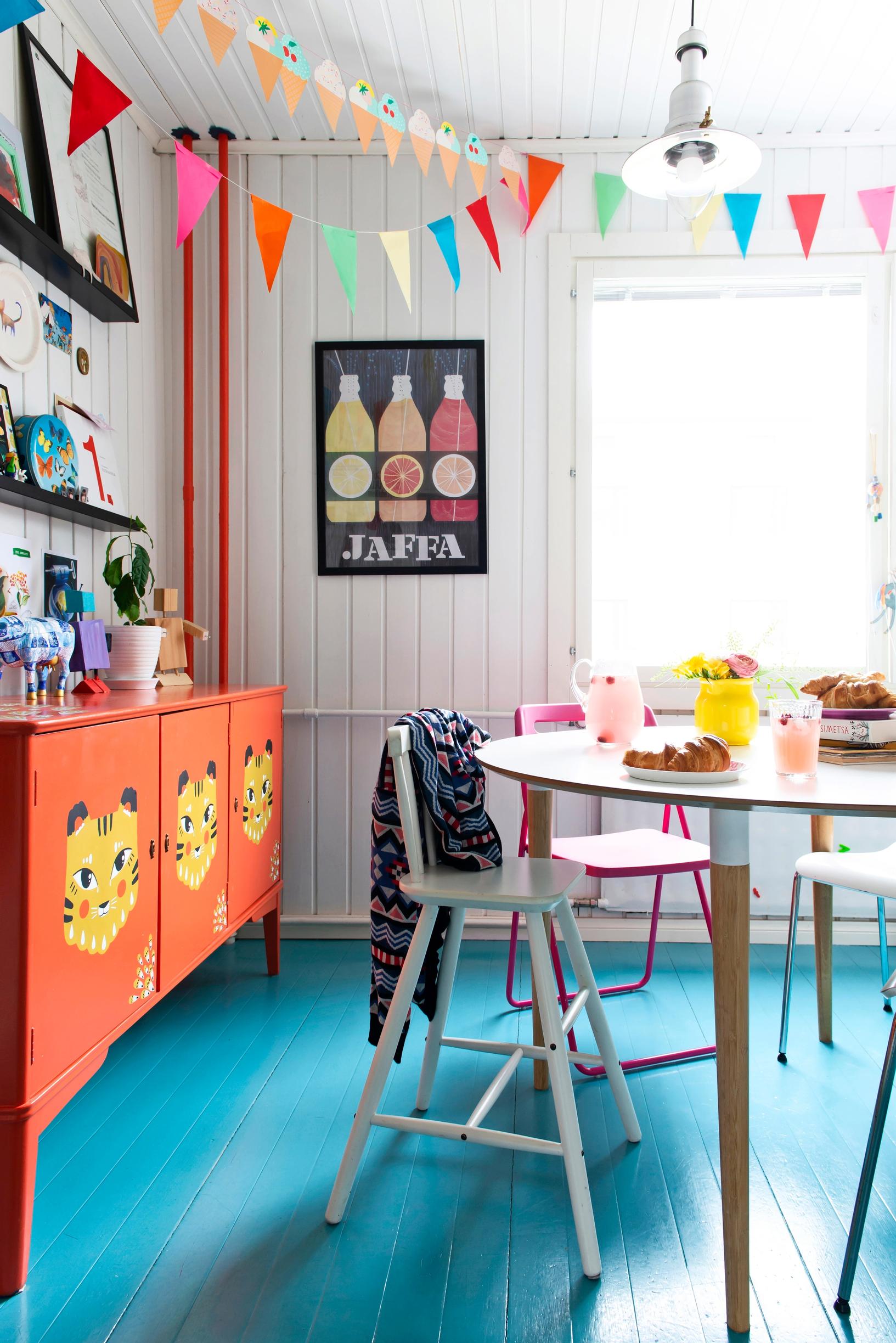 Meillä on ihan kaikkia värejä, ja kaikki tuntuvat omilta. Rakastan paahteista keltaista ja syviä sävyjä, kuten turkoosia. Olen kuvittaja, ja päässäni on ikään kuin valmiiksi värikartta.