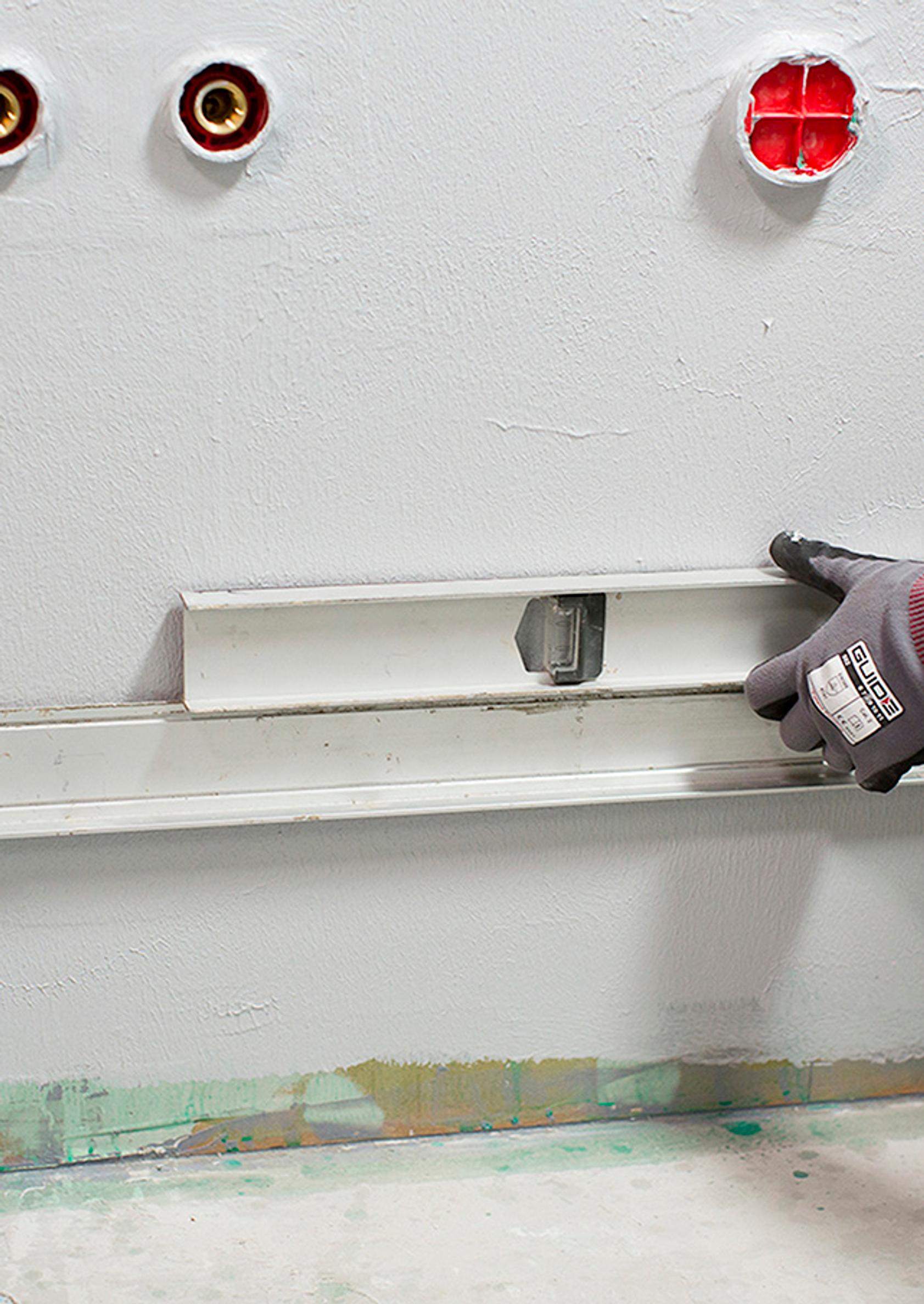 Seinään asennetaan aluksi ohjuri vaakasuoraan vatupassin avulla. Ohjurin alle jätetään yhden seinälaatan verran tilaa. Huomioon pitää ottaa myös lattialaatan paksuus sekä sauma- ja silikonivara. Laatoitus aloitetaan ohjurin päältä. Seuraavasta kerroksesta alkaen apuna voi käyttää saumanarua, vaikka nykyisillä valumattomilla laasteilla se ei olisi välttämätöntä. Naru valitaan laatan koon mukaan. Laattojen pystysuoruutta voi seurata työn aikana silmämääräisesti ja vatupassin avulla.