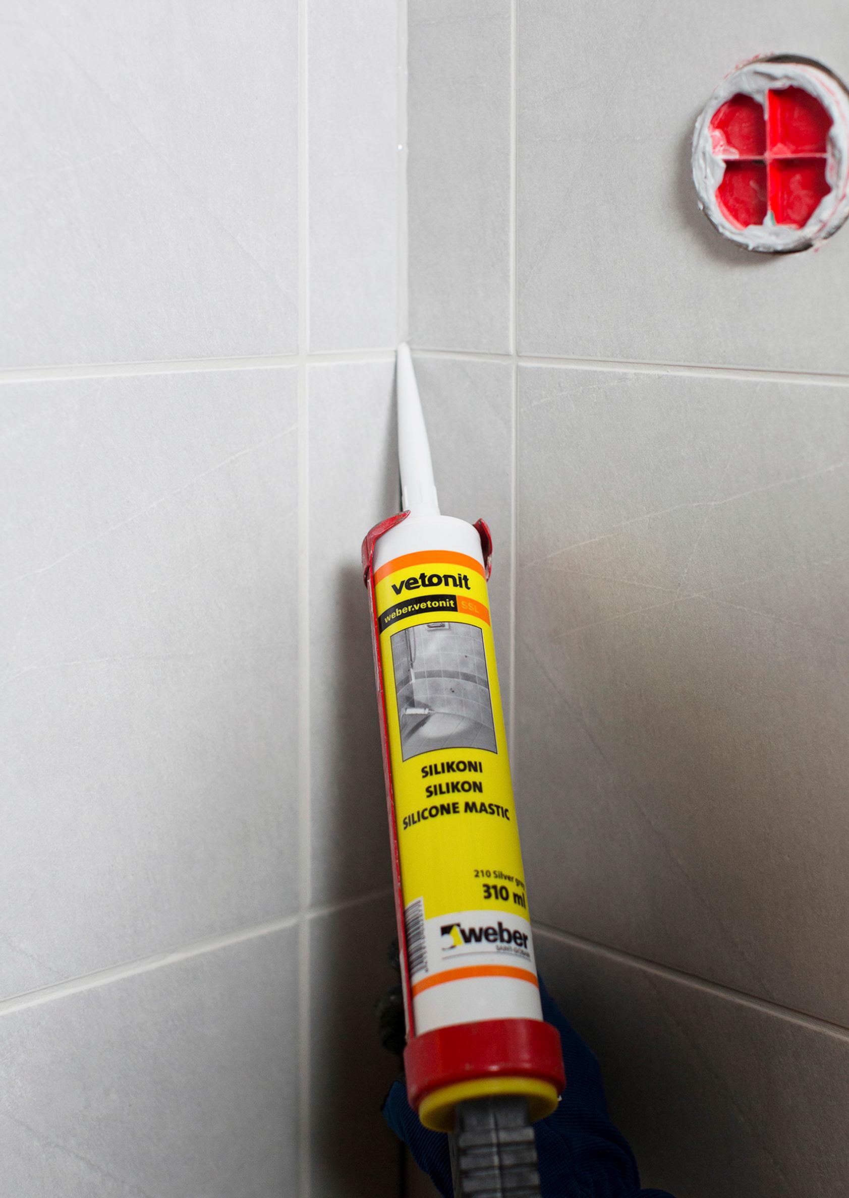 - Silikonisaumat kannattaa laittaa aikaisintaan vuorokausi laattojen saumauksen jälkeen. Silikonisauma kuuluu nurkkiin, läpivienteihin ja kalusteiden saumoihin.