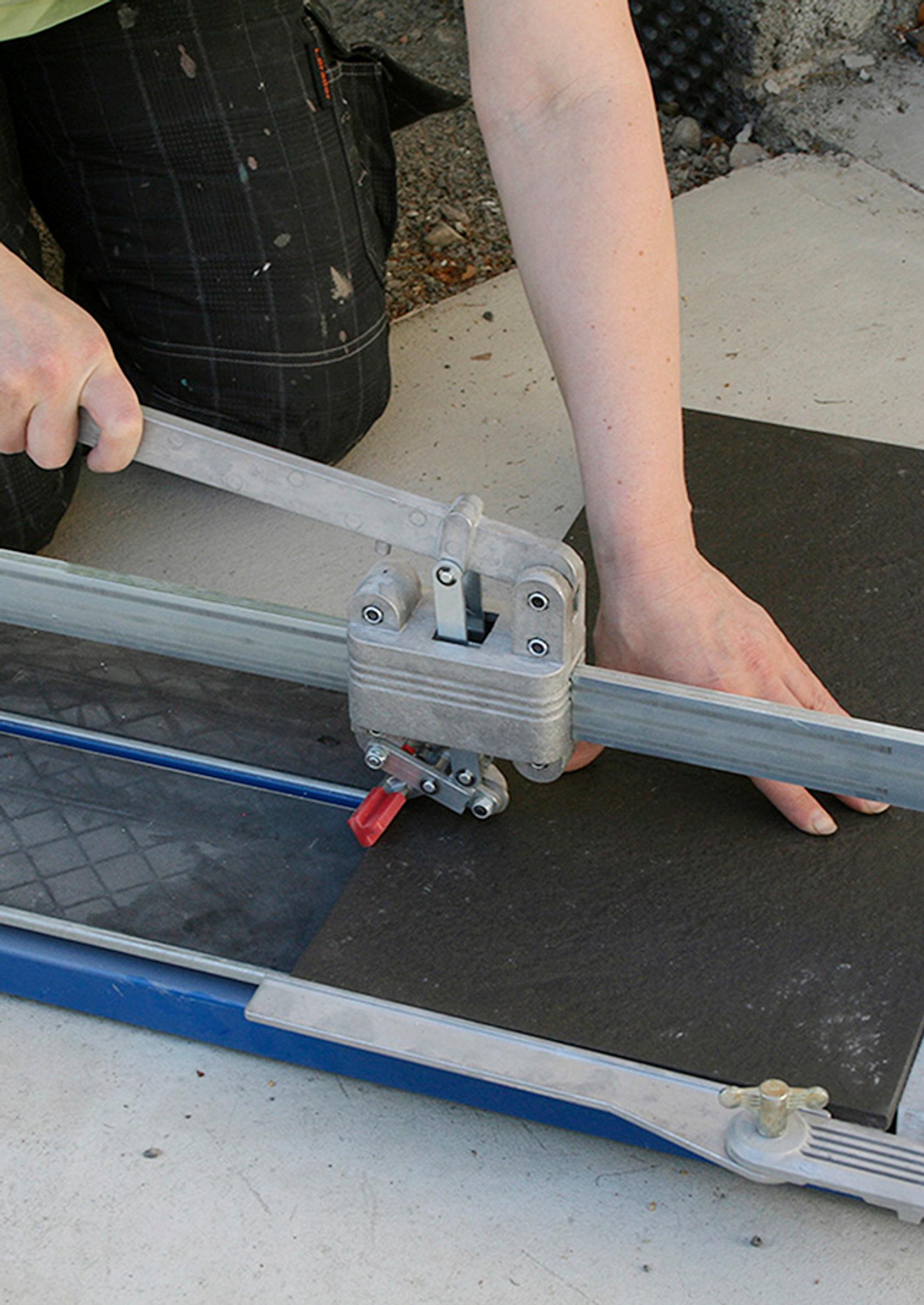 13. Laattaleikkuri on kätevä apu. Sen pyöreä terä rikkoo lasitepinnan, jolloin laatan saa katkaistua kammesta painamalla.