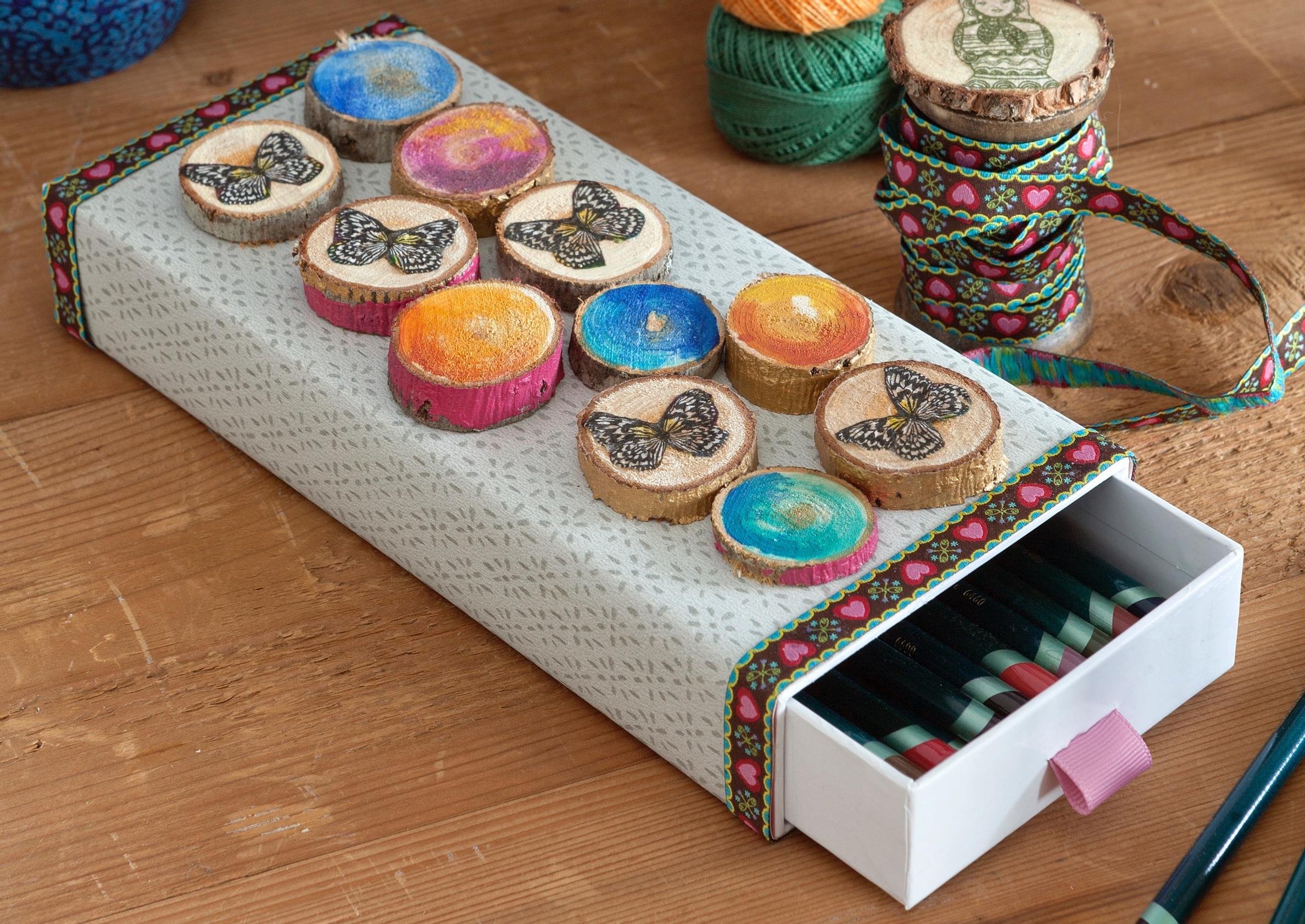 4. Somista puukiekot vesiväreillä maalaten tai liimaa decoupage-lakalla niihin servettikuvioita. Kiekot ovat kauniita ihan sellaisenaankin. Niihin voi kirjoittaa vaikka penaalin omistajan nimen. Liimaa kiekot kiinni.