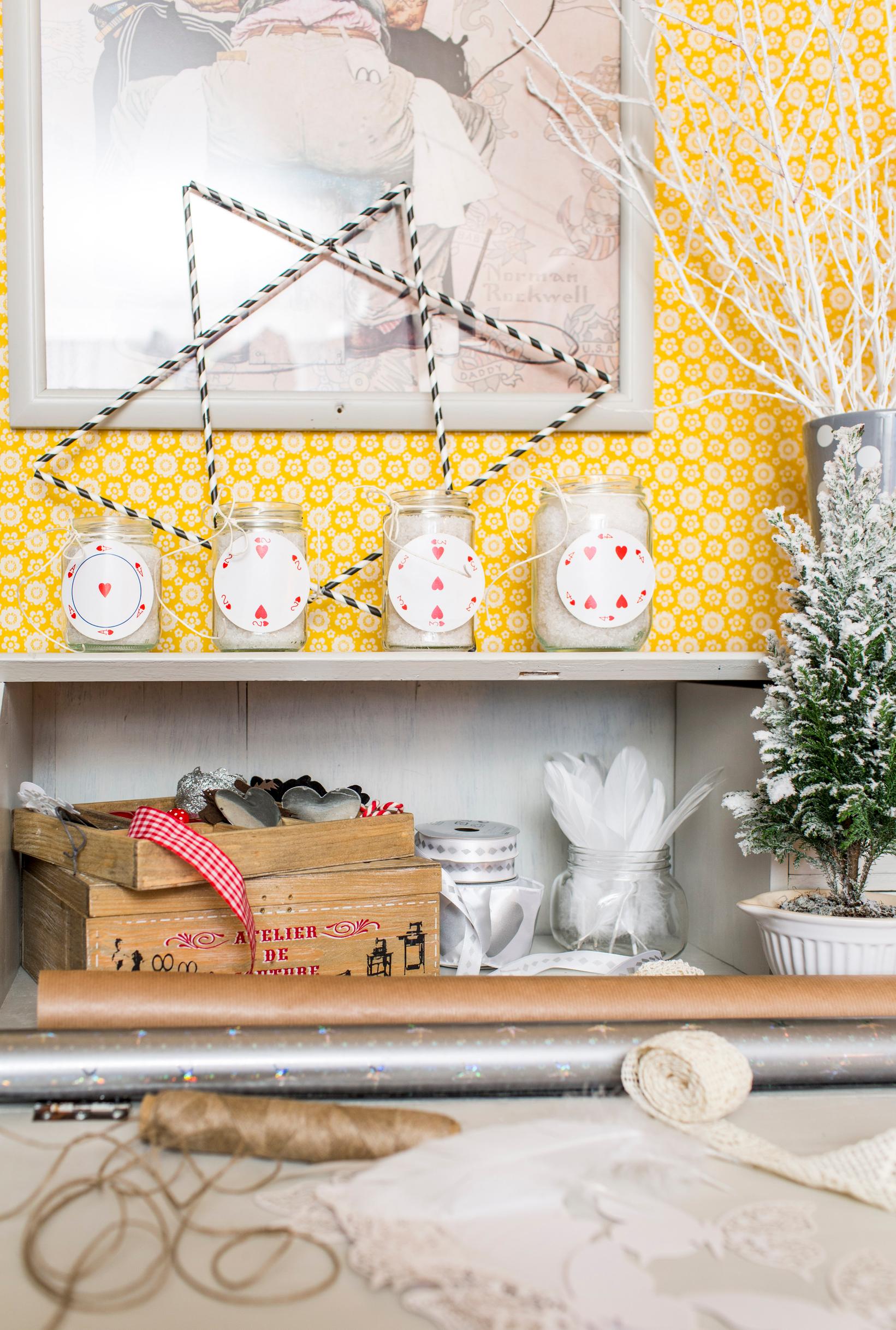 Adventtikynttilät voi tehdä helposti itsekin vaikka keskenään erikokoisista lasipurkeista. Nämä purkit on täytetty karkealla suolalla ja valonlähteenä on tuikkukynttilä. Pelikortit kertovat, missä järjestyksessä kynttilät on tarkoitus sytyttää.