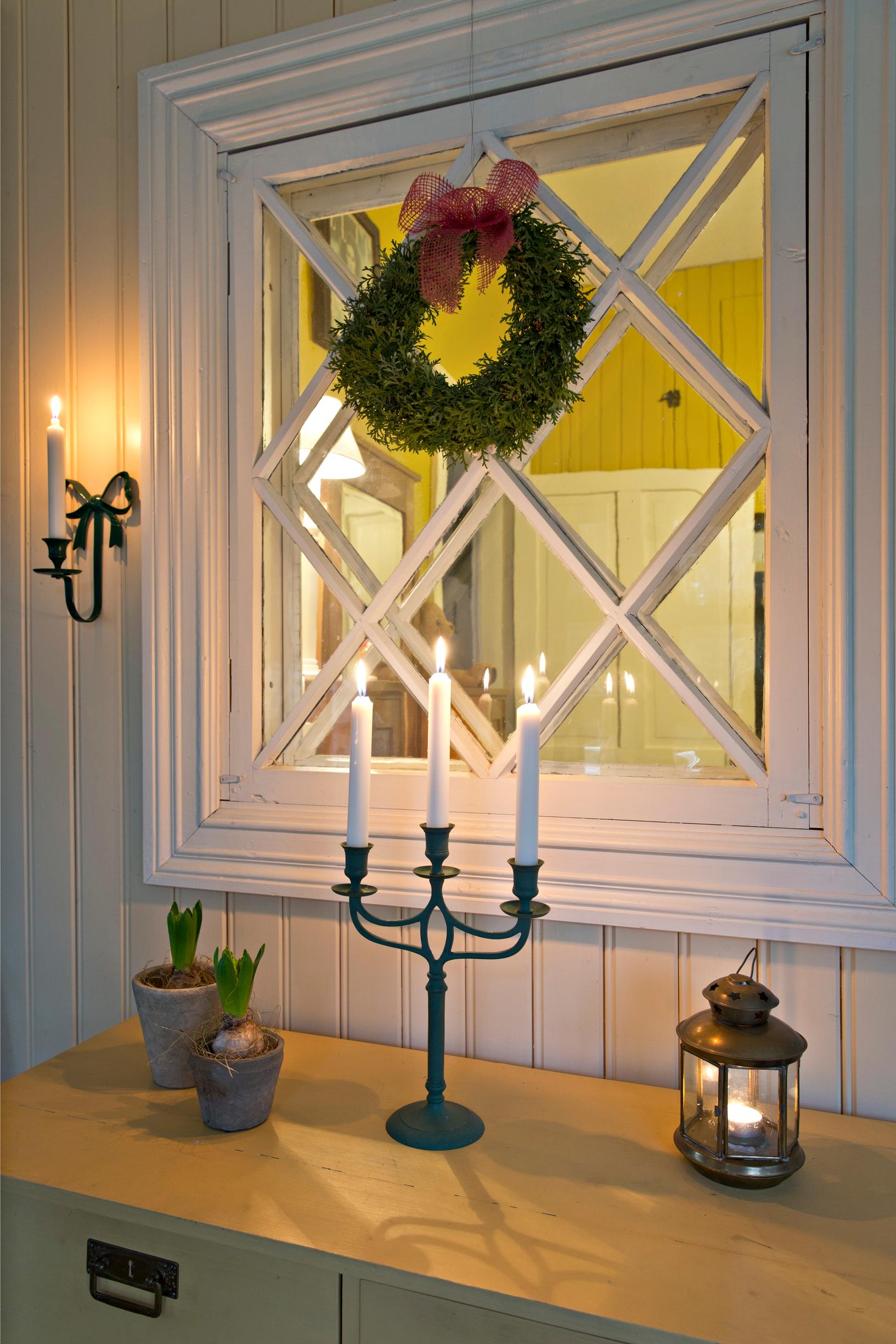 Pakkasen huurruttamat ikkunalasit, olkihimmeli, havut ja tuikkuasetelma hurmaavat kuistilla.