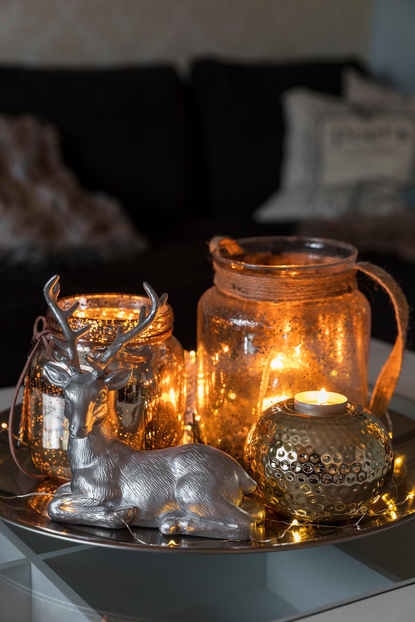 Erilaisista tuikuista, lasipurkeista ja koriste-esineistä syntyy tarjottimelle suloinen asetelma. Onnea ovat pimeät illat kynttilänvalossa!