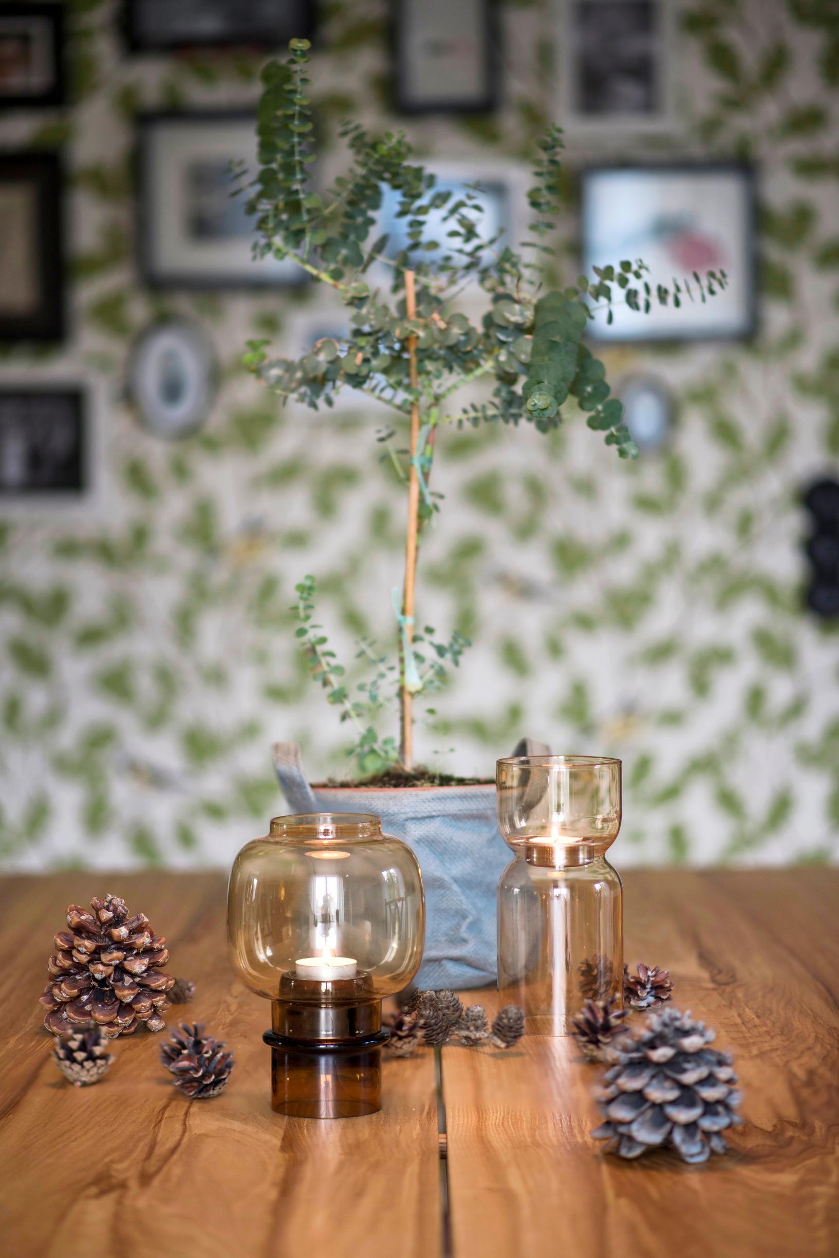 Lapsiperheessä turvallinen vaihtoehto on polttaa tuikkuja lasin suojissa. Vuodenaikaan sopivat koristeet kerätään mukaan metsäretkeltä.