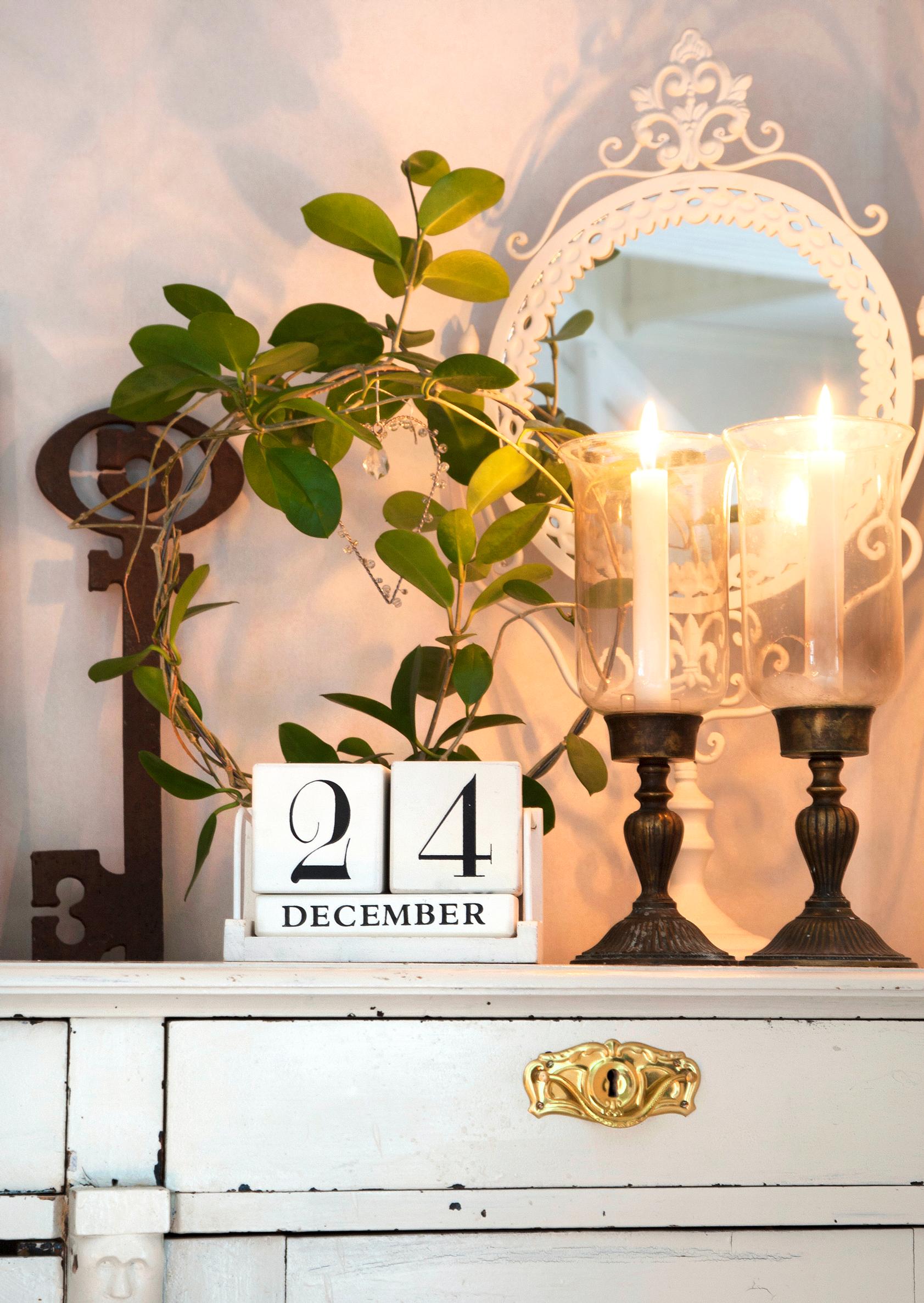 Pöytäkalenterin päivämäärä on säädetty jo h-hetkeen. Ylevät metalliset lyhtykynttilänjalat ovat saaneet seurakseen muita metalliesineitä ja soman viherkasvikranssin.
