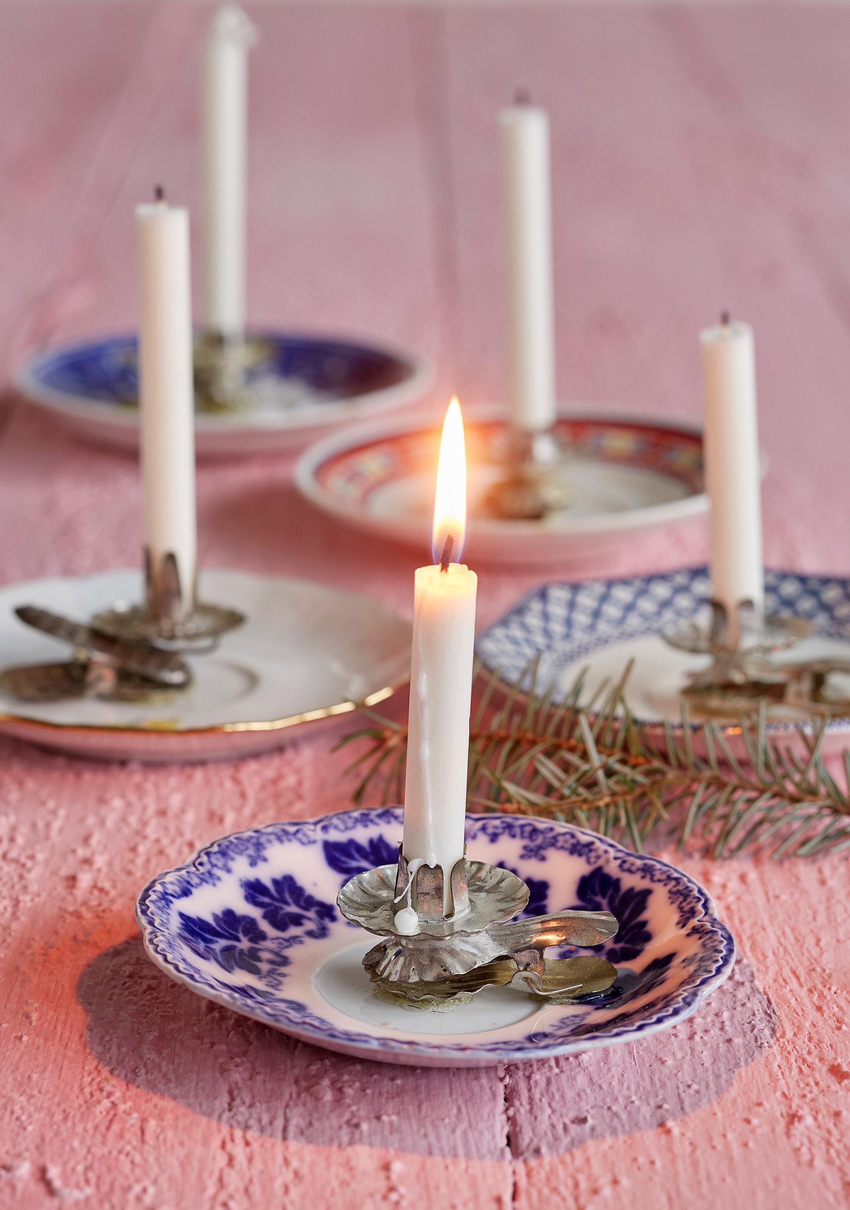 Parittomasta posliinilautasesta – vaikka kirpparilta löytyneestä – ja kynttiläklipsistä voi tehdä nostalgisen kynttilänjalan. Kiinnitä ne toisiinsa kunnon liimalla.