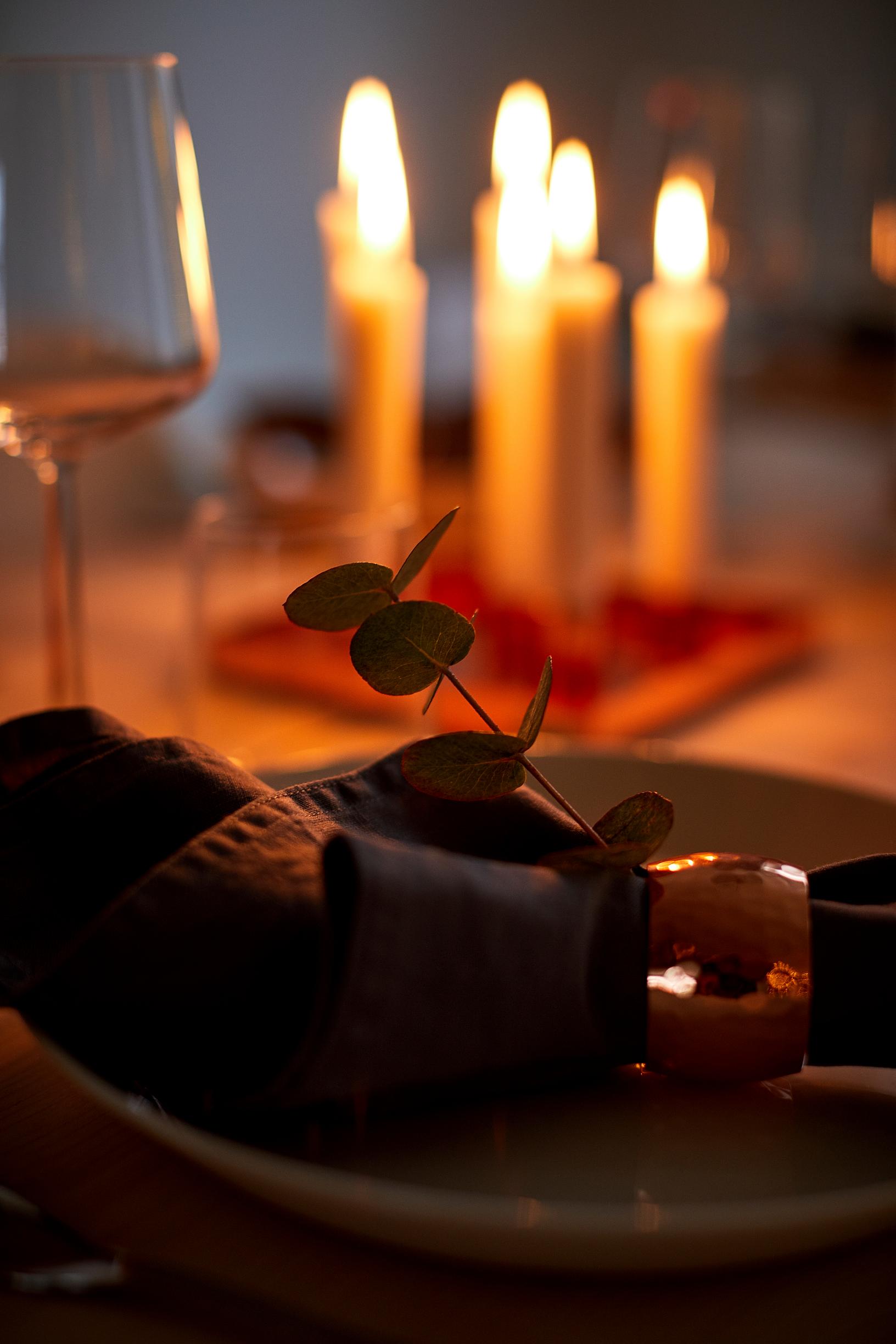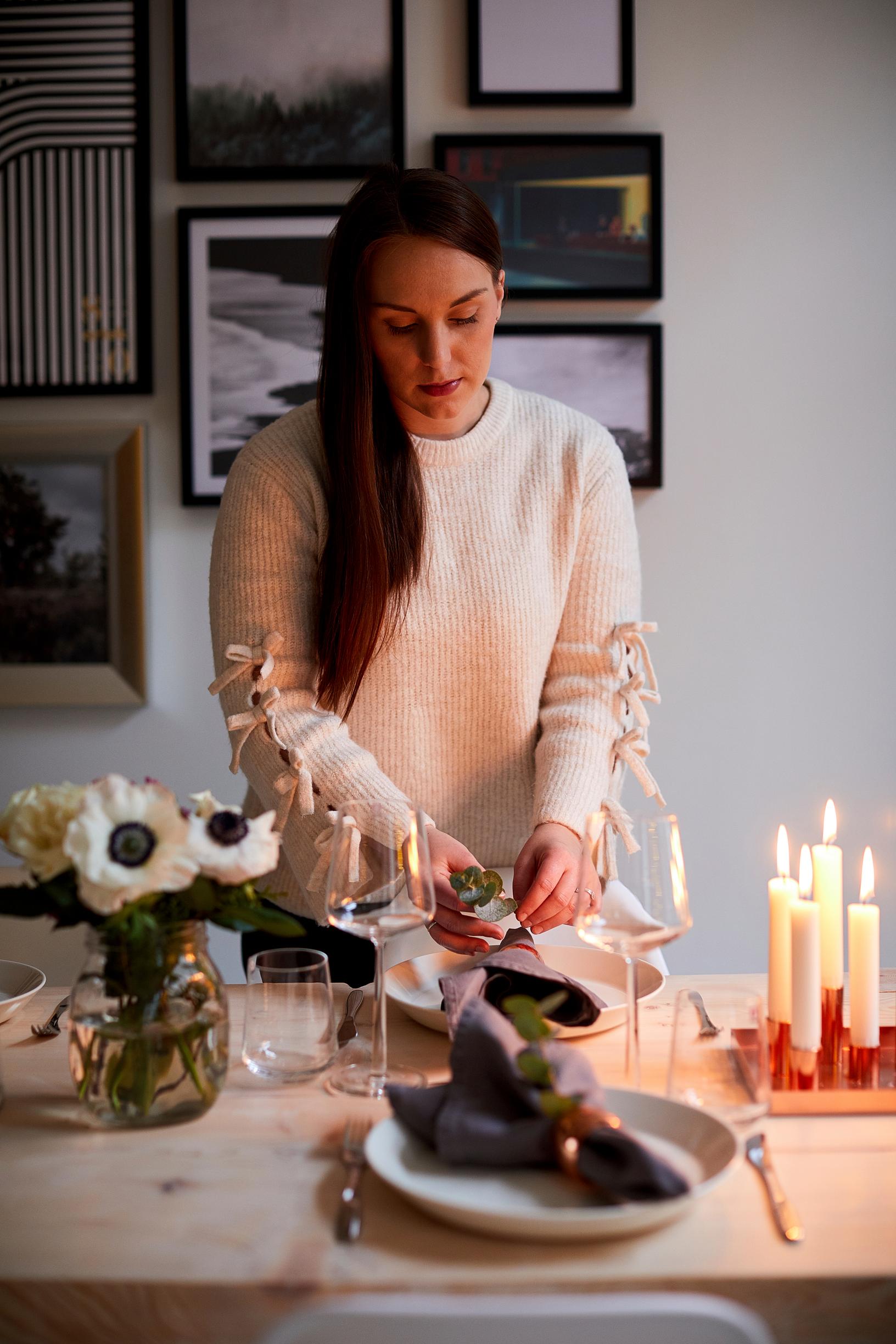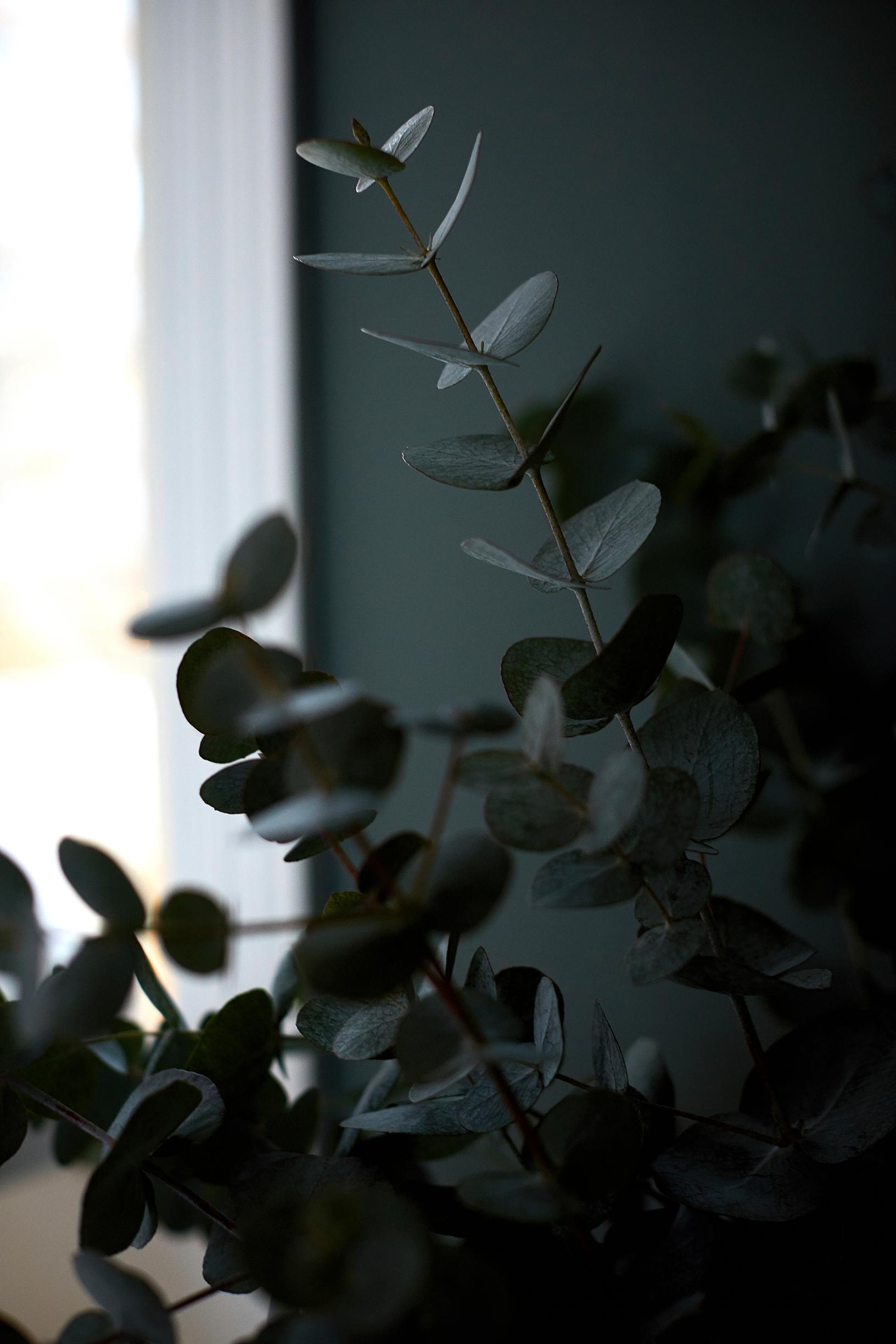 – Luonnosta tulevat vihreän sävyt kuuluvat jouluumme. Havuja pitää olla. Kuusenoksia levitämme portaille, ja männynoksia napsin maljakoihin tai suuriin pulloihin. Pidän myös eukalyptuksen oksista, joista voi sipaista kranssin tai vain laittaa suurena punttina maljakkoon, Maria sanoo.