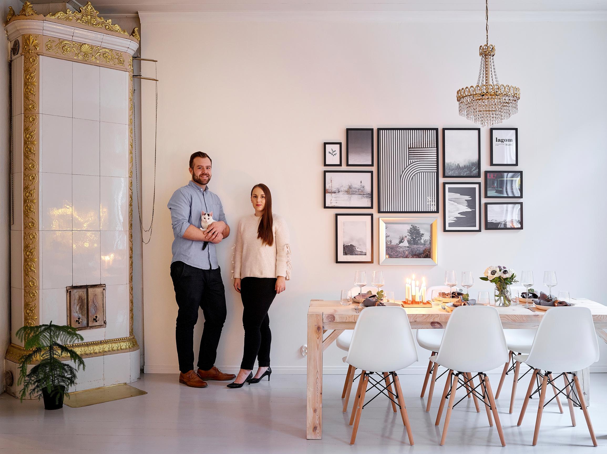Alle kolmekymppinen pariskunta on asunut vastaremontoidussa puutalokodissaan vasta tovin. Kodin lämmin tunnelma syntyy olohuoneen hirsiseinästä ja upeasti kunnostetusta kakluunista. Maria ja Joonas kunnostivat itse kakluunin pinnan rapistuneet kultamaalaukset. Nyt kulta tuikkii kilpaa kuusen valojen kanssa.