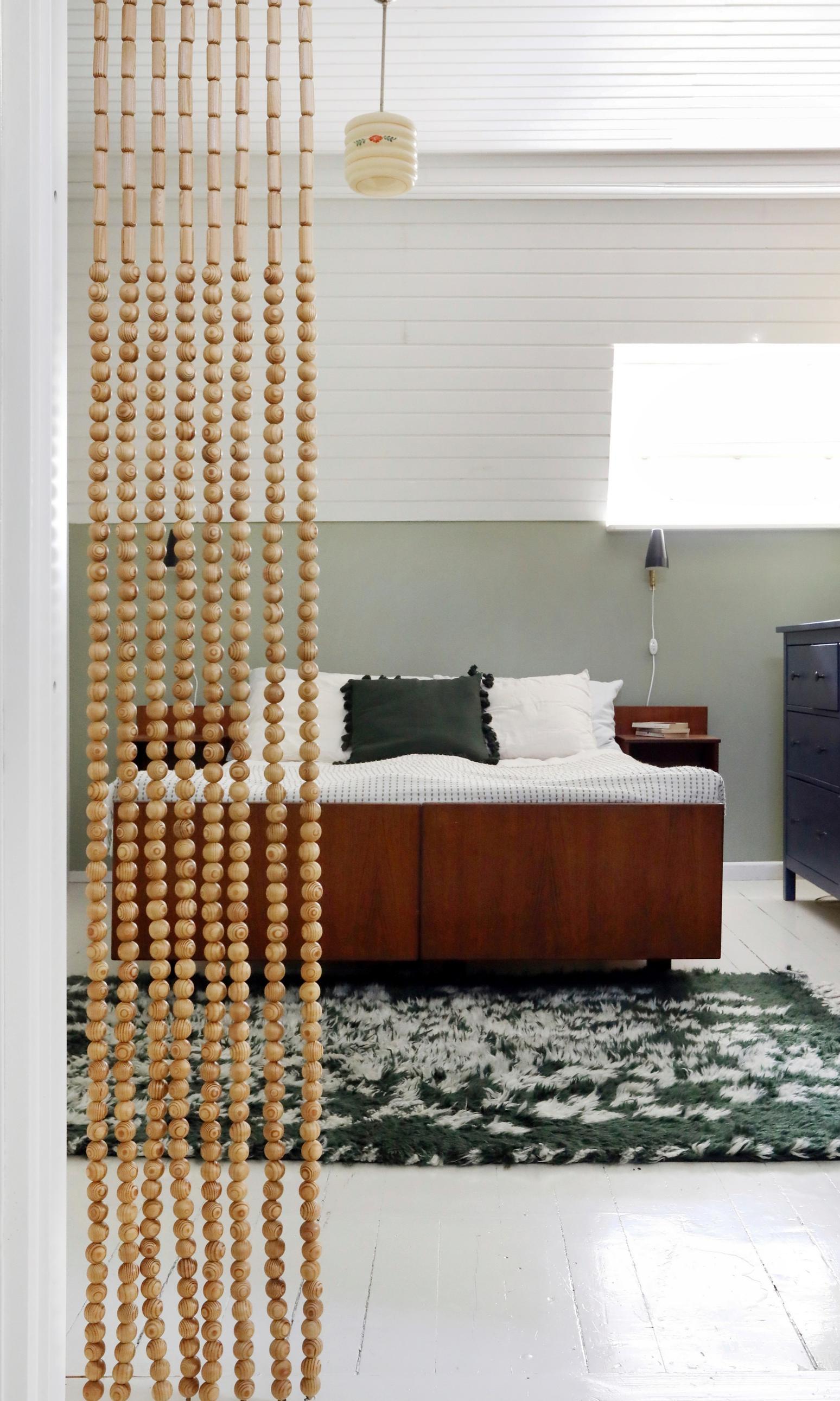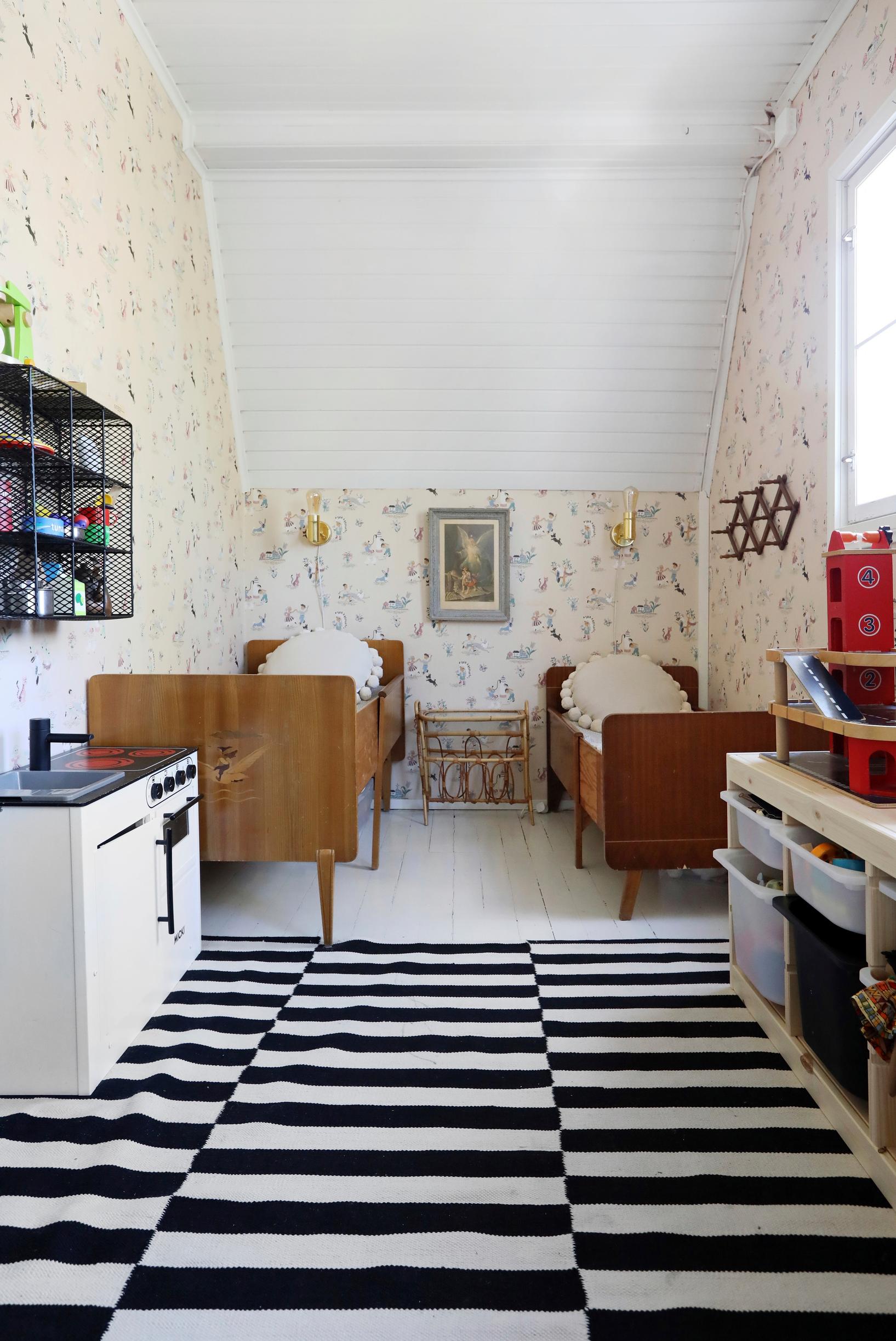 – Meillä ei juuri ole uutena hankittuja huonekaluja, sillä hieman elähtänyt sopii lapsiperheeseen. Lapset hyppivät sohvilla, ja vanha Aarikan oviverho toimii liaanina. Tämä on meidän kaikkien koti, ja elämisen jäljet saavat näkyä, Linda ja Mikko kertovat.