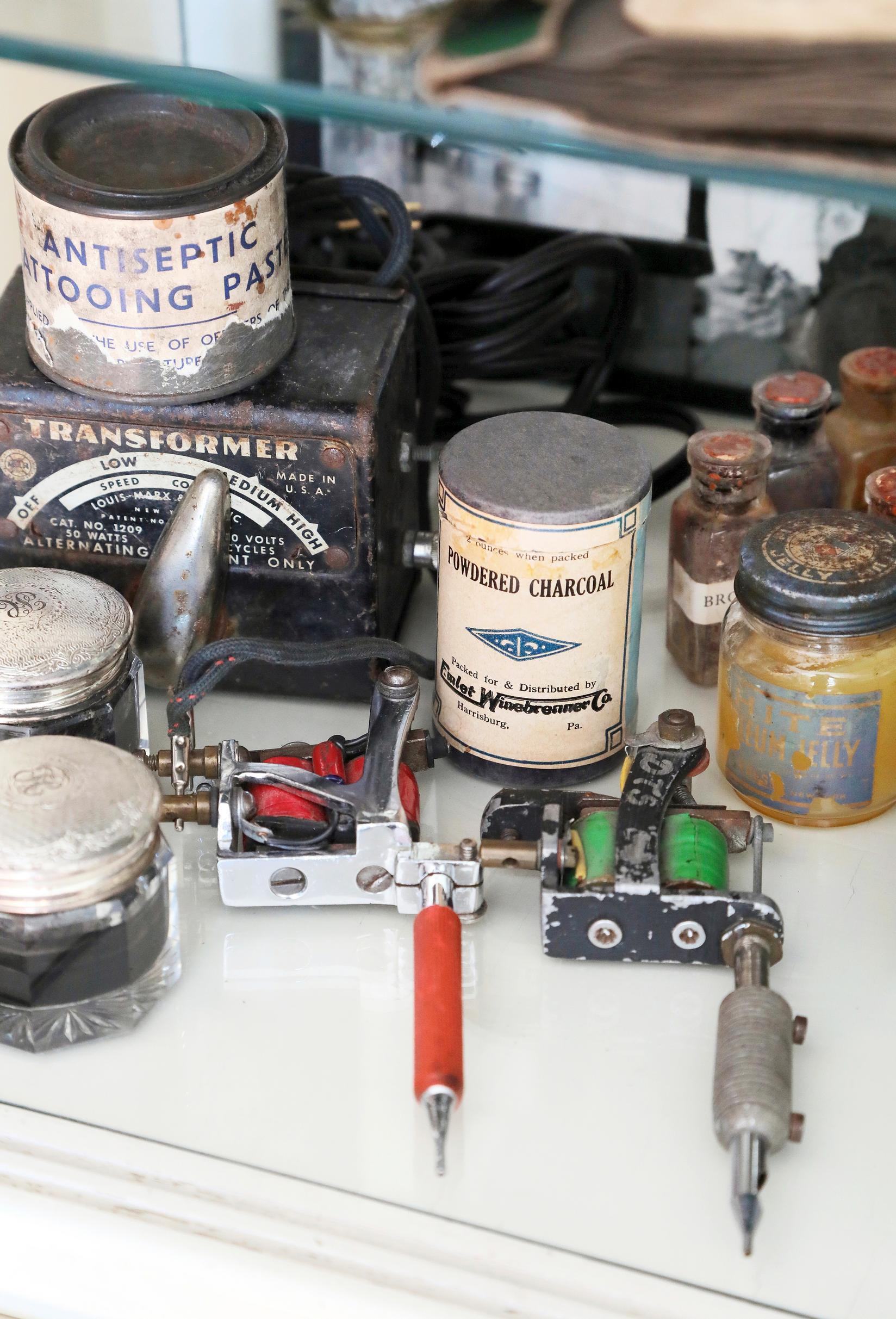 Laivoja, ankkureita, vähäpukeisia neitoja – Helseniusten olohuoneen seinät ovat täynnä tatuointimalleja eli flash-arkkeja, joista merimiehet ovat aikoinaan valinneet iholleen päätyvät kuvat. Mikko on merimiestatuointikeräilijä ja -kirjailija, joka julkaisi viime vuonna yhdessä Jari Ruotsalaisen kanssa aiheesta Merimiestatuoinnit-tietokirjan. Suuri osa kirjan kuvituksesta on esillä olohuoneessa. Vitriinissä on tatuointitarvikkeita ja harvinaisempia kuvia.