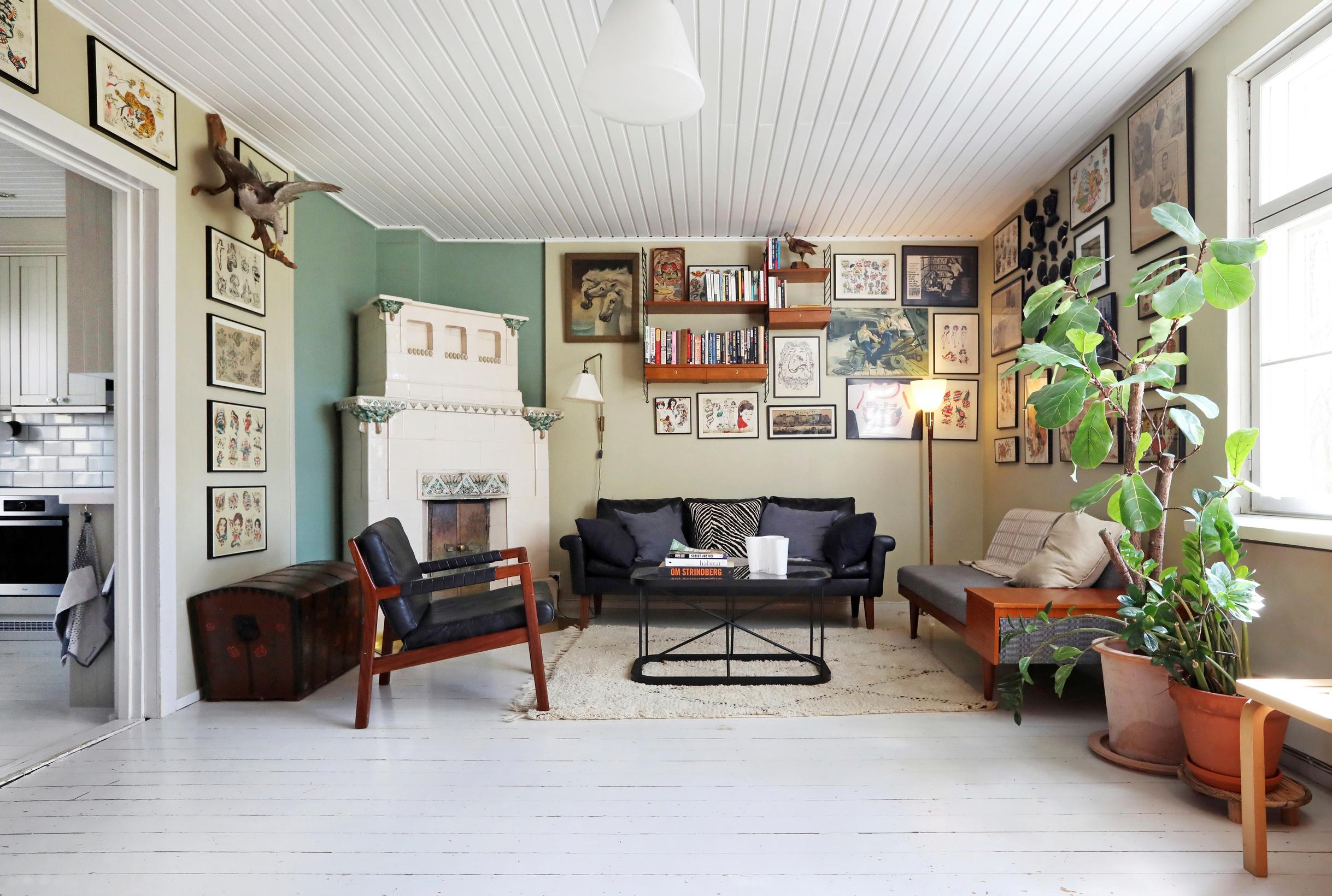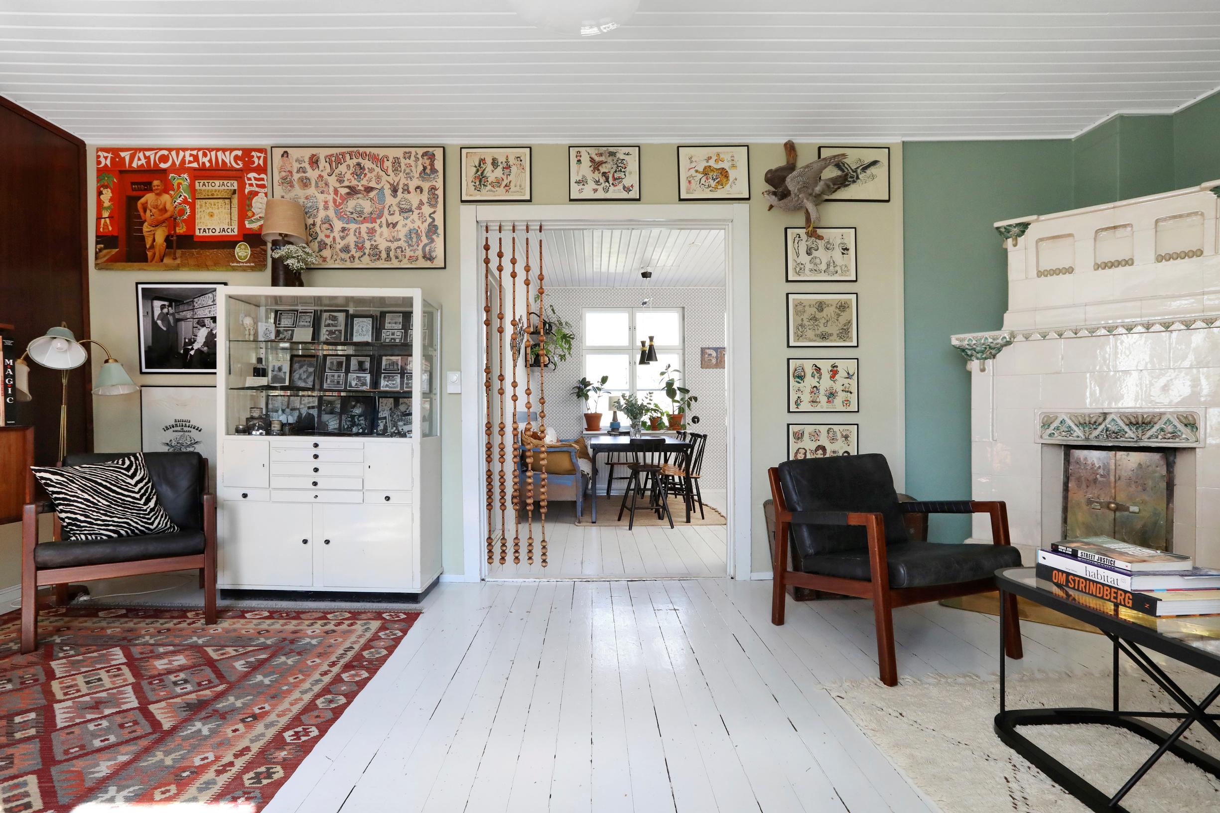 Tatuointitaidetta ja vintagelöytöjä! Keräilijäperheen satavuotiaan puutalon sisustuksen hallittu runsaus ihastuttaa – ”Elämisen jäljet saavat näkyä”