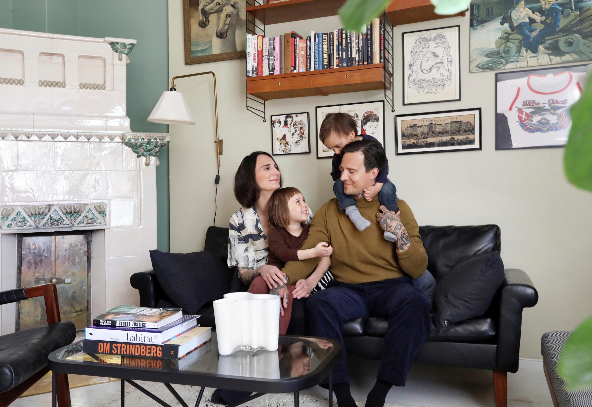 Linda ja Mikko Helsenius laittavat kotiaan Helsingin Puu-Käpylässä lasten ehdoilla, satavuotiasta taloa kunnioittaen. Kahden keräilijätyypin sisustus ei ole vaatinut kompromisseja, sillä sekä tatuointitaiteelle että keramiikalle löytyy paikkansa.