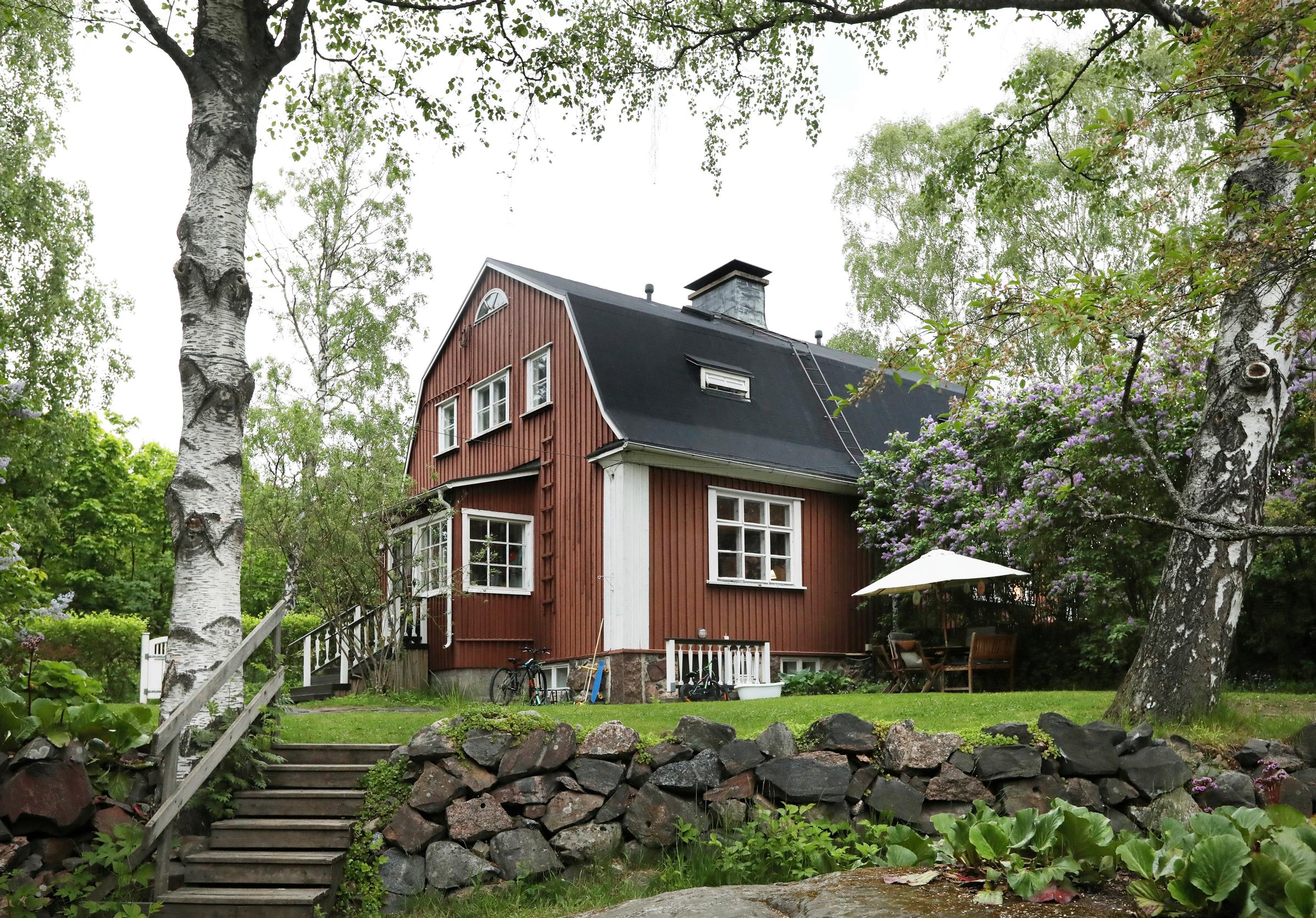 Talossa pyörii usein koko joukko lasten kavereita. Helseniuksille houkuttelee paitsi trampoliini myös matala kynnys vieraille. Piha on helsinkiläisittäin hulppean kokoinen.