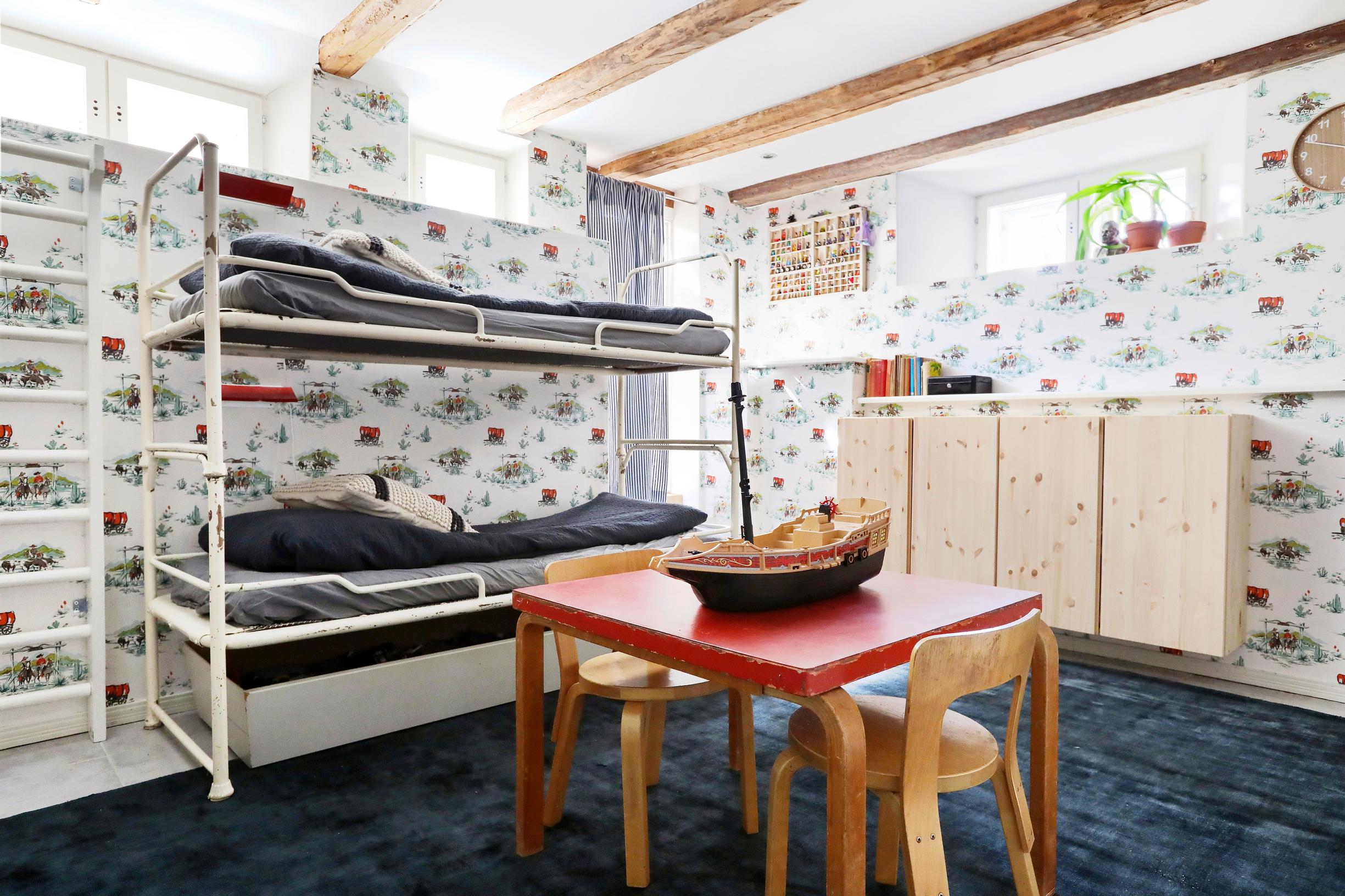 Kun astuu tummanpunaiseen puutaloon, katse hakeutuu heti vintagehuonekaluihin ja kehystettyihin tatuointimalleihin. Ensi silmäyksellä mikään sisustuksessa ei kieli, että talossa asuu nelilapsinen perhe. Linda ja Mikko Helseniuksen isoimmat lapset ovat menoissaan, mutta kuopus, kaksivuotias Ebbe, vetelee päiväunia yläkerrassa. Kun tarkemmin katsoo, niin ehkä lattialankuissa saattaa tosiaan olla vähän naarmuja.