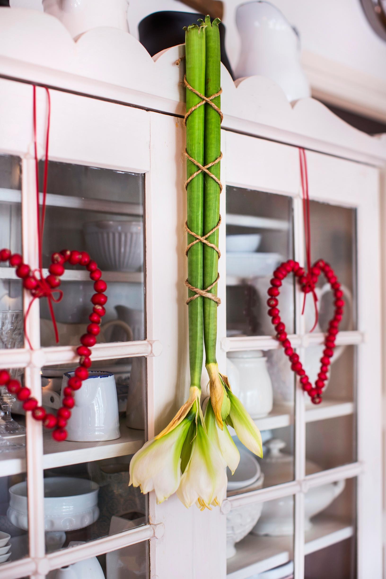 Ritarinkukat on vaihteeksi sidottu narulla nippuun ja laitettu roikkumaan vitriinikaapin edustalle.