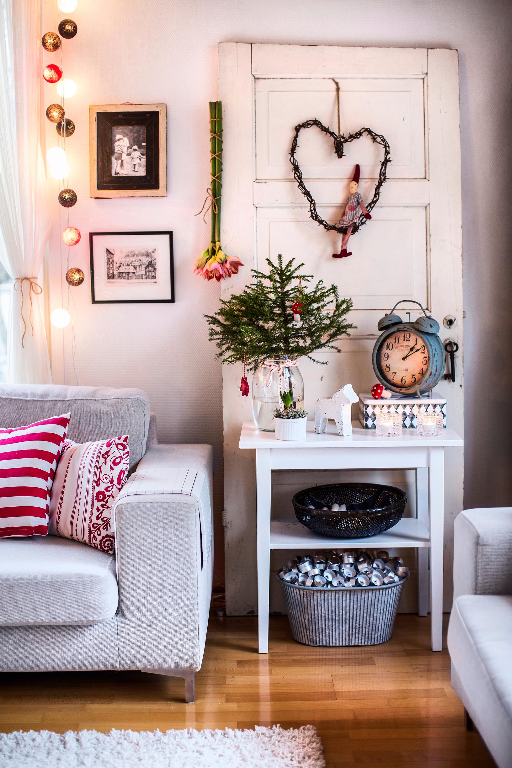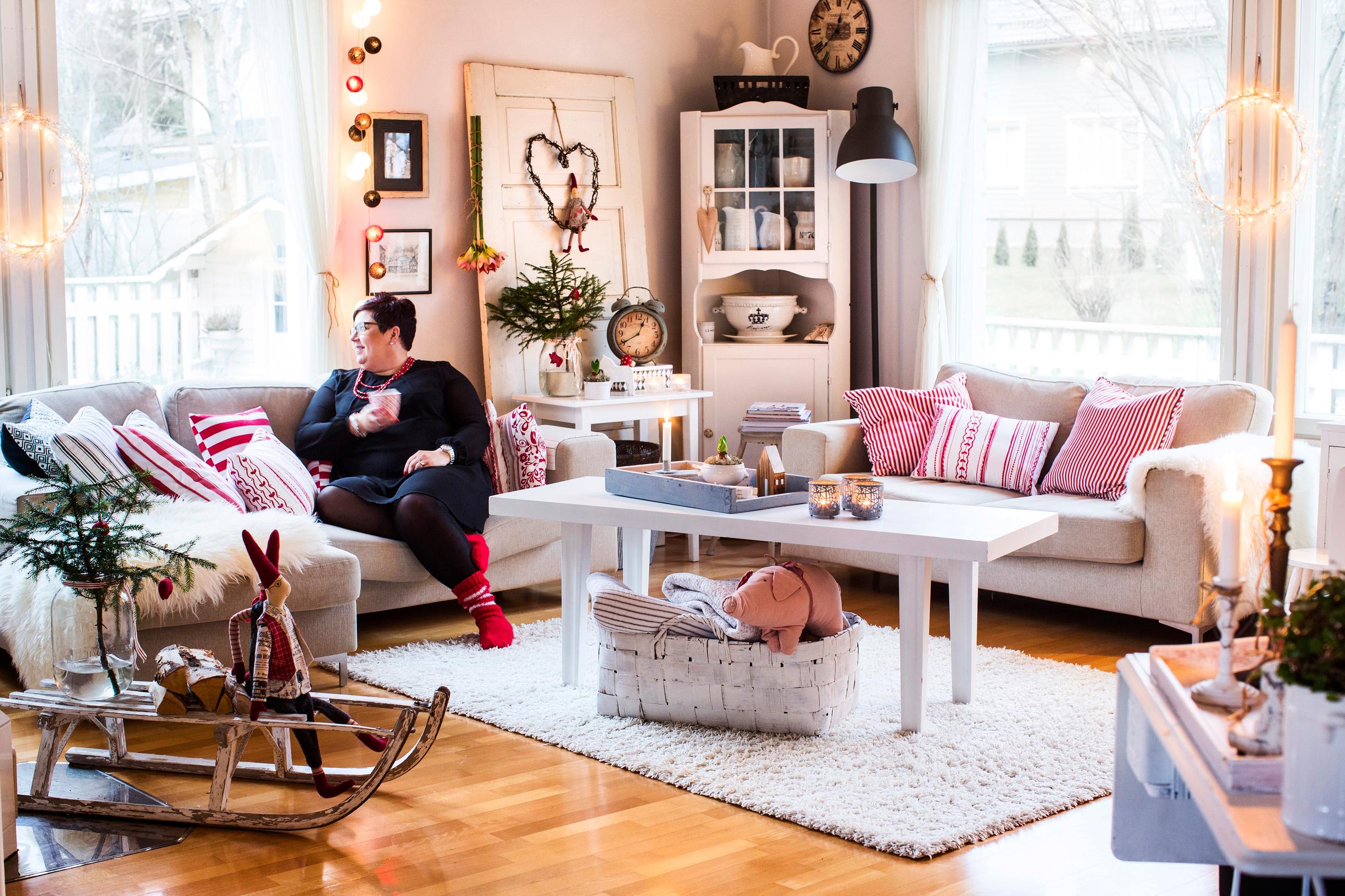 Olohuoneen jouluilme syntyy Ikean punavalkoisilla tyynyillä. Sekä sohvapöytä että kulmakaappi ovat kierrätyslöytöjä.