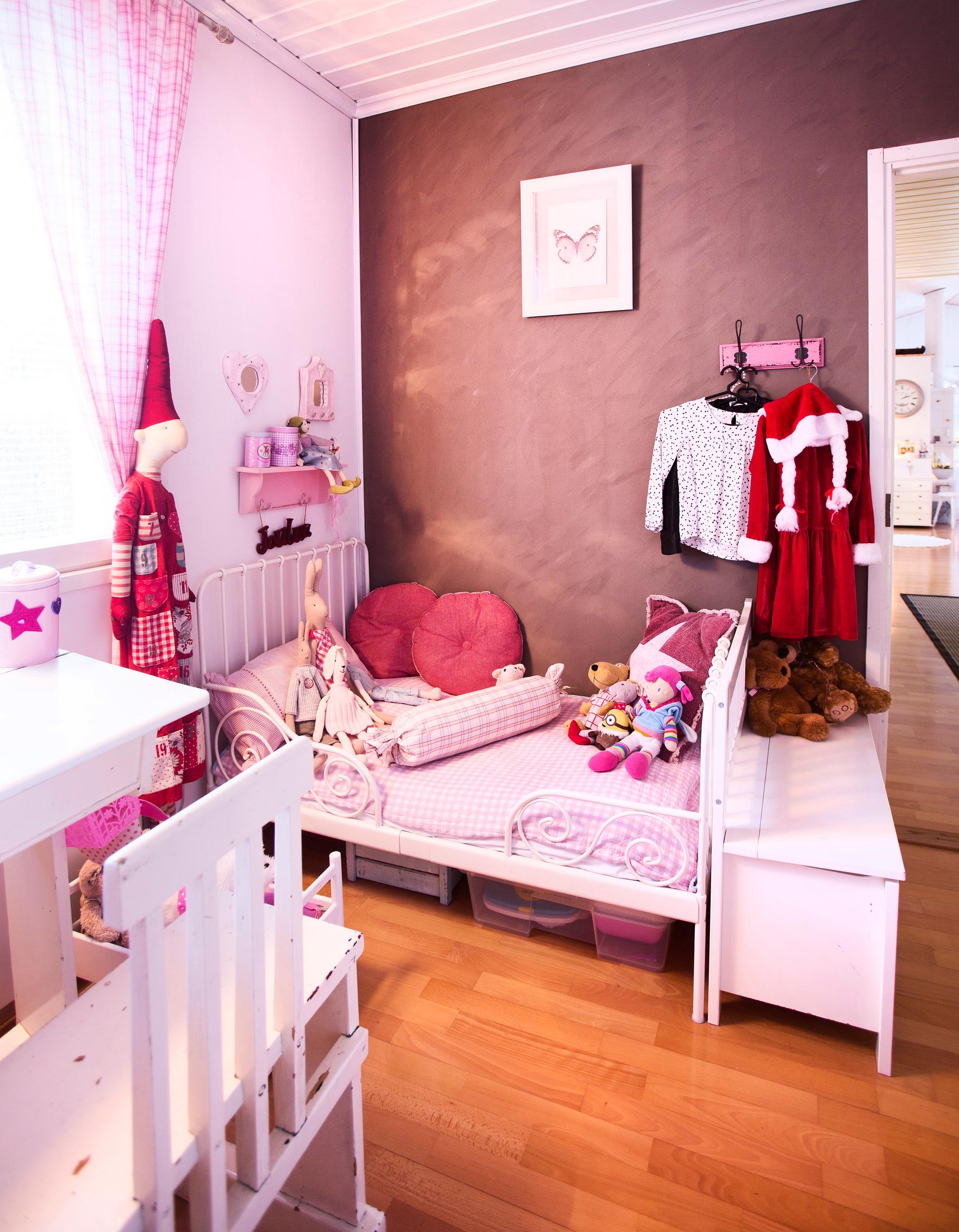 Nella nukkuu Ikean rautasängyssä. Äiti auttaa häntä aamuisin petauksessa. Unikaverit odottelevat jo iltaa.