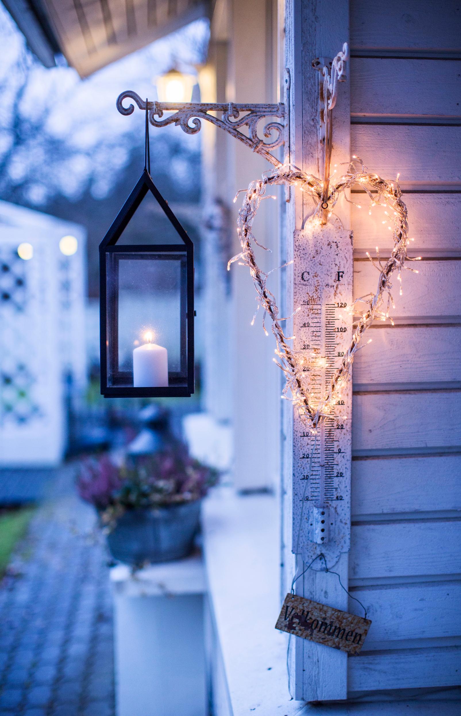 Tervetuloa meille! Kynttilälyhdyt ja valosarjat tekevät sisääntulosta kutsuvan.