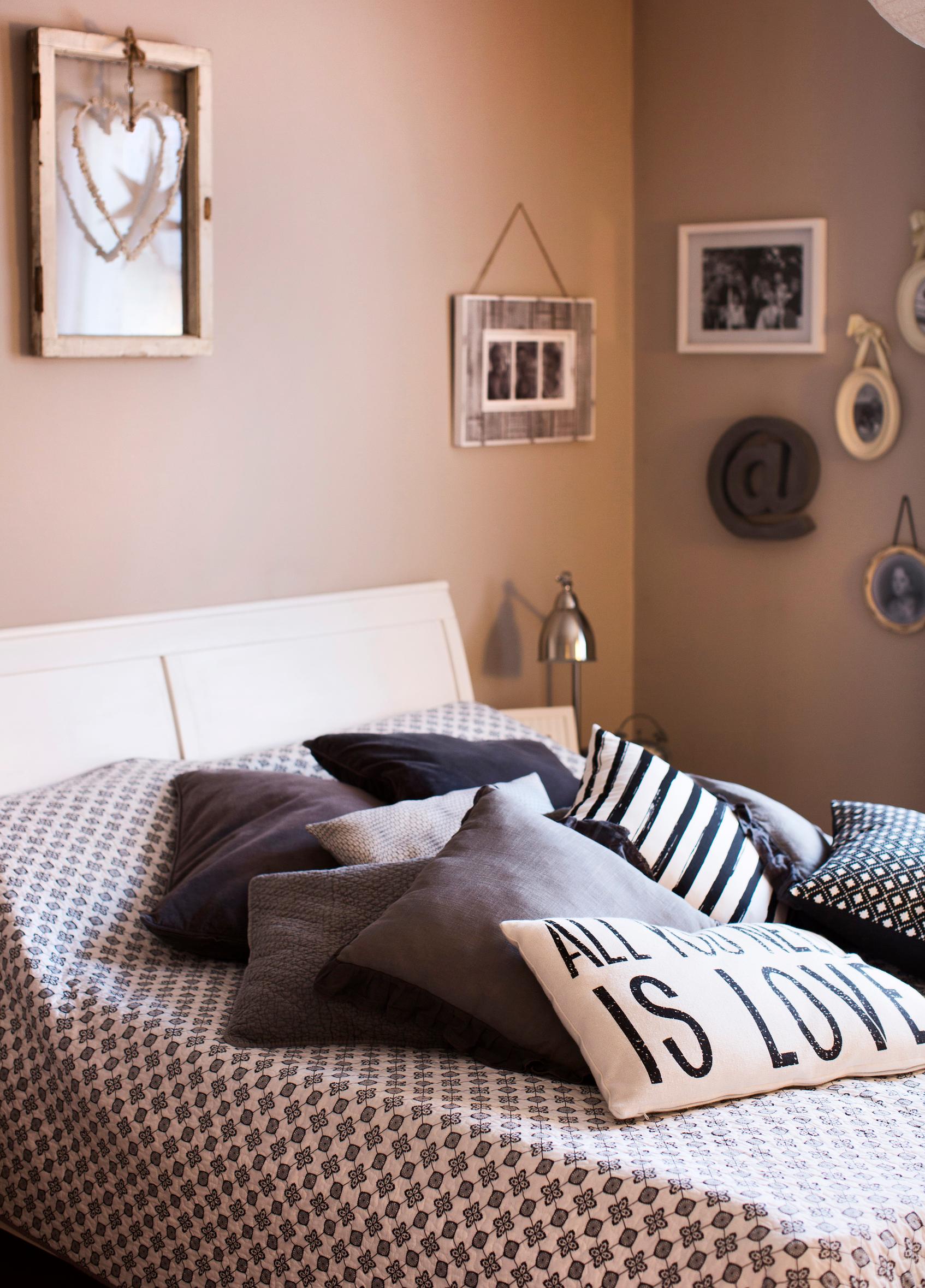 Tässä perheessä tykätään tyynyistä! Vanhempien parisängyn päiväpeite on Hobby Hallista.