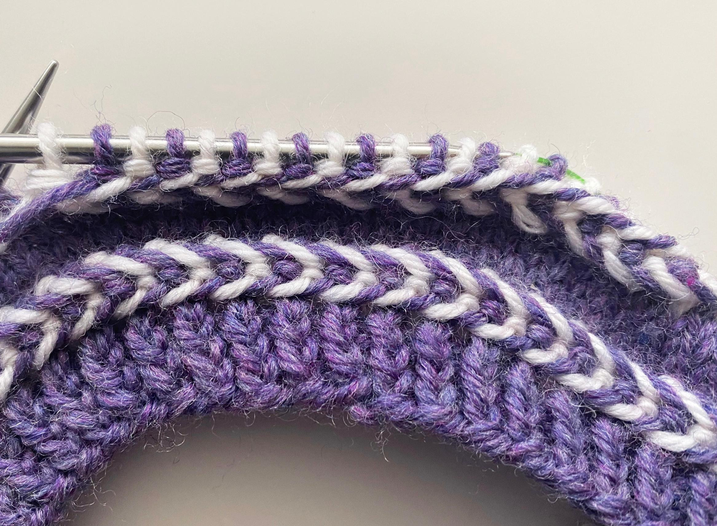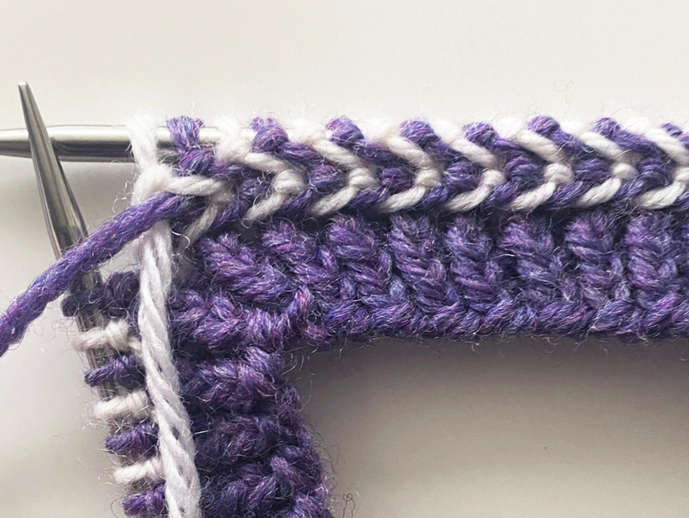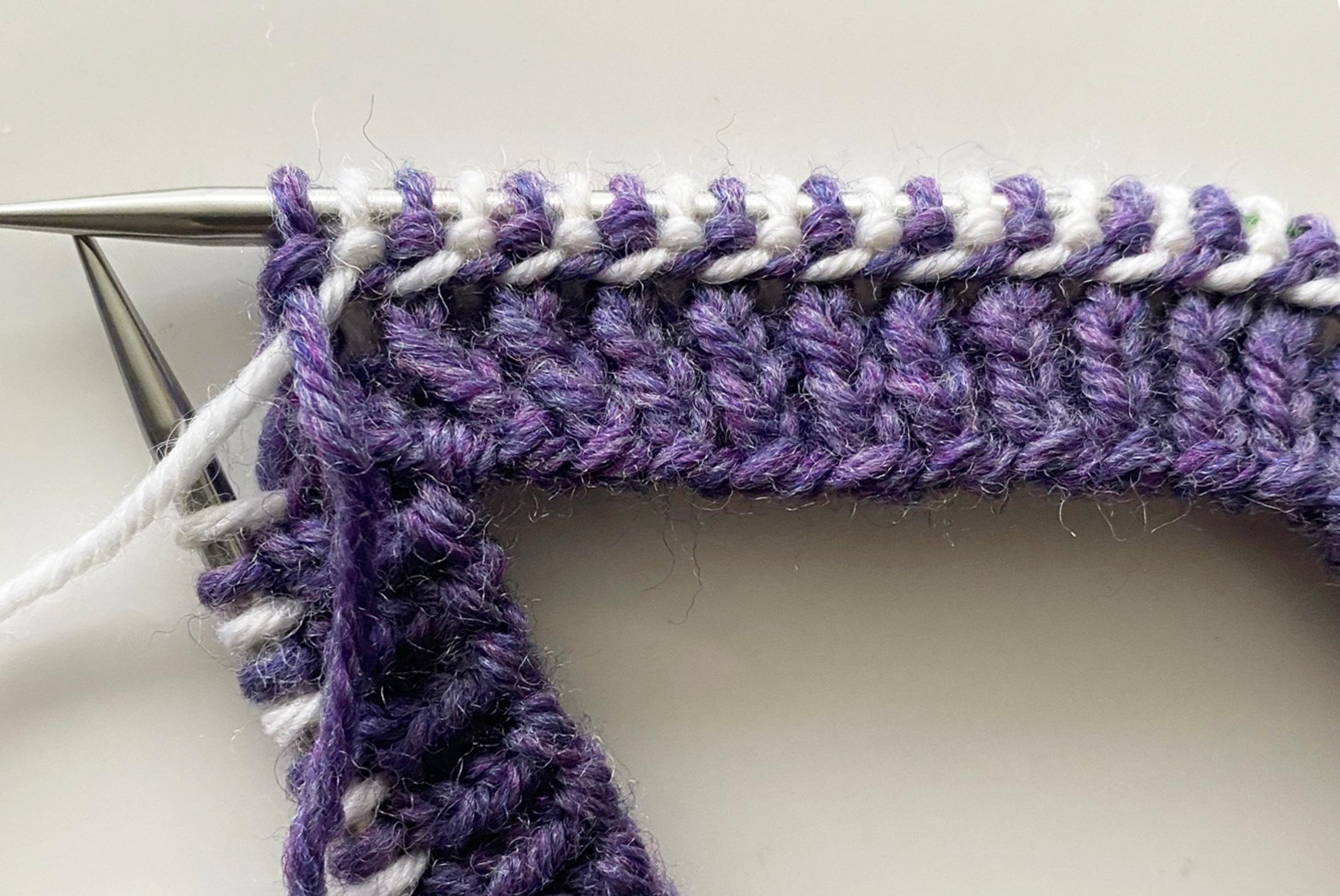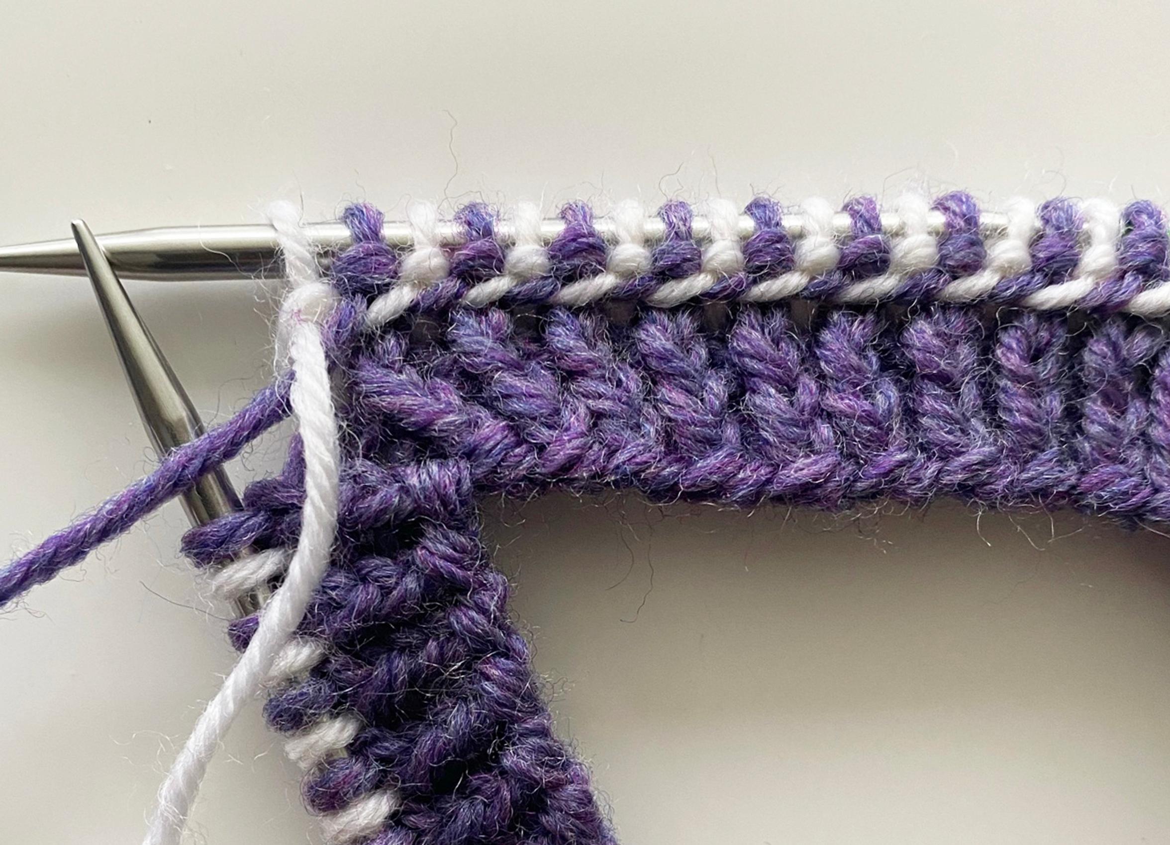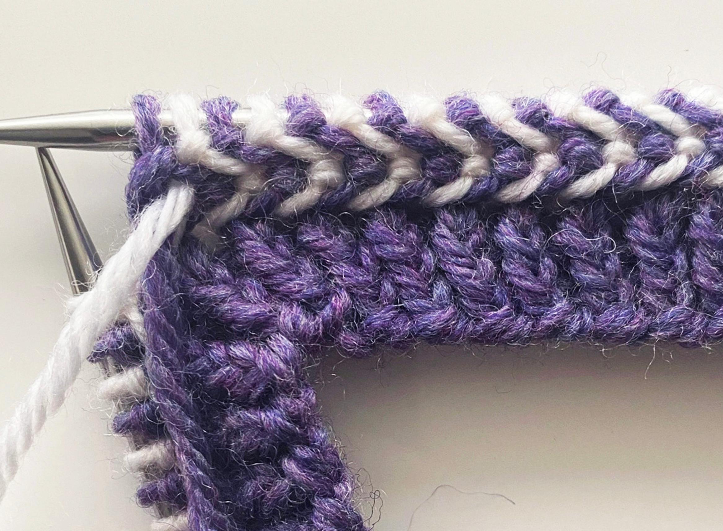 1. krs: *Neulo 1 o päävärillä (tässä liila), neulo 1 o kontrastivärillä (tässä valkoinen)*, toista *–* krs:n loppuun.