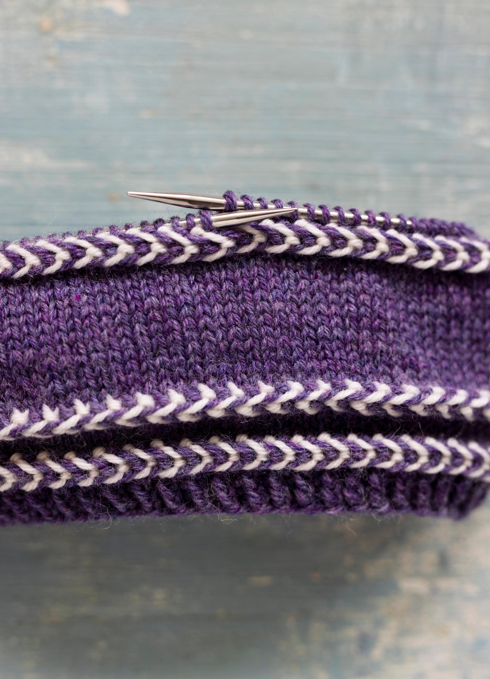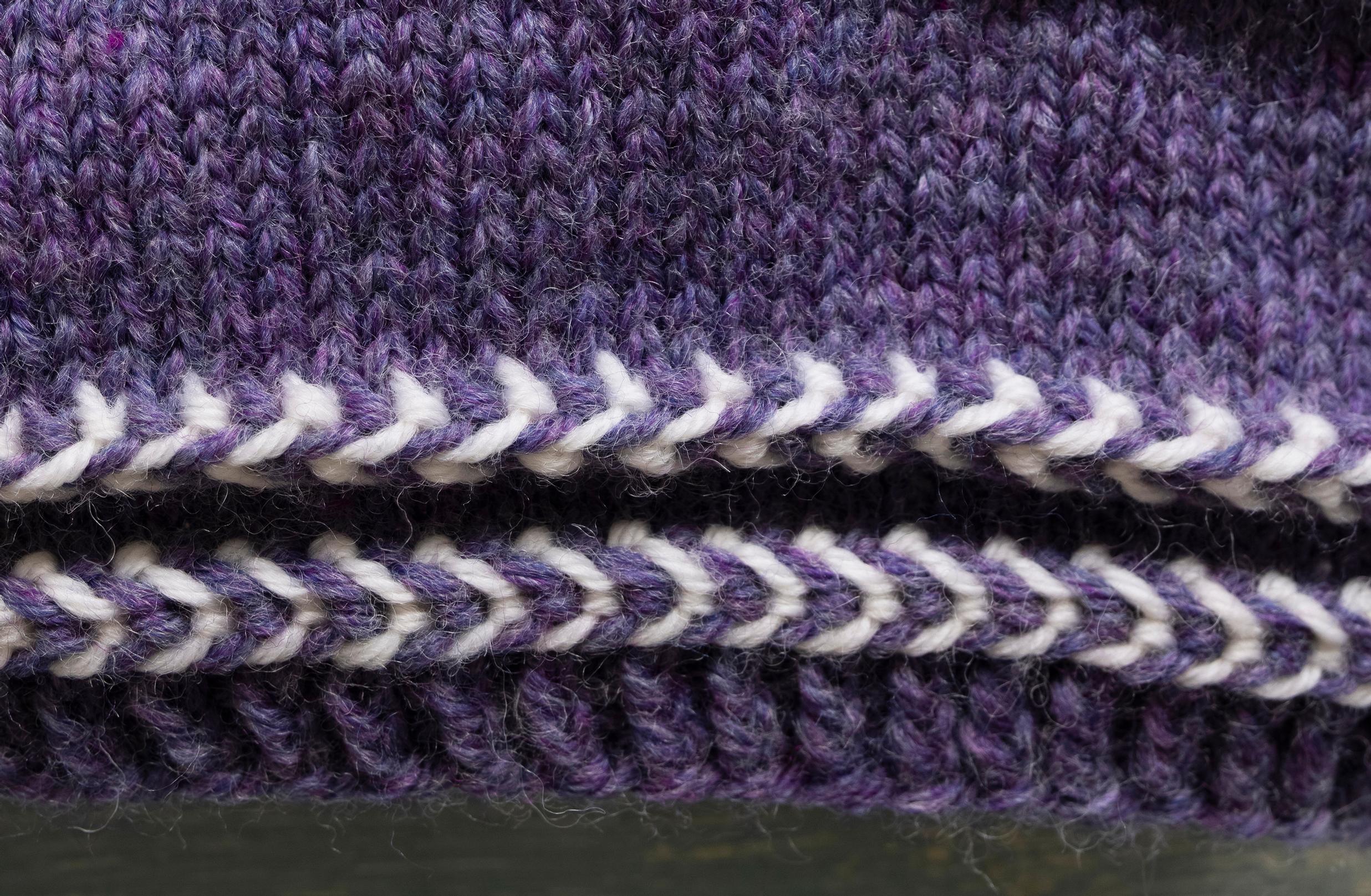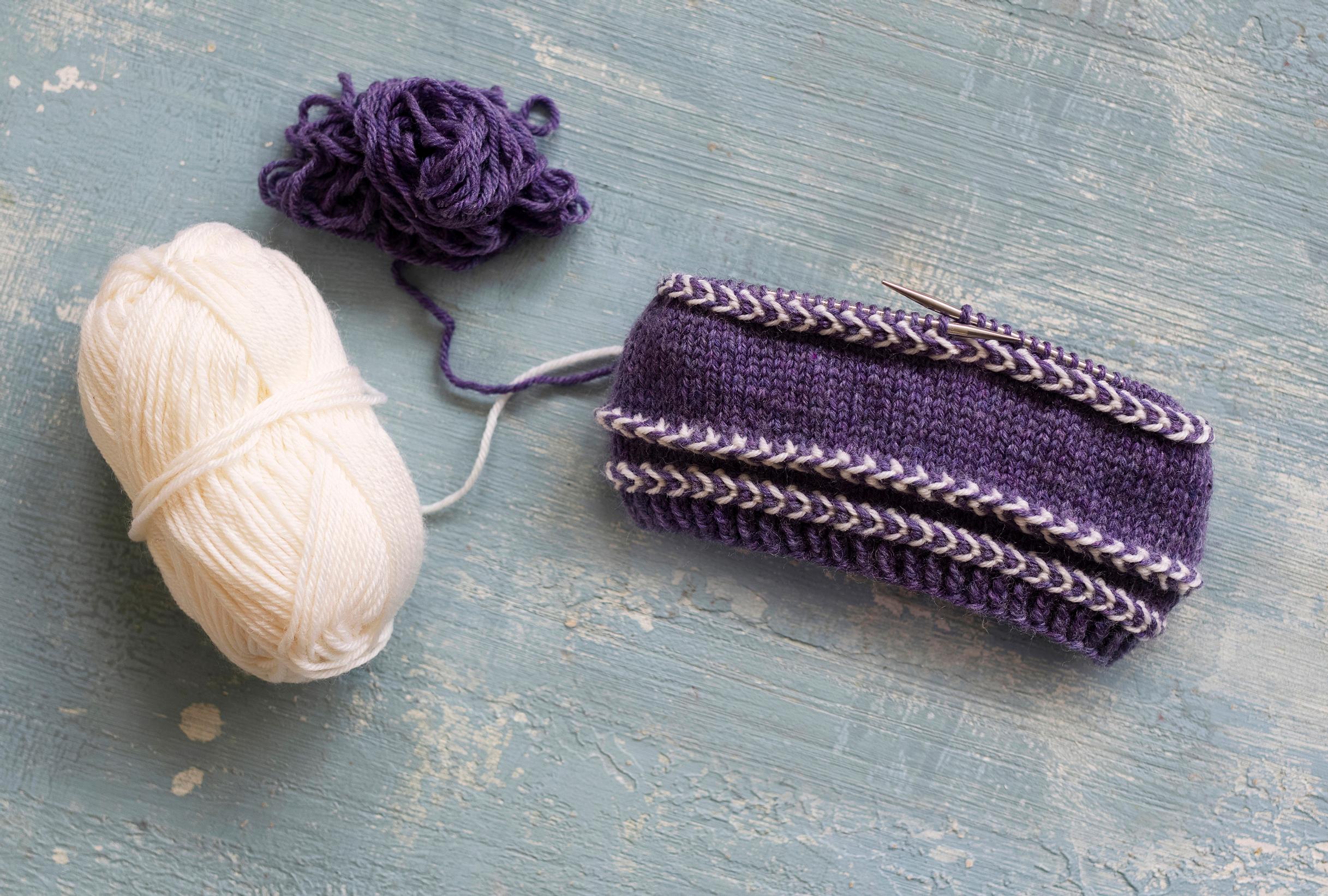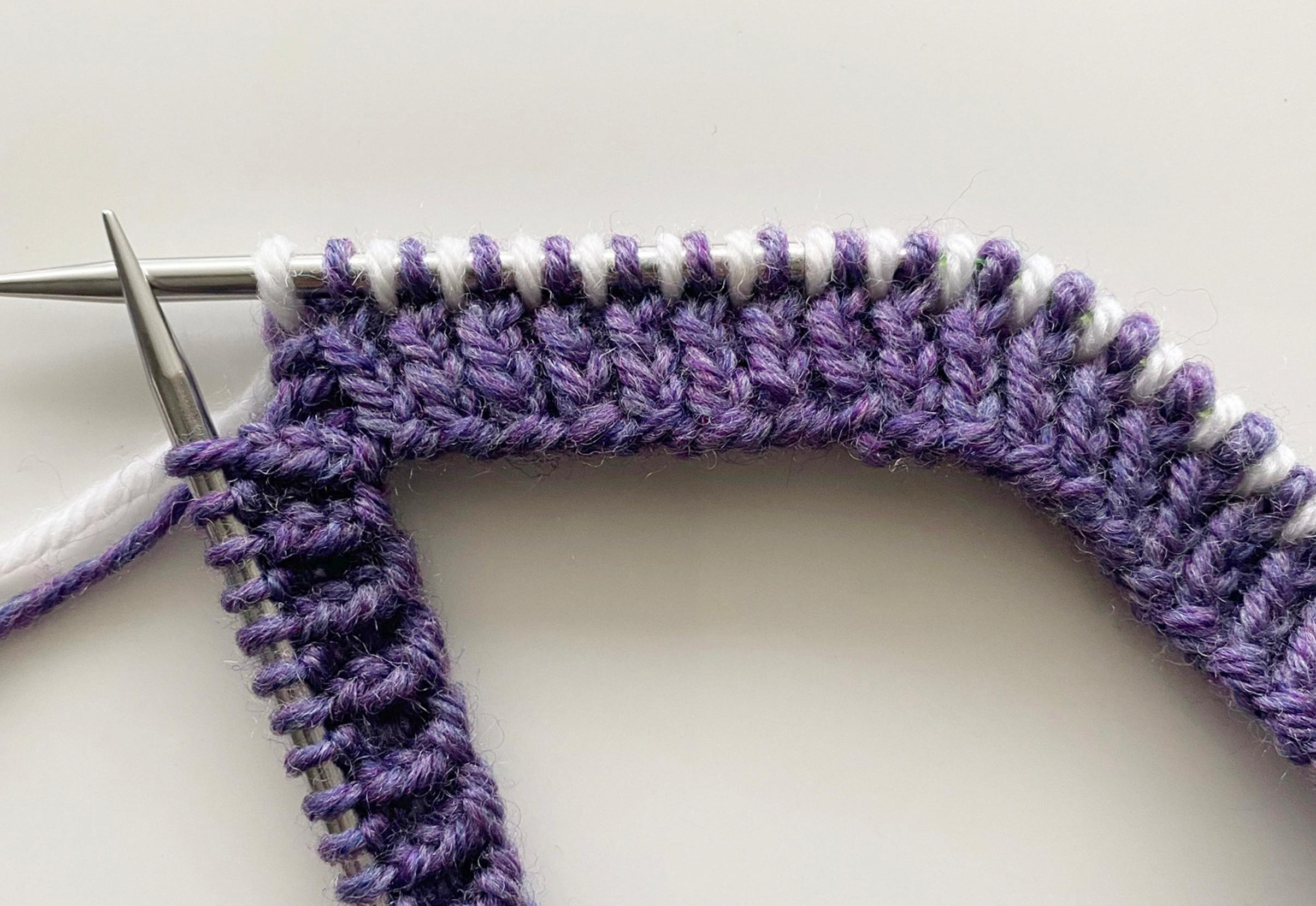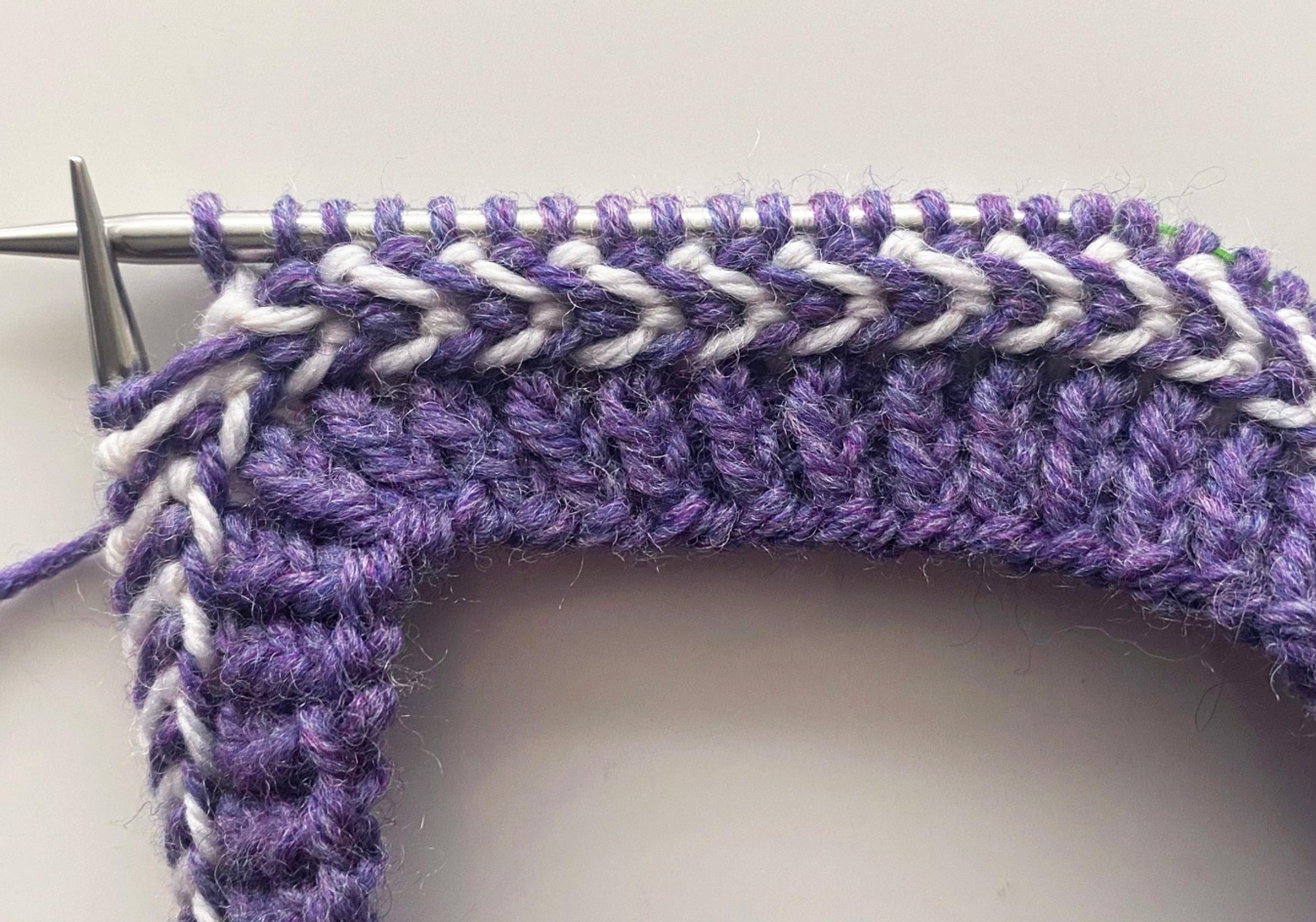 1. krs: *Neulo 1 o päävärillä (tässä liila), neulo 1 o kontrastivärillä (tässä valkoinen)*, toista *–* krs:n loppuun.