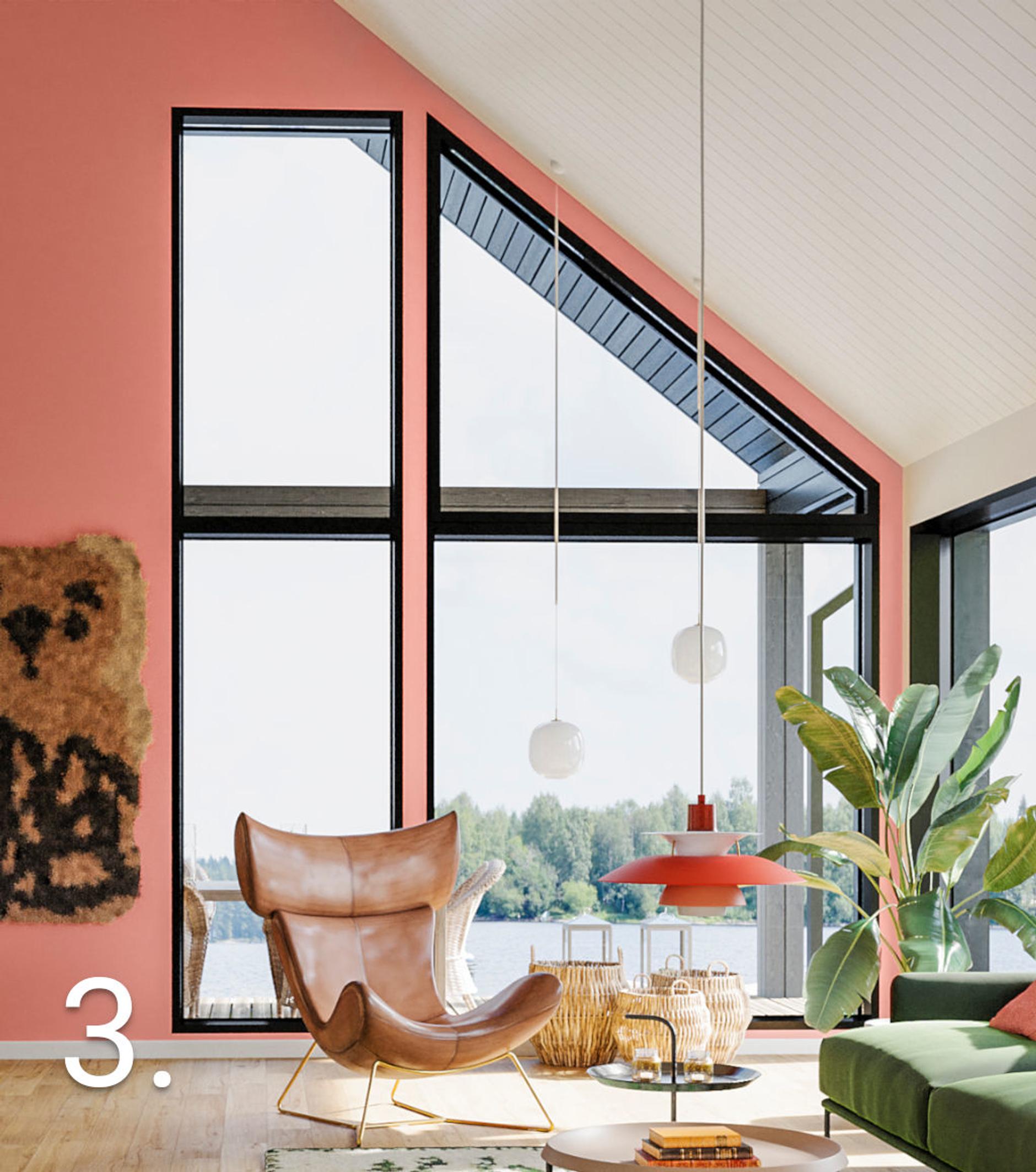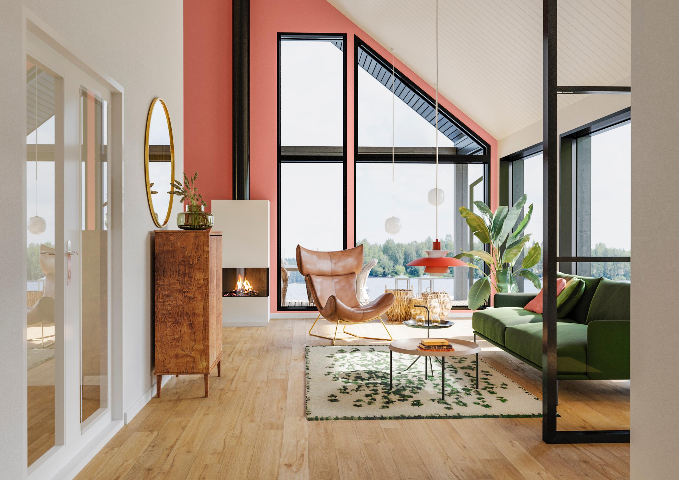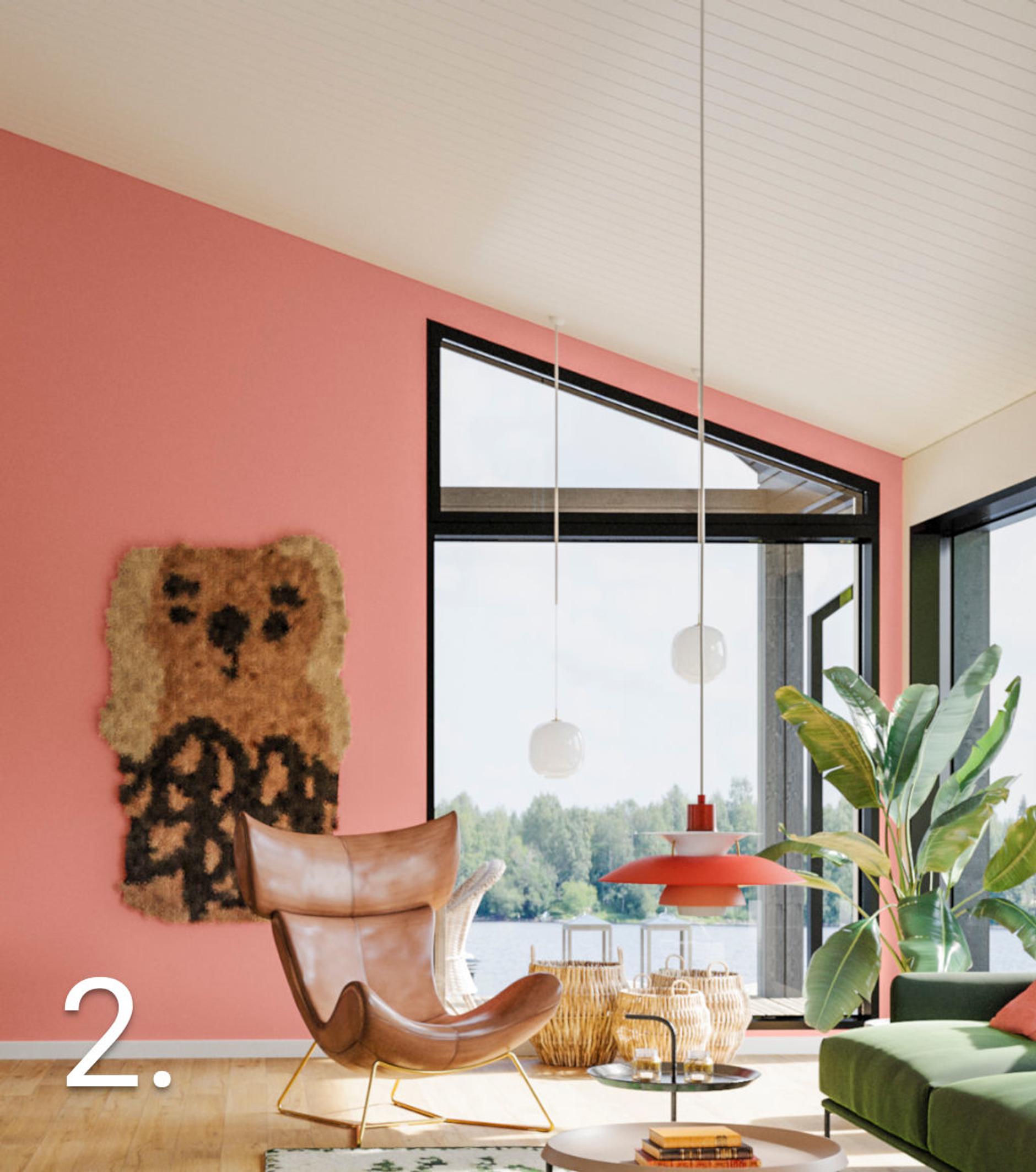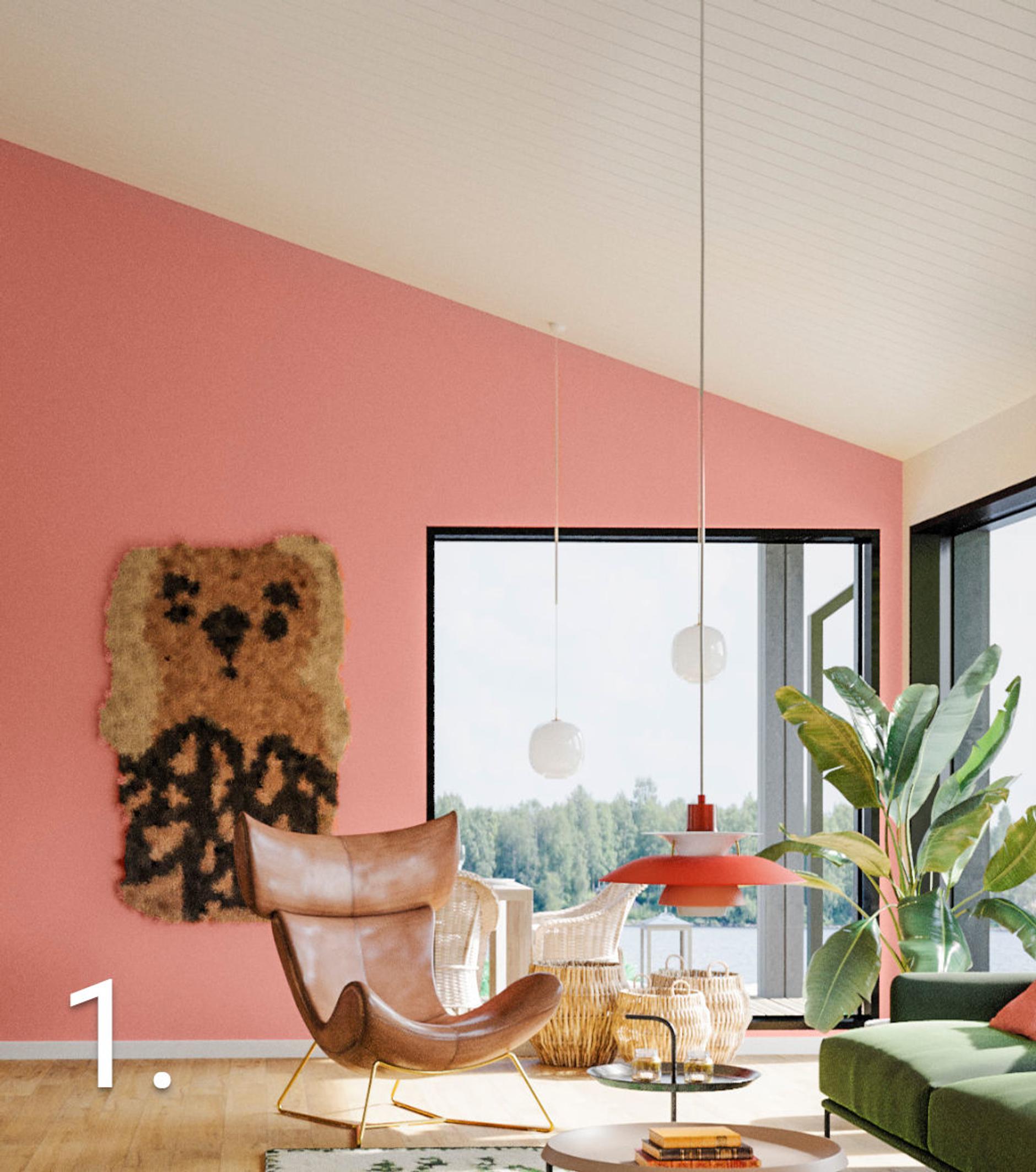 Olohuoneessa kaiken kruunu on valtavan iso, Tikkurilan vuoden 2019 värillä ”Flamingo” maalattu seinä. Lauran mukaan se on loistava pari Adean vihreän sohvan, vanhan puun ja vähän erisävyisen punaisen kanssa.