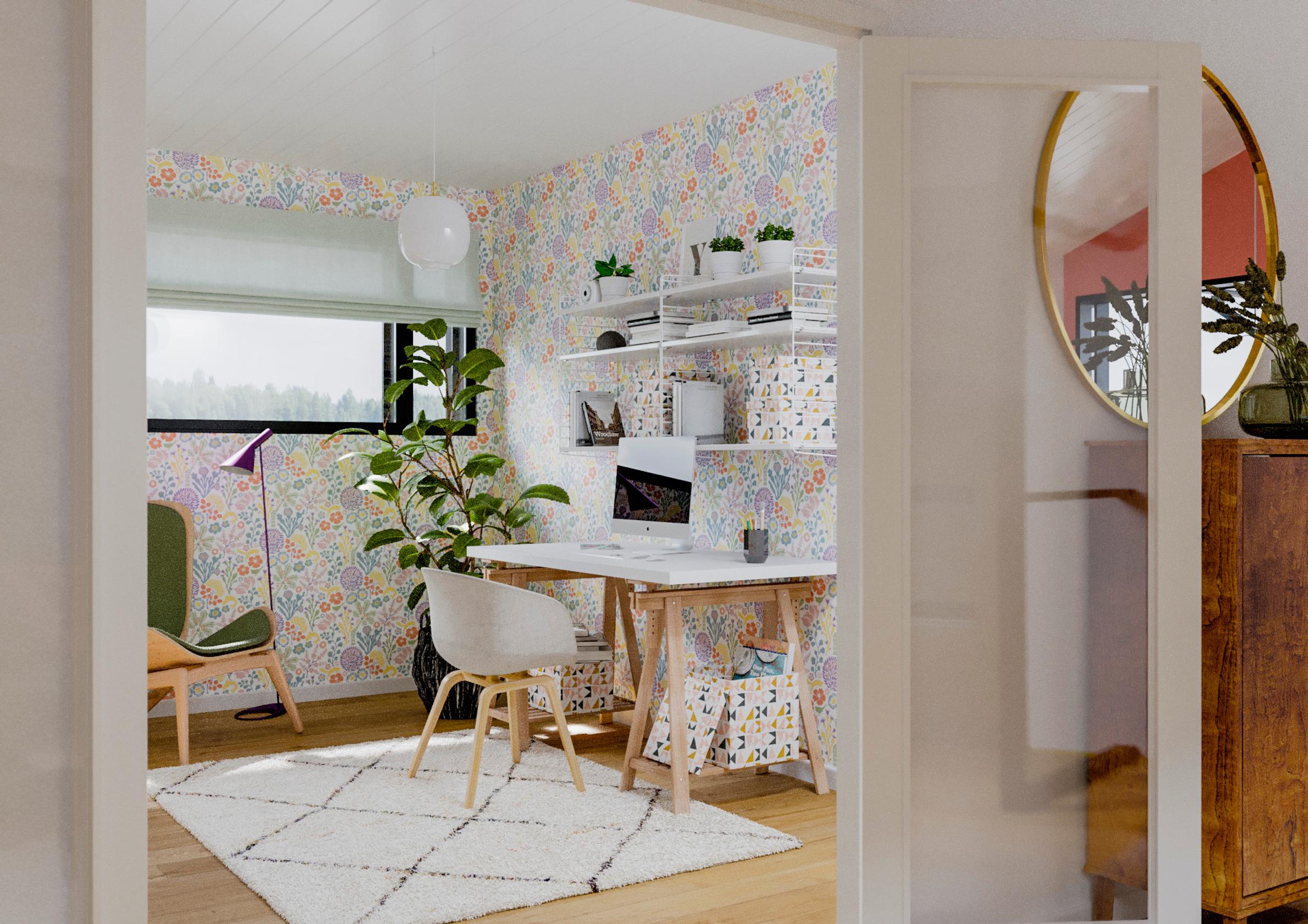 Laura tunnustautuu tapettifriikiksi. Hänen suunnittelemassaan työhuoneessa on ruotsalaisen Hanna Werningin suloinen tapetti, joka on ollut yksi Lauran suosikeista jo vuosia.