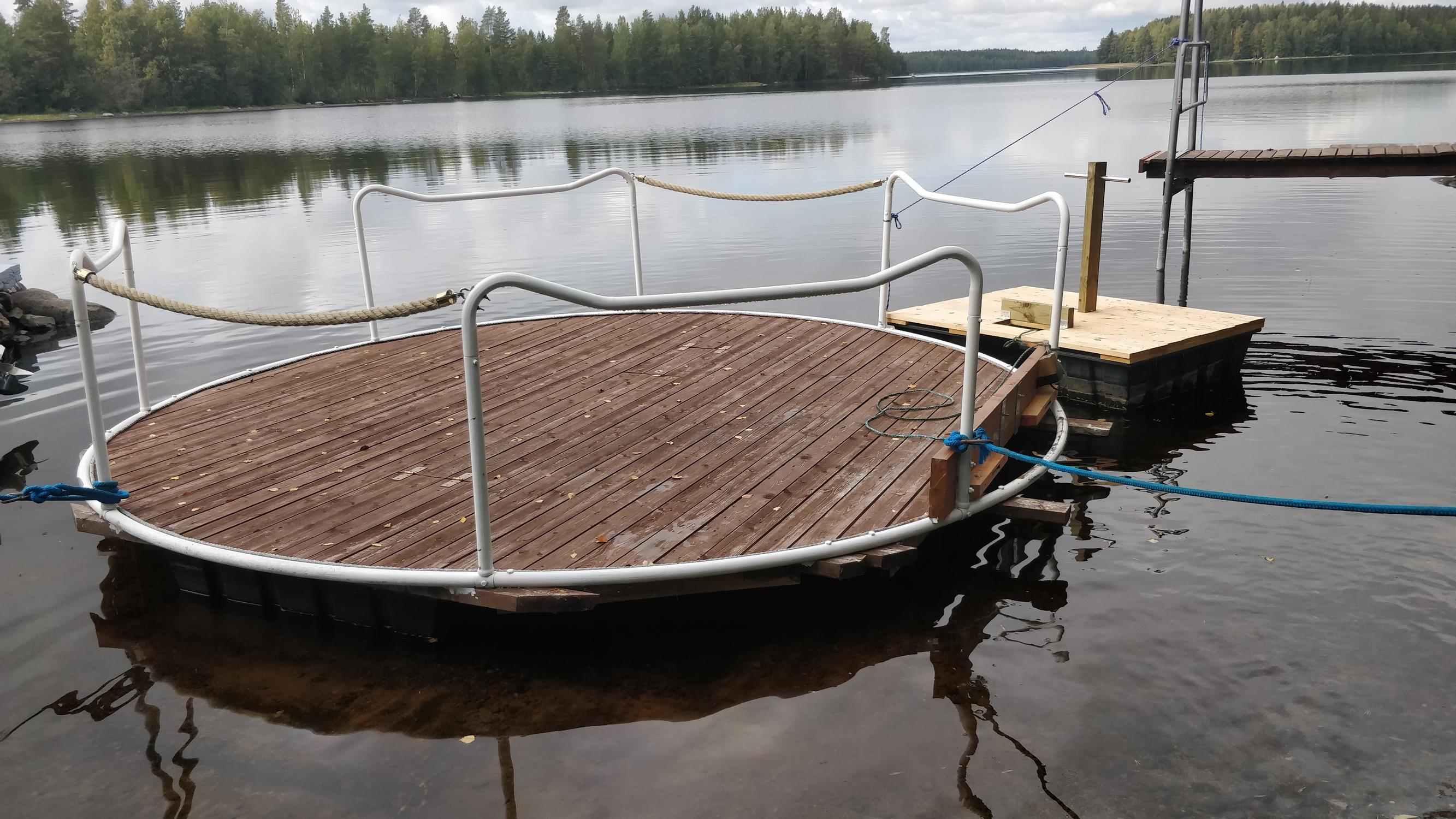 Lautan rakenne on yksinkertainen: metallinen pyöreä runko, jonka alle Kimmo teki laudasta kehikon, johon pontoonit pultattiin kiinni. Lautta päällystettiin laudoilla.