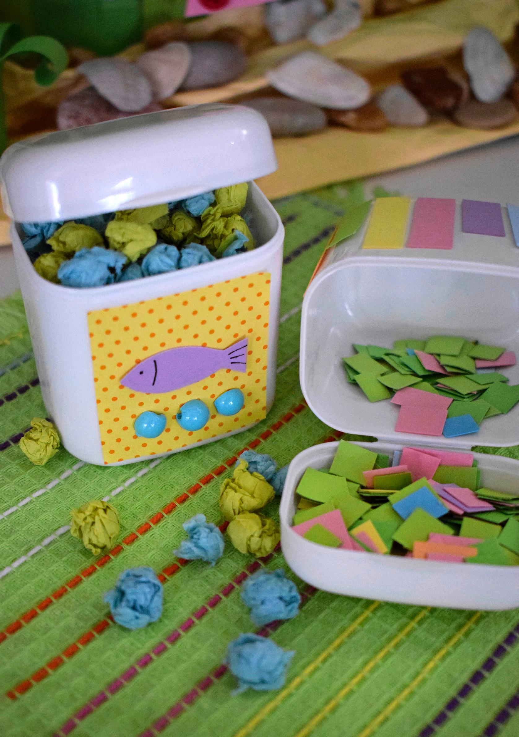 6. Hymyilevä meduusa, sininen timanttikala, pinkki nappikala, keltainen lankakala, sinivihreä kuviokala ja liilat minikalat ahmivat mielellään värikästä leikkiruokaa. Tee sitä paperisilpusta ja pakkaa vaikka pastillirasiaan.