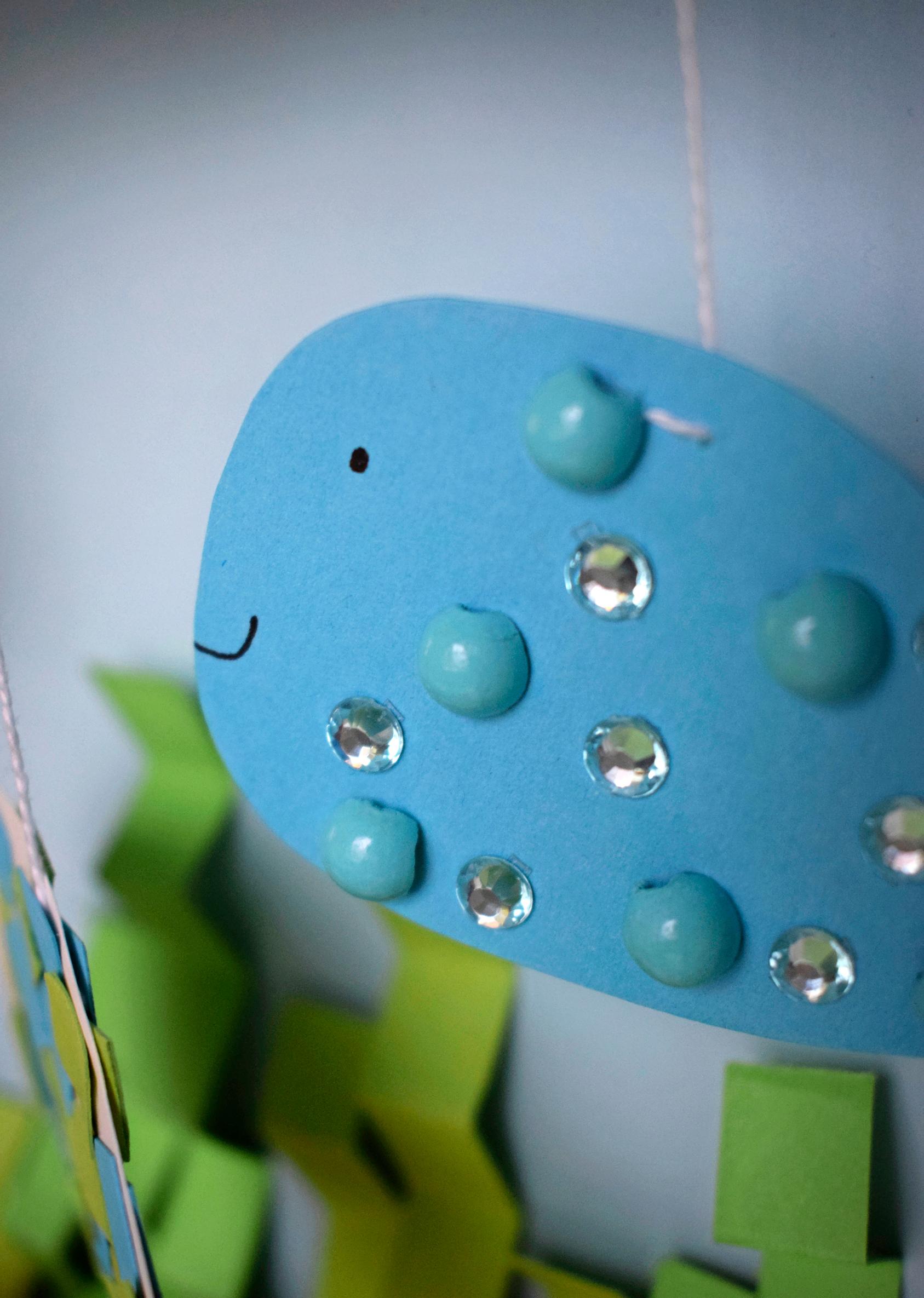 5. Leikkaa kartongeista kaloja. Koristele kalat molemmin puolin liimaamalla nappeja, kartonginpaloja, puolitettuja puuhelmiä tai koristetimantteja, tai vaikka kieputtamalla kalan ympärille villalankaa. Voit koristella kalat myös piirtämällä, värittämällä, maalaamalla tai kollaasitekniikalla. Liimaa tai solmi kaloihin ripustuslangat. Jos haluat liikuteltavia kaloja, vie kalojen langat akvaarion yläreunan raoista reunan ulkopuolelle ja solmi lankojen päät puuhelmiin. Muutoin vie langat neulan avulla yläreunasta läpi ja liimaa tai teippaa niiden päät kattoon.